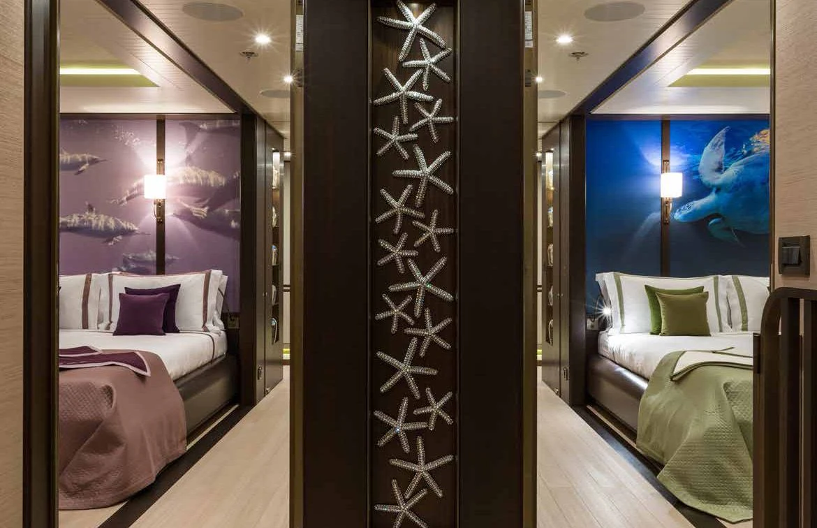 As you enter inside GENE MACHINE, you will be welcomed by interiors that exude opulence and sophistication. Accommodating up to twelve guests within its five lavish cabins, each room showcases meticulous design elements that blend modern aesthetics with timeless elegance perfectly. The master stateroom stands as the epitome of luxury living at sea, offering unrivaled comfort paired with stunning views through large windows that let in an abundance of natural light.