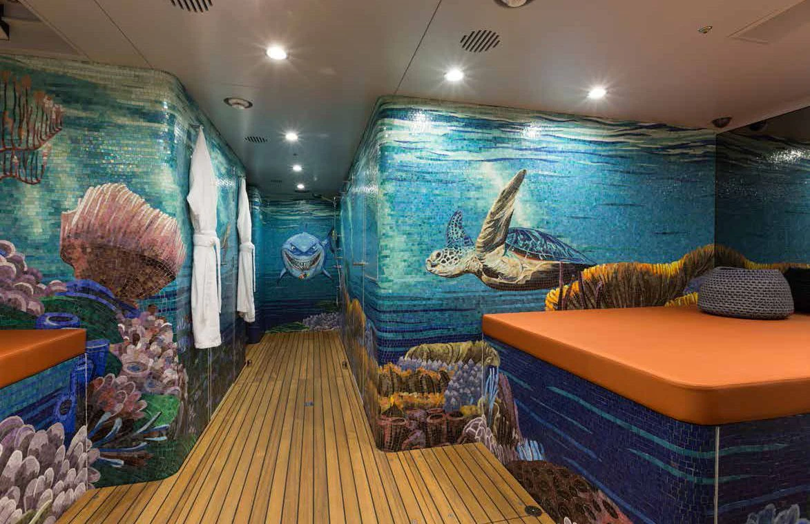 The main salon serves as an inviting social hub where guests can unwind after a day filled with adventure or simply enjoy each other's company over drinks served from the well-stocked bar onboard. For those who prefer more active pursuits indoors, there's also a state-of-the-art gym equipped with top-tier fitness equipment.