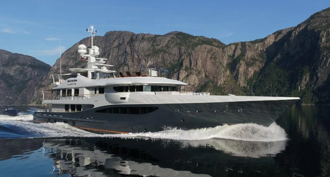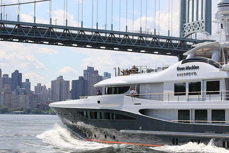 The displacement motor yacht's exterior has been masterfully crafted from steel, offering both durability and elegance. With a cruising speed of 13 knots and capable of reaching up to 15.5 knots, GENE MACHINE combines performance with luxury effortlessly. The yacht's dynamic form allows for smooth sailing across the waters while maintaining an imposing presence that is sure to turn heads at any marina.