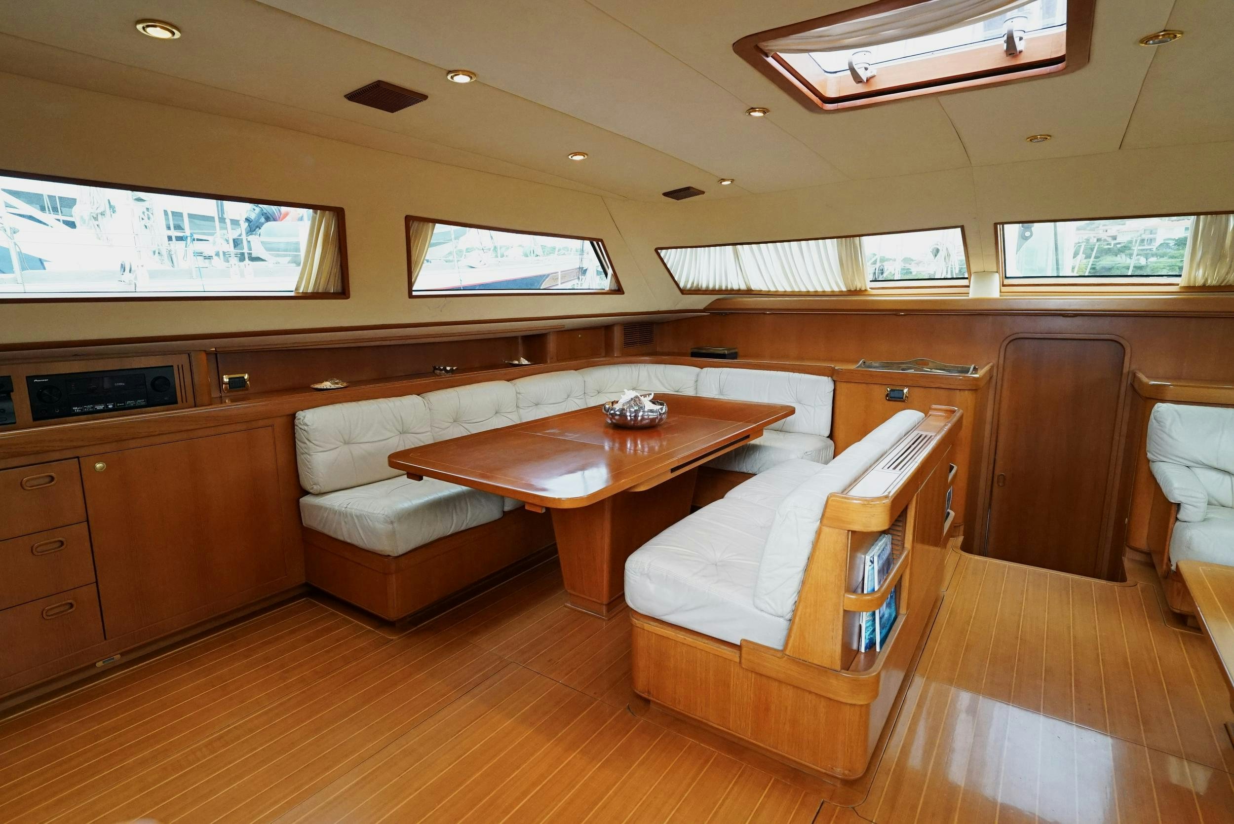 Between 2020 and 2022, the yacht received a major technical refresh, including new paint, new stainless rod rigging, new generator, new electrical upgrades to both 24V DC and 220V AC systems and a modernized navigation suite. Her current electronics package includes B&G H5000 processing, Zeus 8- and 12-inch displays, radar, Garmin AIS, depth sounder and MaxSea software. Interior soft goods were renewed during the same period, keeping the environment fresh without altering the original Wally aesthetic. Previous updates include rigging and sail optimizations for the 2014 regatta and a teak refit. In total, more than €500,000 has been invested in maintaining the performance ethos of the original build.