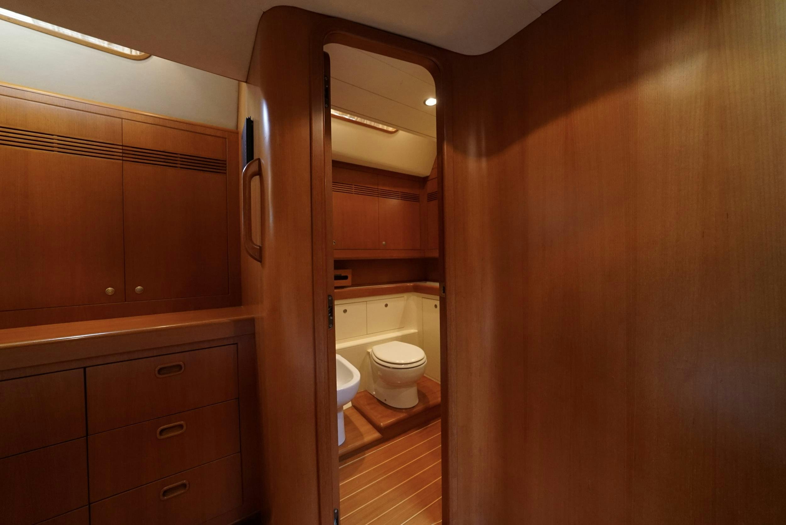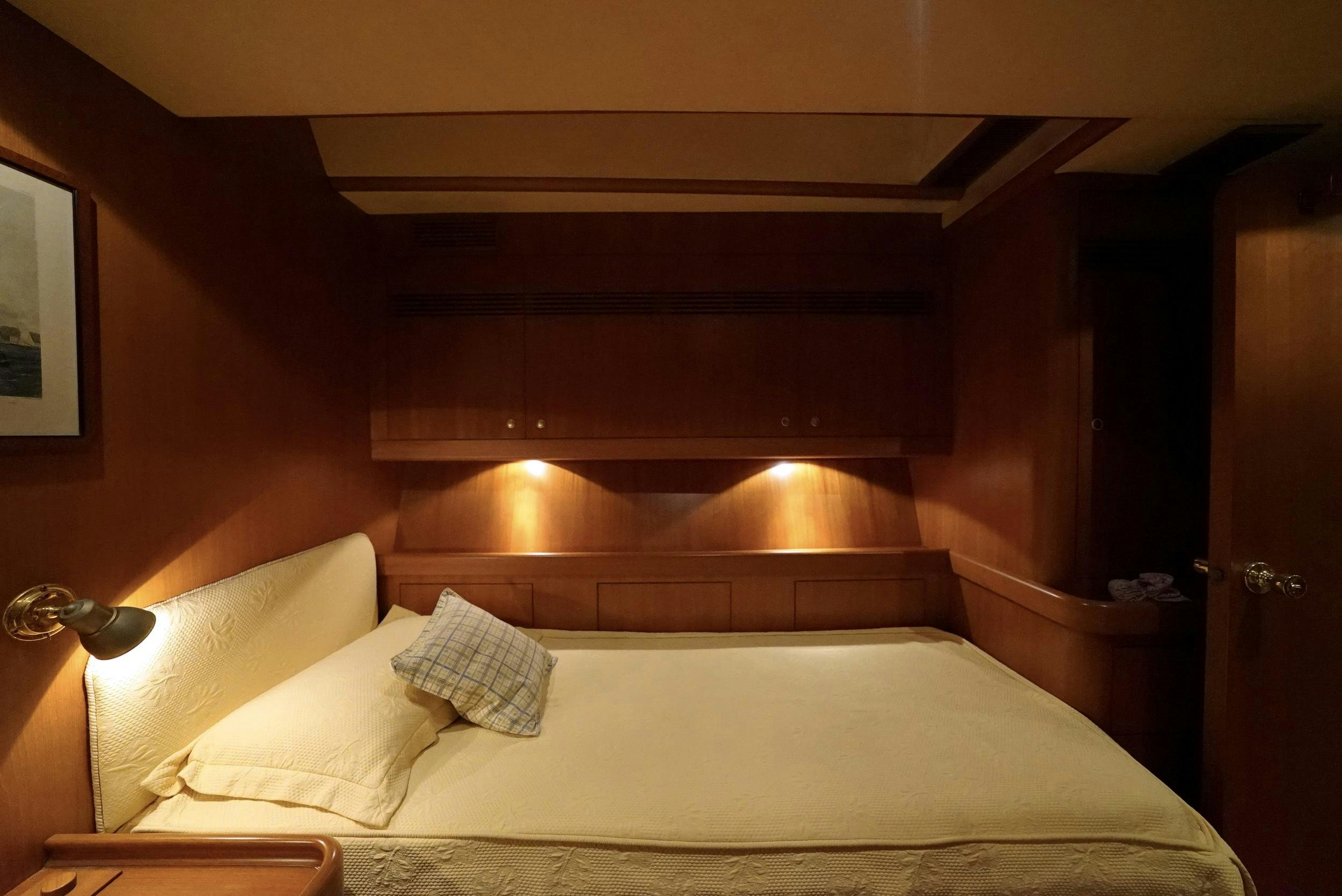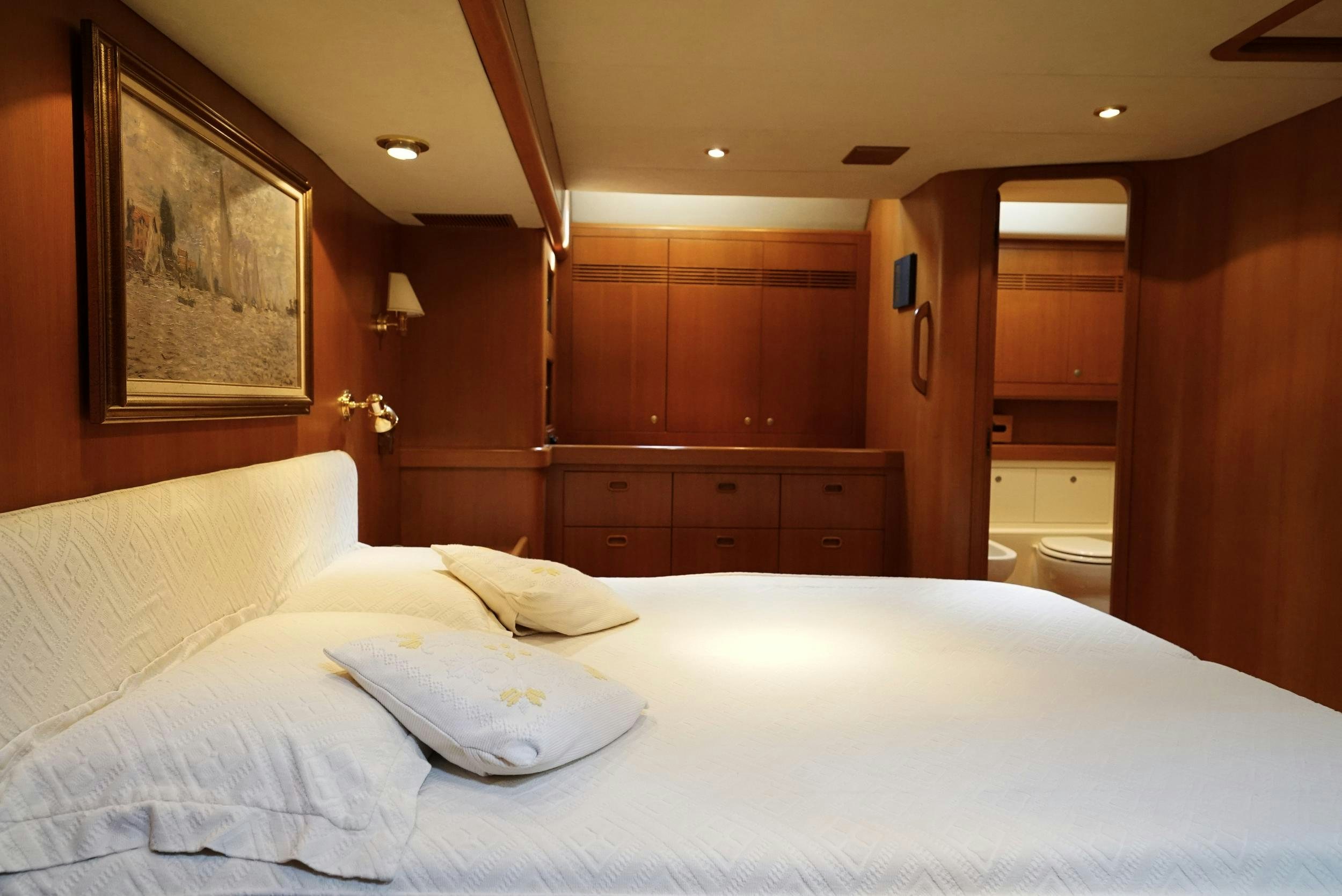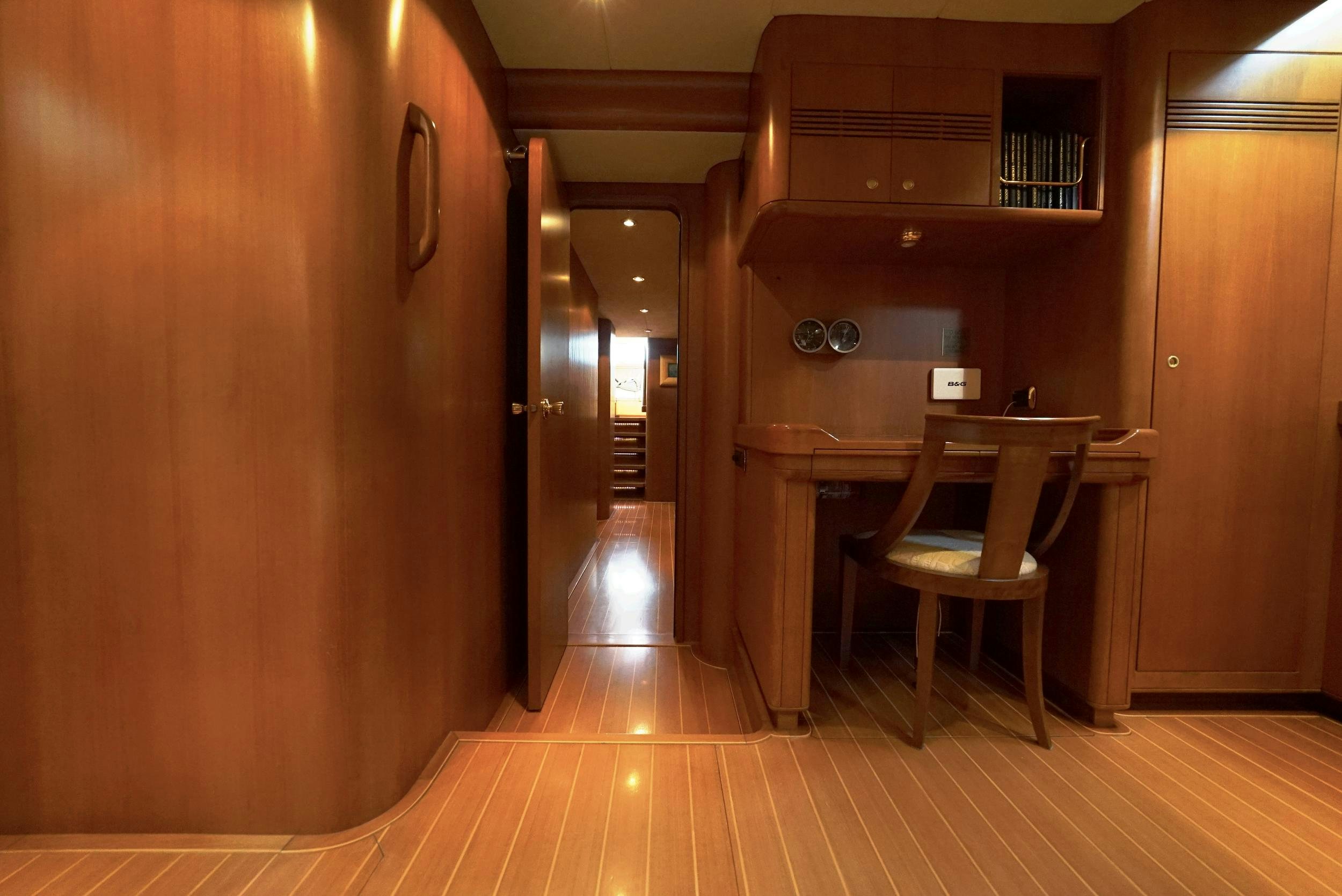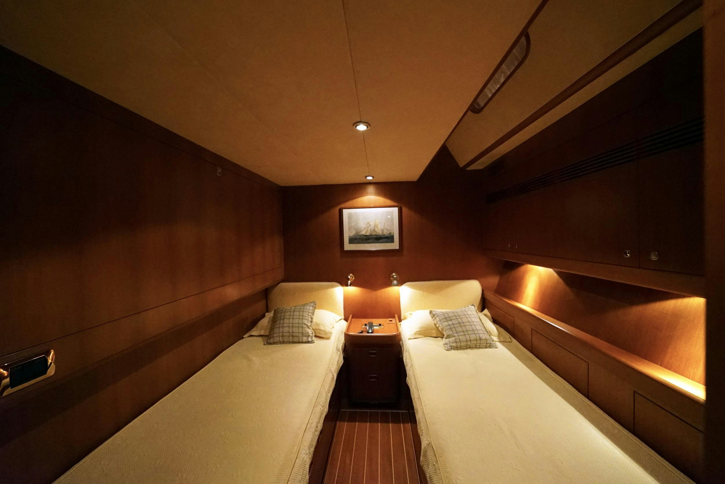 Accommodation is arranged aft for guests and forward for crew. The full-beam owner’s suite features a king-size berth, a private office/study and an en-suite bathroom with a separate shower and stone vanity. Two twin cabins sit adjacent, each fitted with two fixed single beds plus a retractable berth for flexible use, making the guest layout suitable for 6 + 2. Each twin has its own en-suite with separate shower. Crew live forward in two twin cabins with private facilities and easy access to the galley and the crew mess.