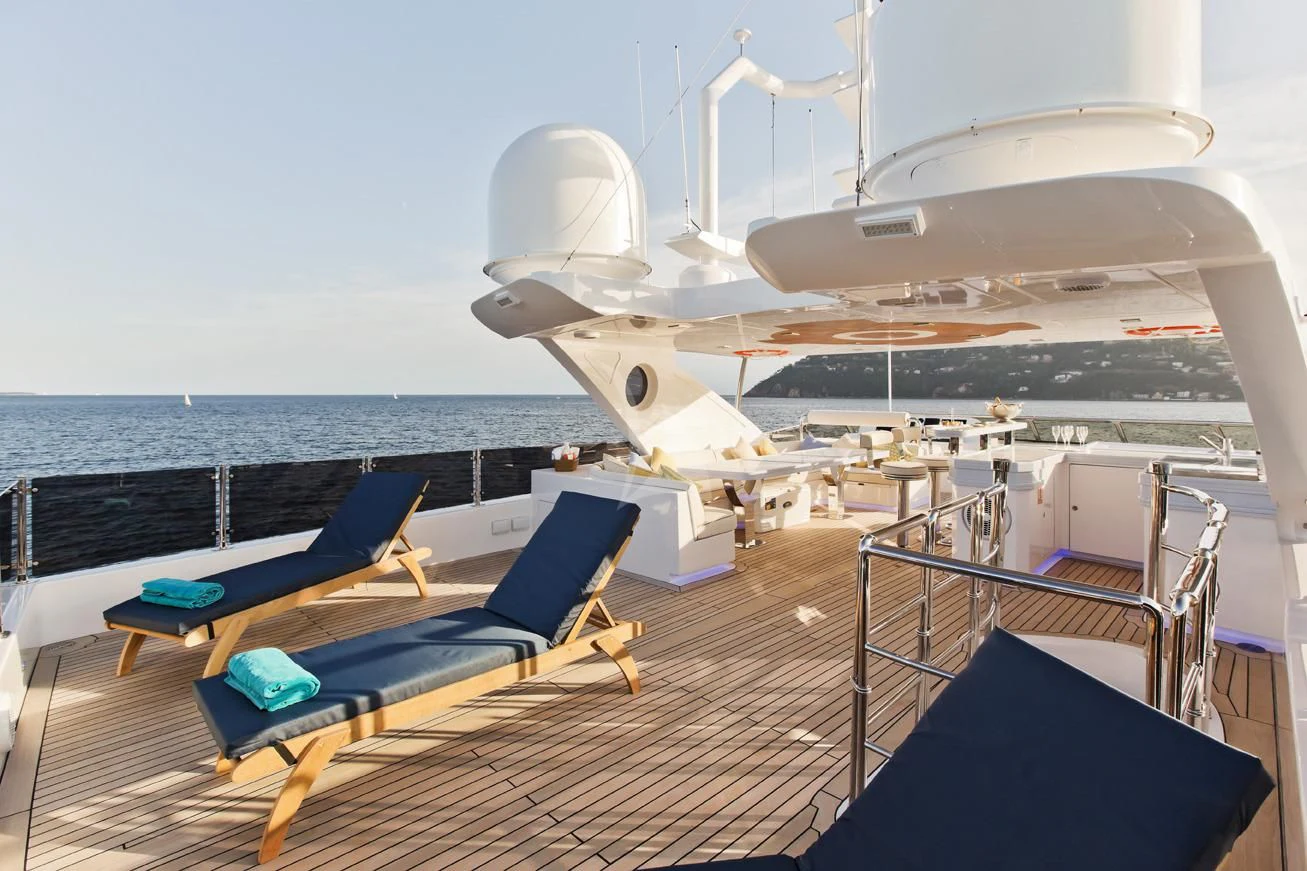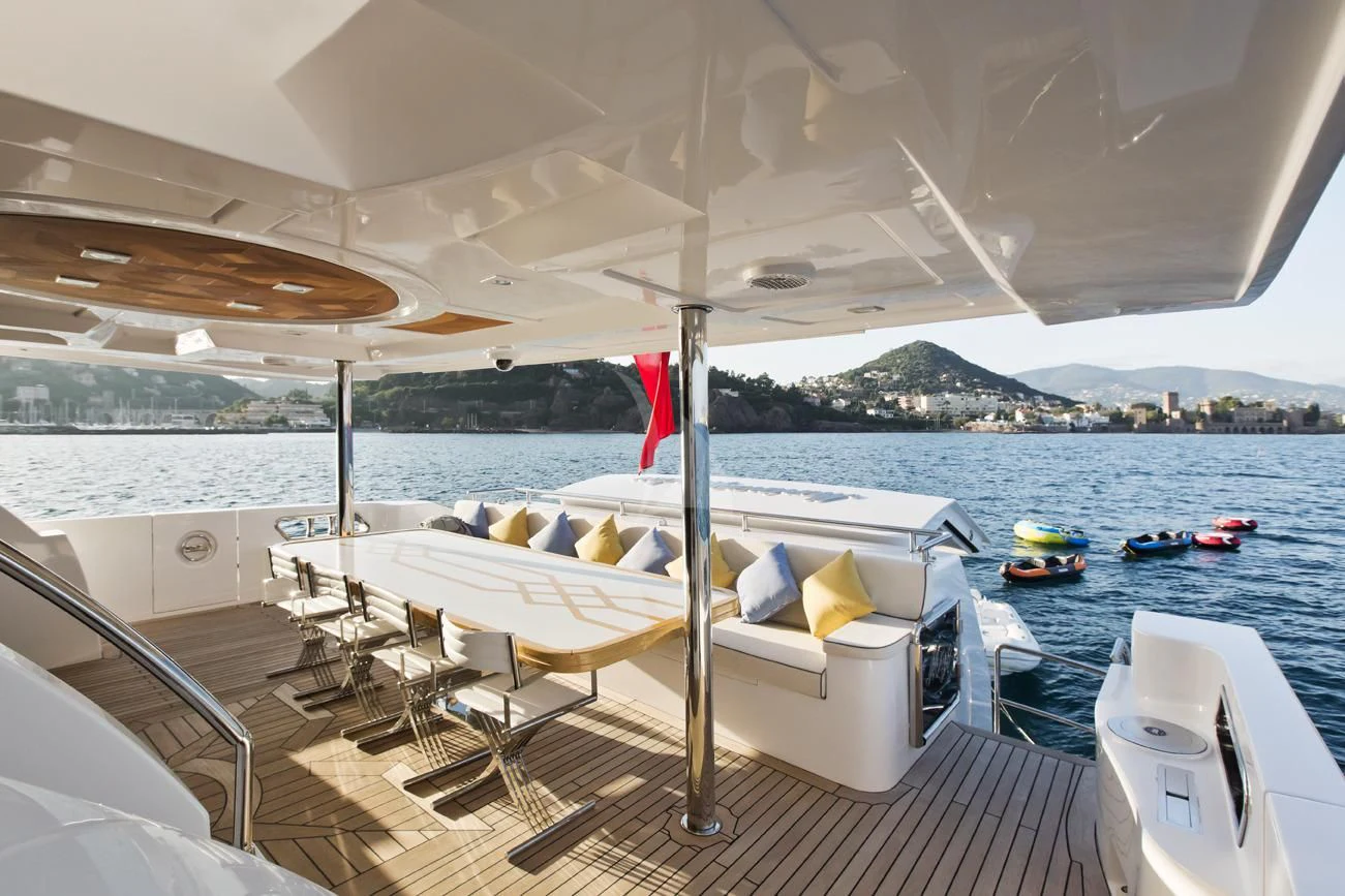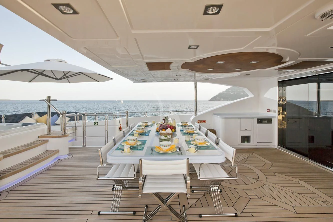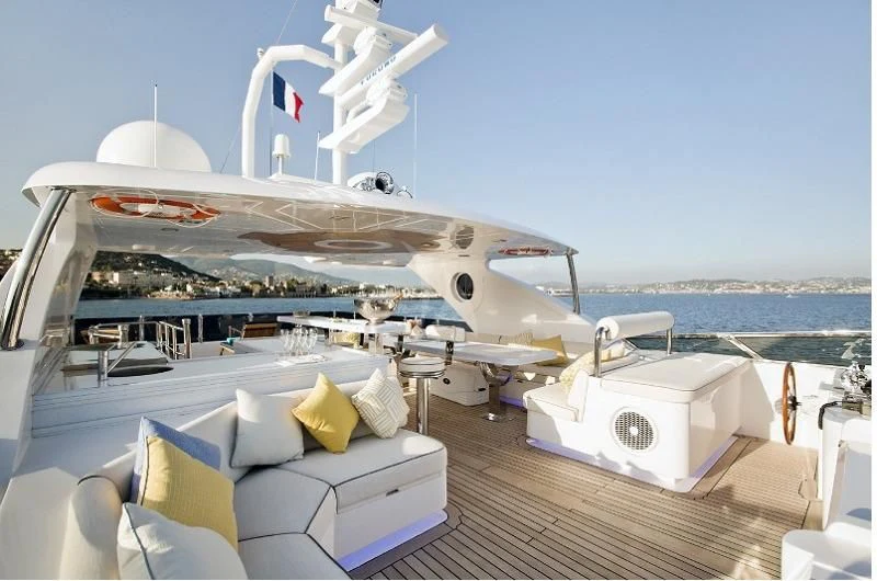 The exterior design of GRAND CRU is nothing short of spectacular - she exudes elegance and sophistication at every turn. The sundecks beckon guests to bask under the sun while sipping on their favorite cocktails. Alfresco dining areas serve as perfect spots for enjoying meals amidst breathtaking views, while lounging areas provide cozy corners for intimate conversations or solitary contemplation. A notable feature is the yacht’s top speed of an exhilarating 17 knots – ideal for those who crave adventure on the high seas.