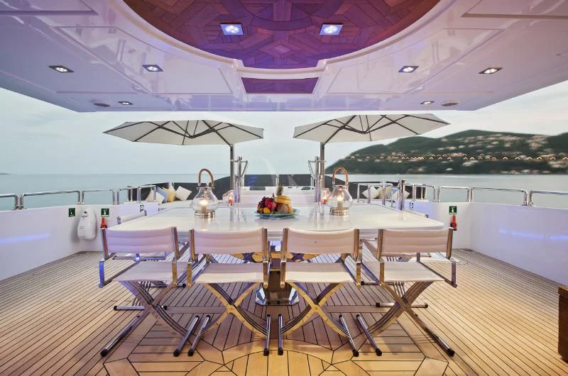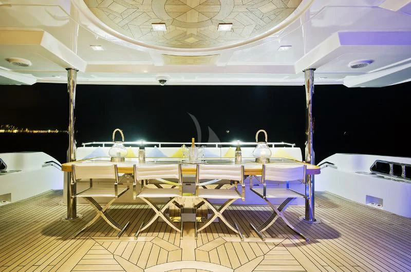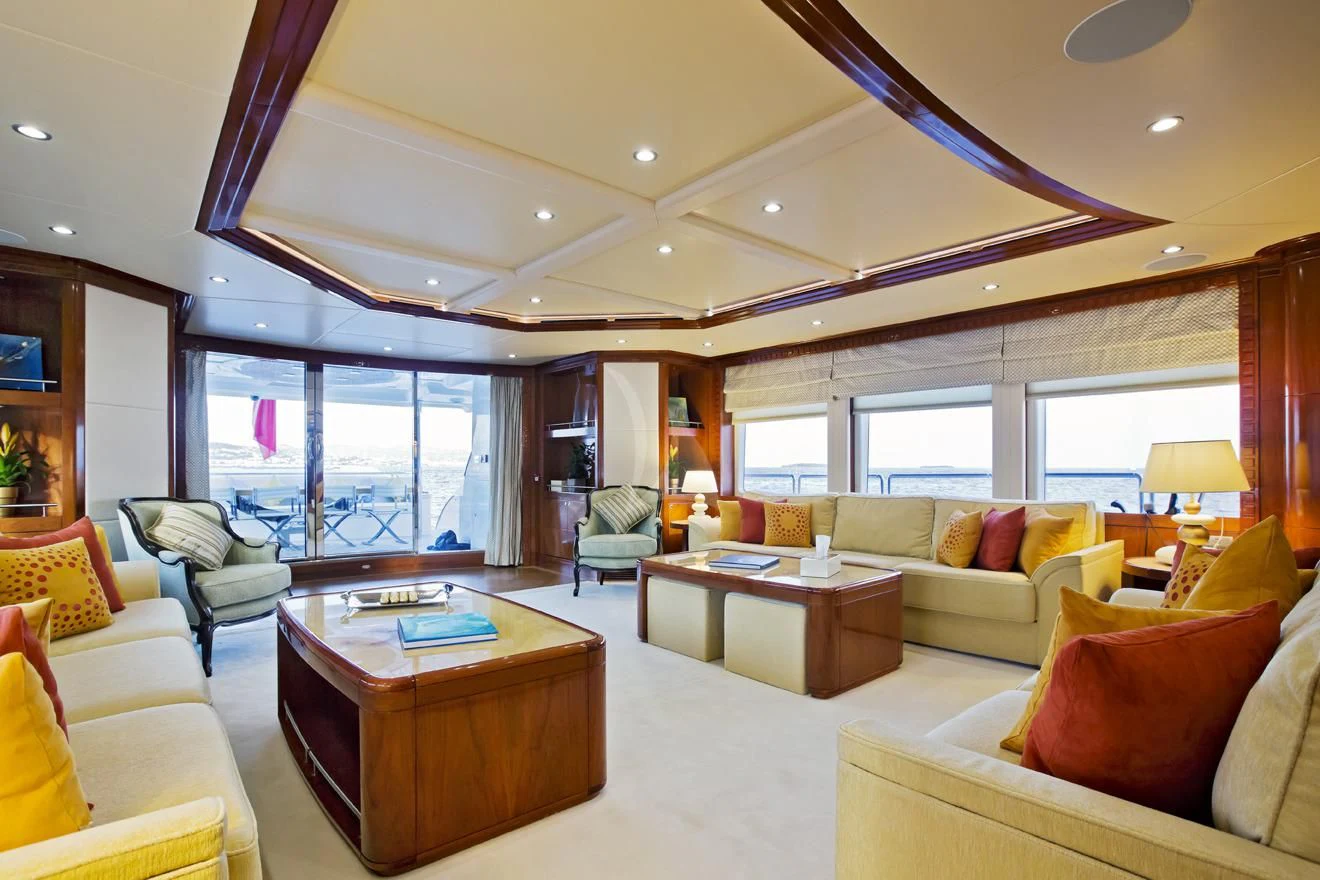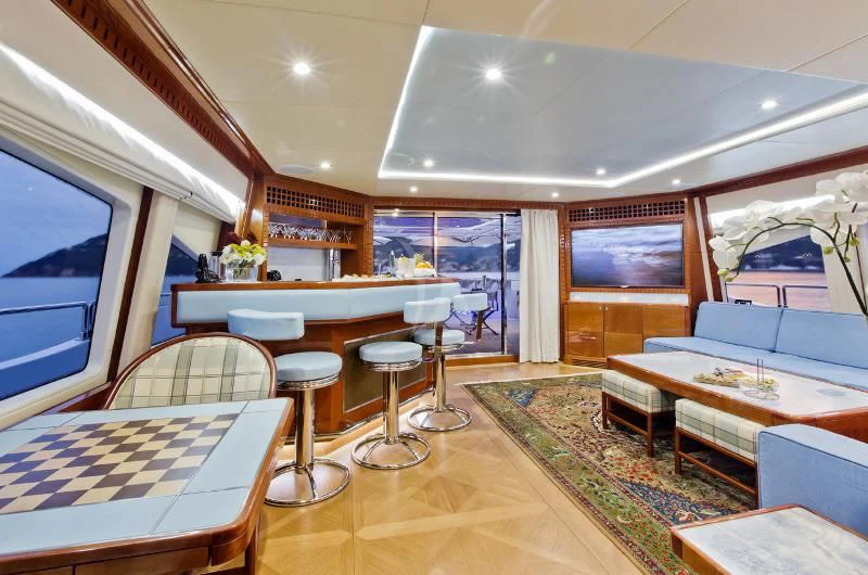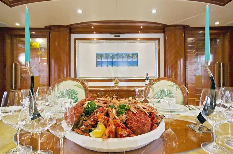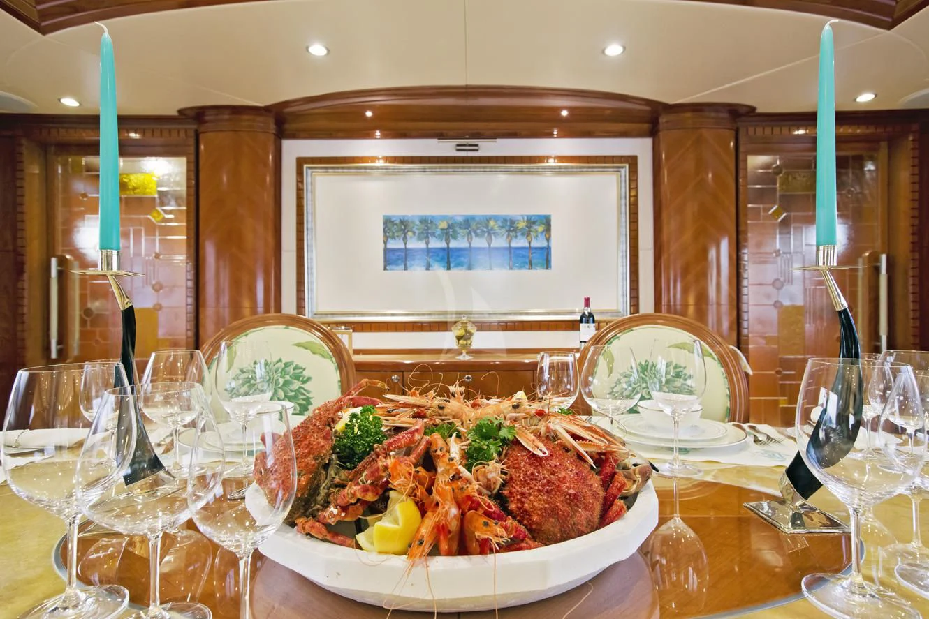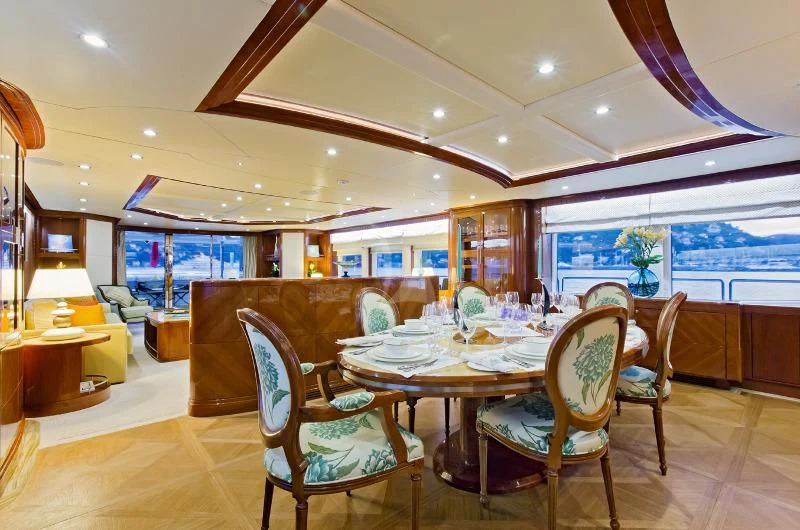 The main salon invites guests to unwind in its plush seating arrangement while engaging in delightful conversations or simply soaking in the tranquil marine vistas through panoramic windows. The dining area sets the stage for memorable culinary experiences with exquisite table settings and ambient lighting adding to its charm.