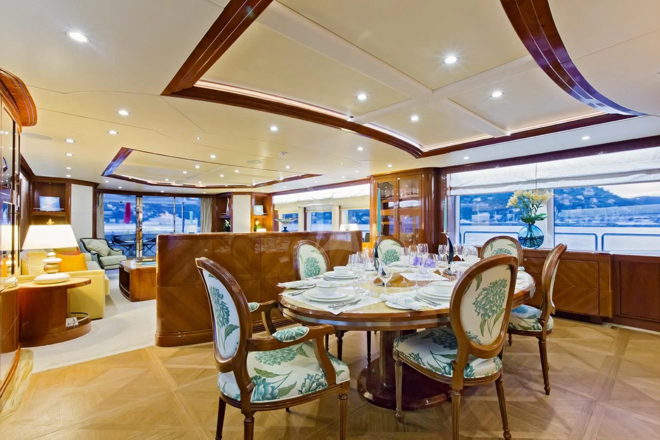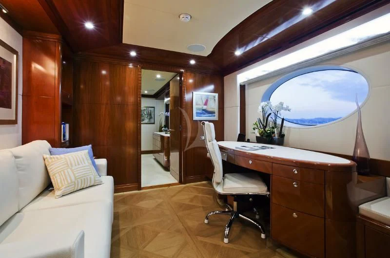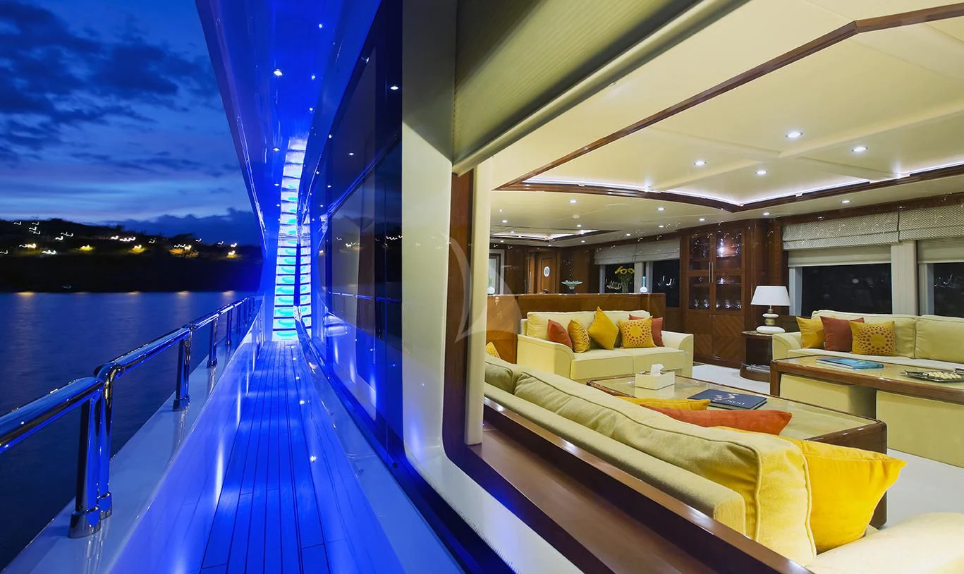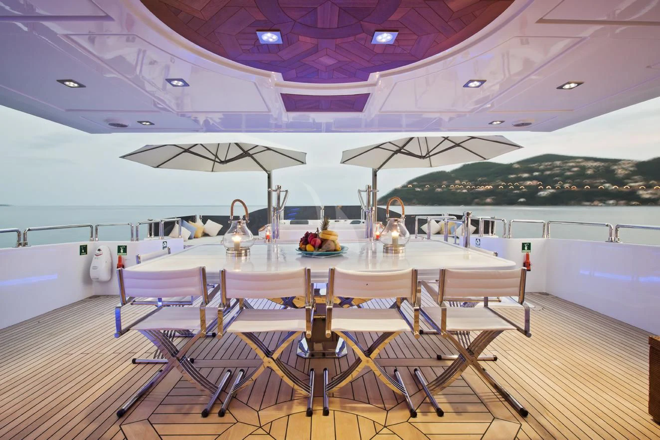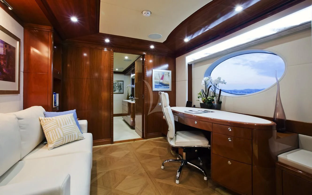 The main salon invites guests to unwind in its plush seating arrangement while engaging in delightful conversations or simply soaking in the tranquil marine vistas through panoramic windows. The dining area sets the stage for memorable culinary experiences with exquisite table settings and ambient lighting adding to its charm.