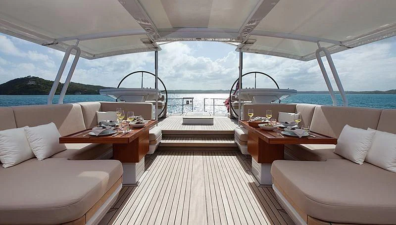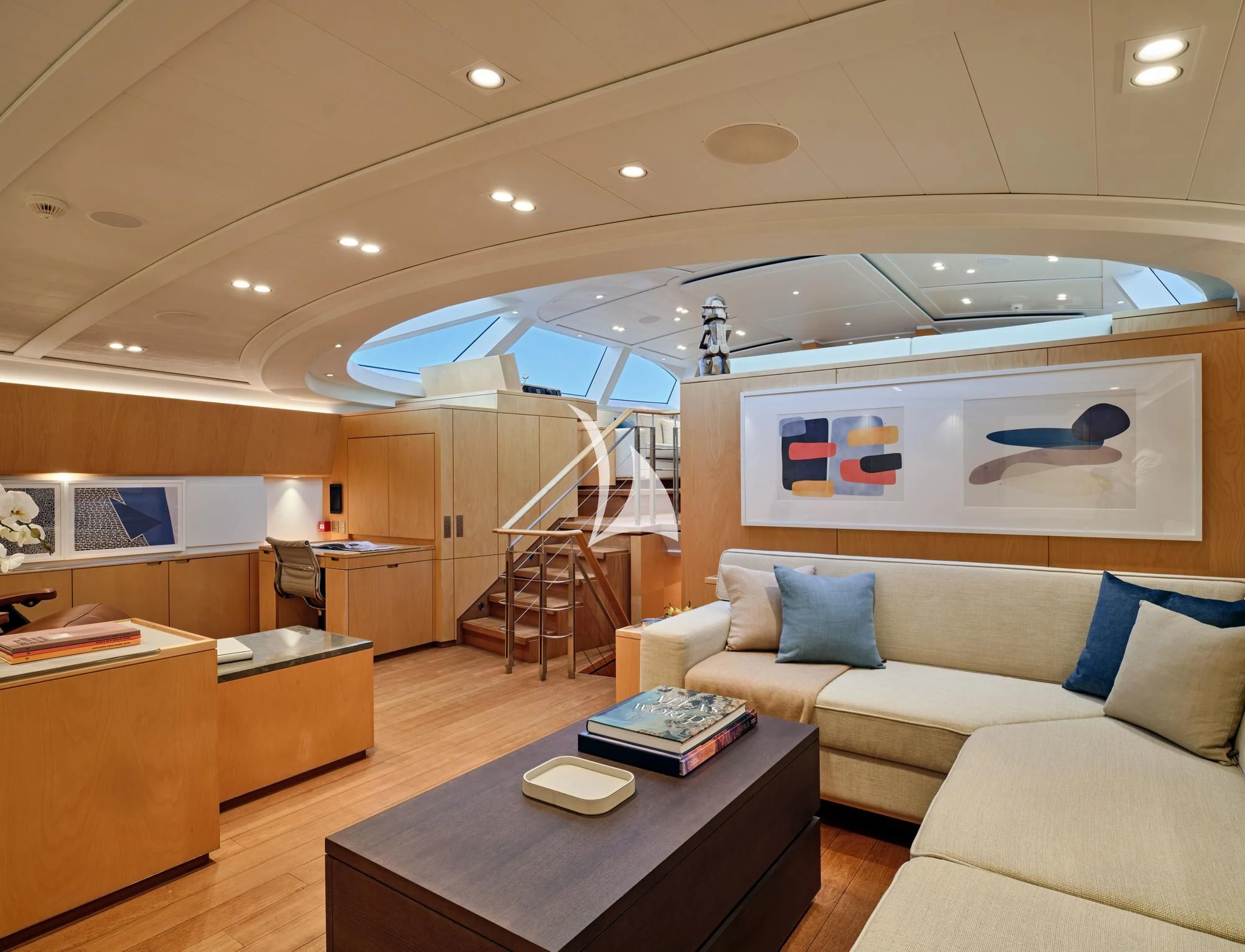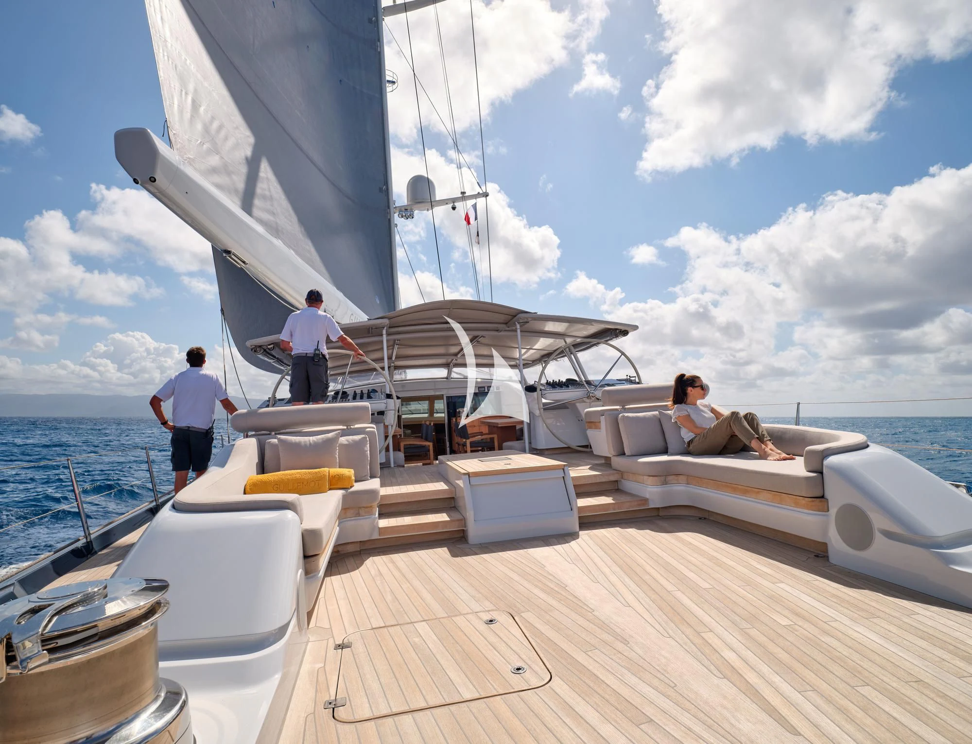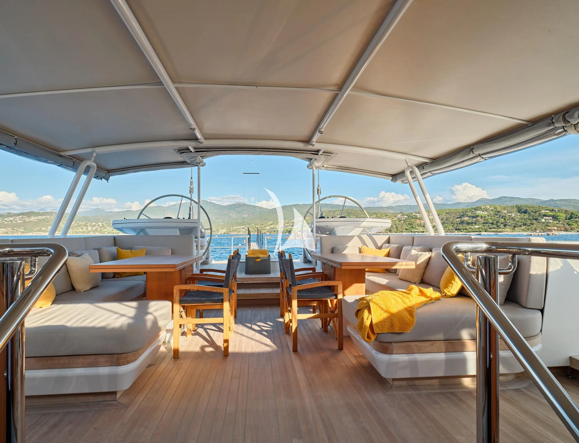 GUILLEMOT's expansive deck offers an abundance of outdoor spaces for relaxation and entertainment. The sundeck invites guests to bask under the sun or gaze at the stars while lounging on plush seating arrangements. An alfresco dining area provides an intimate setting for memorable meals against the backdrop of stunning seascapes. The yacht’s beam measures 29 feet 6 inches (8.8 meters), creating generous exterior spaces for guests to enjoy leisure activities or simply soak up panoramic ocean views.