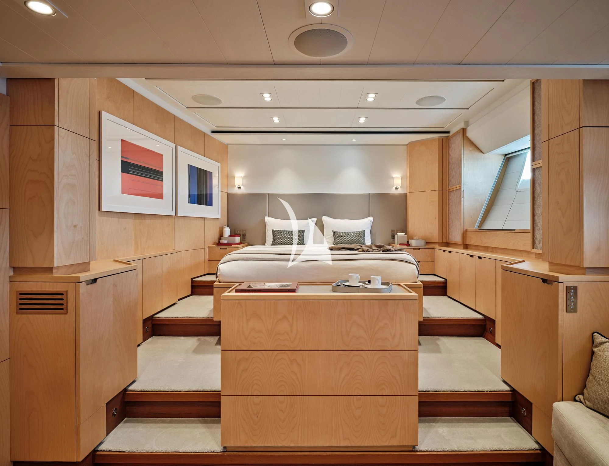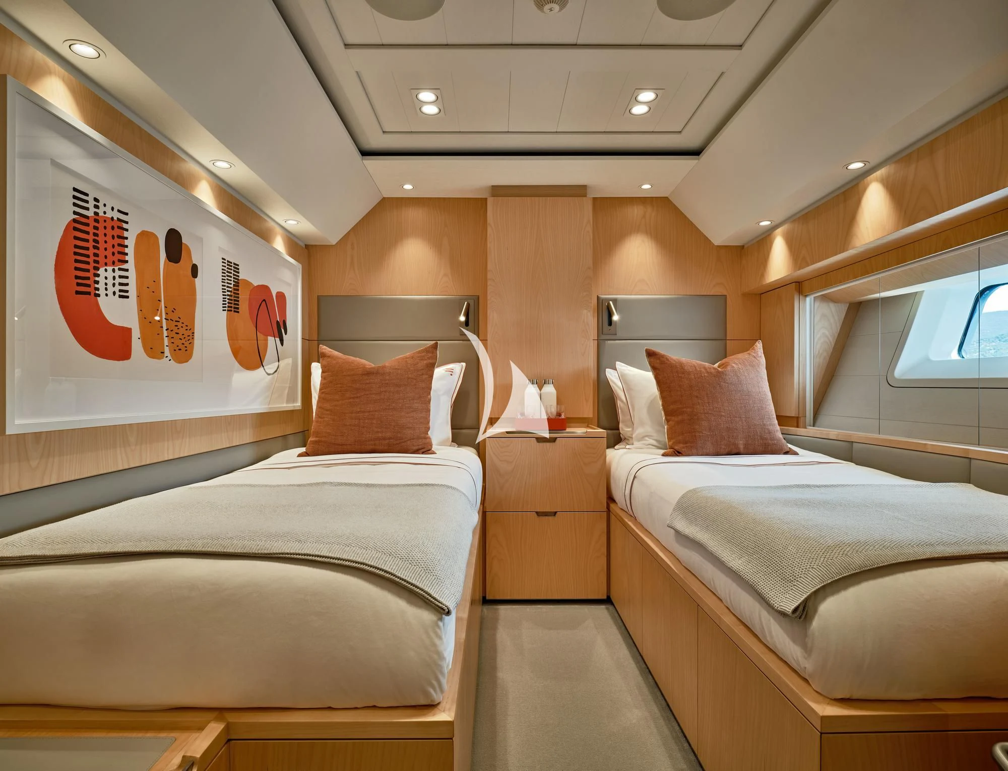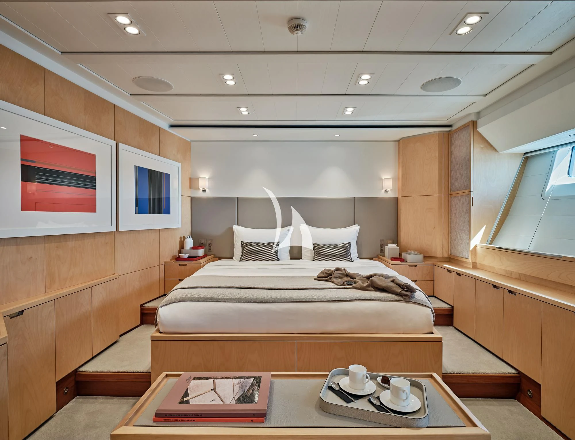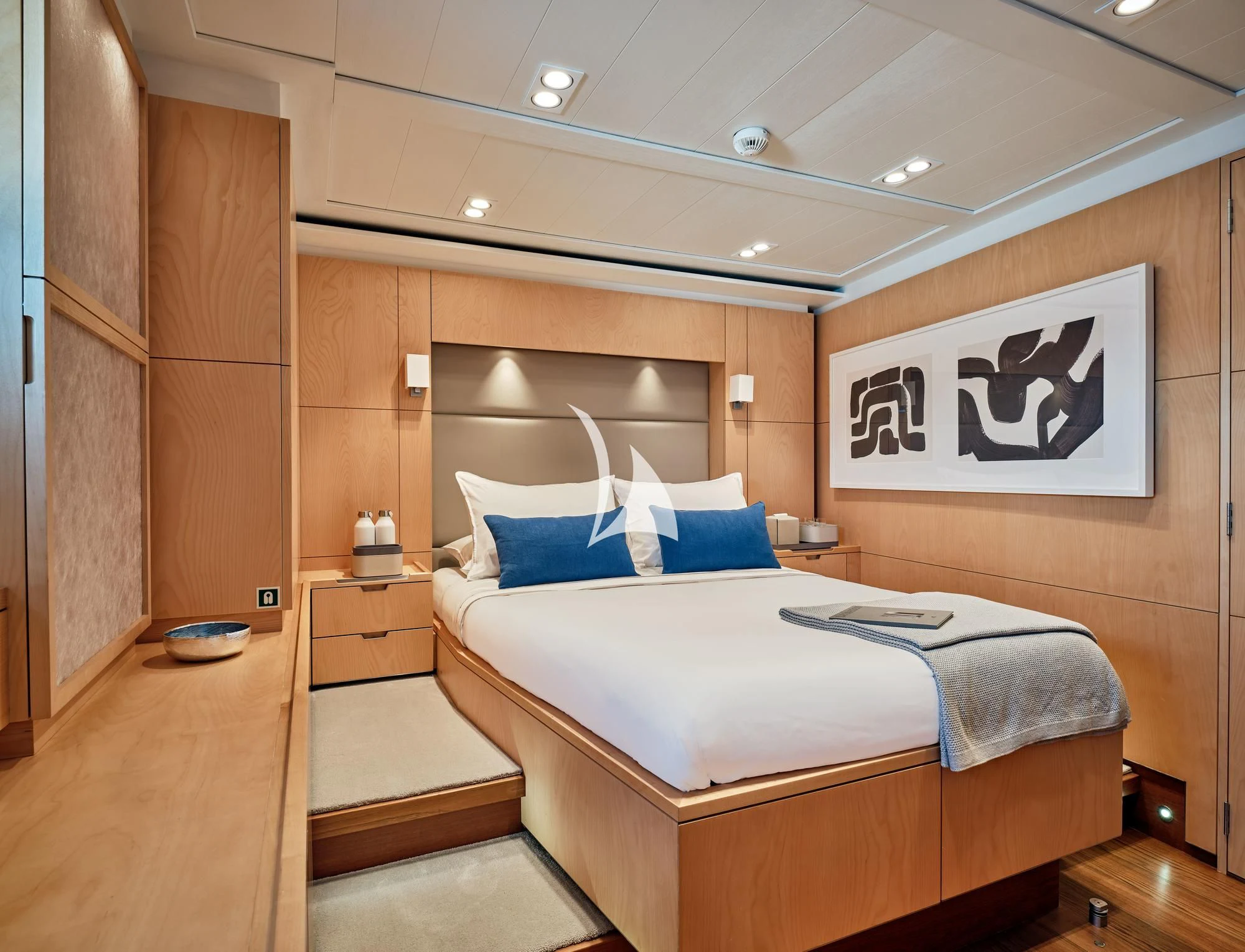 Step inside GUILLEMOT and be prepared to be awed by her luxurious interior style that exudes warmth and comfort. With five beautifully appointed cabins, she can comfortably accommodate up to ten esteemed guests while maintaining utmost privacy and space. Each stateroom boasts its unique design elements with a harmonious color palette that enhances serene ambiance onboard this magnificent vessel. The master suite stands out as a haven of tranquility, offering splendid views through large windows, plush furnishings, ample storage space, and en-suite facilities adorned with premium fixtures.