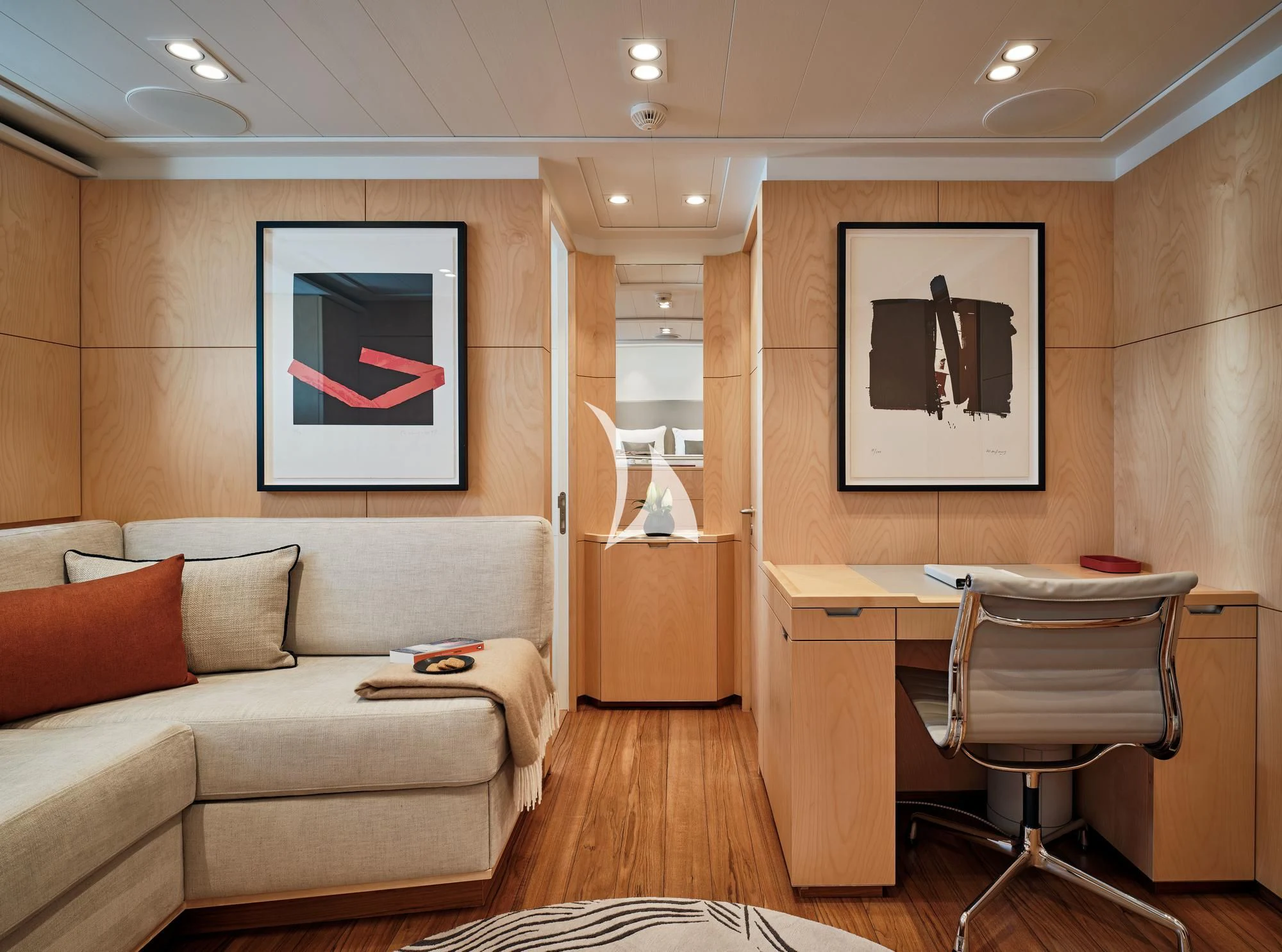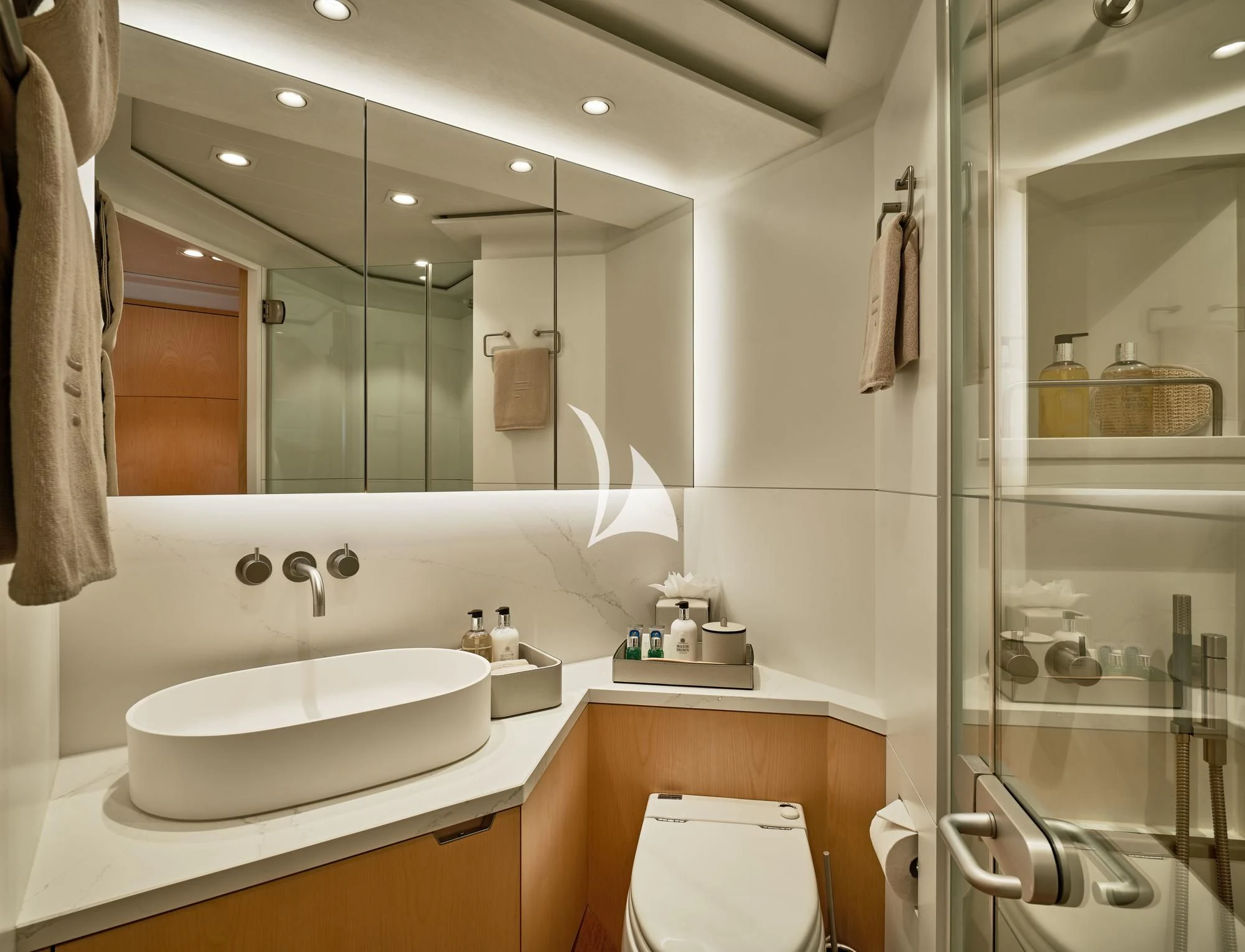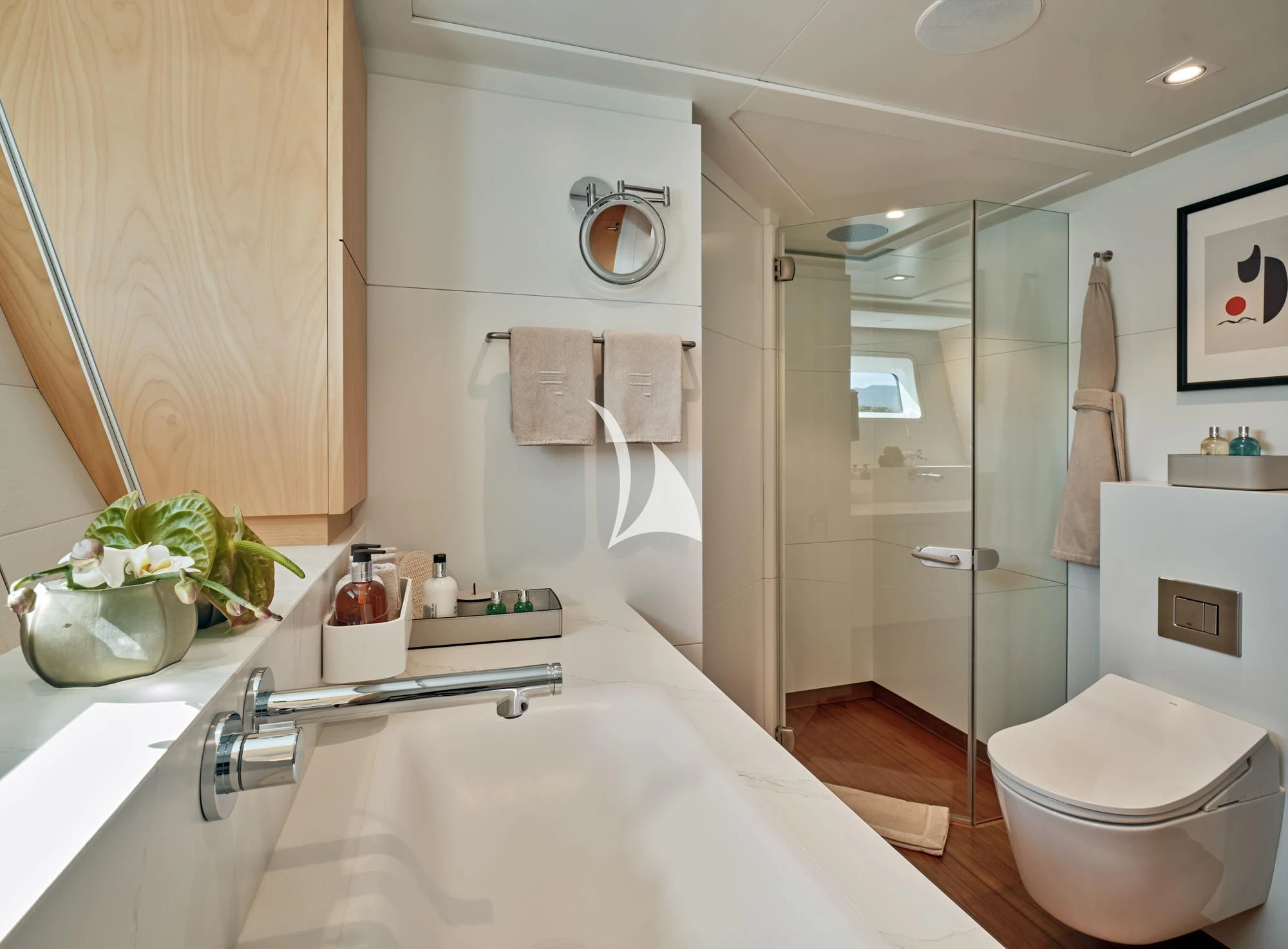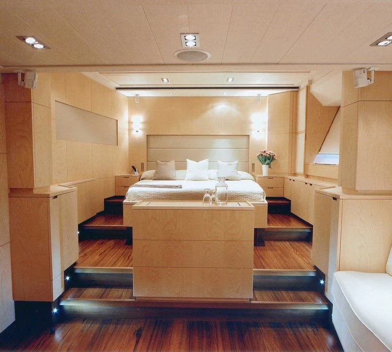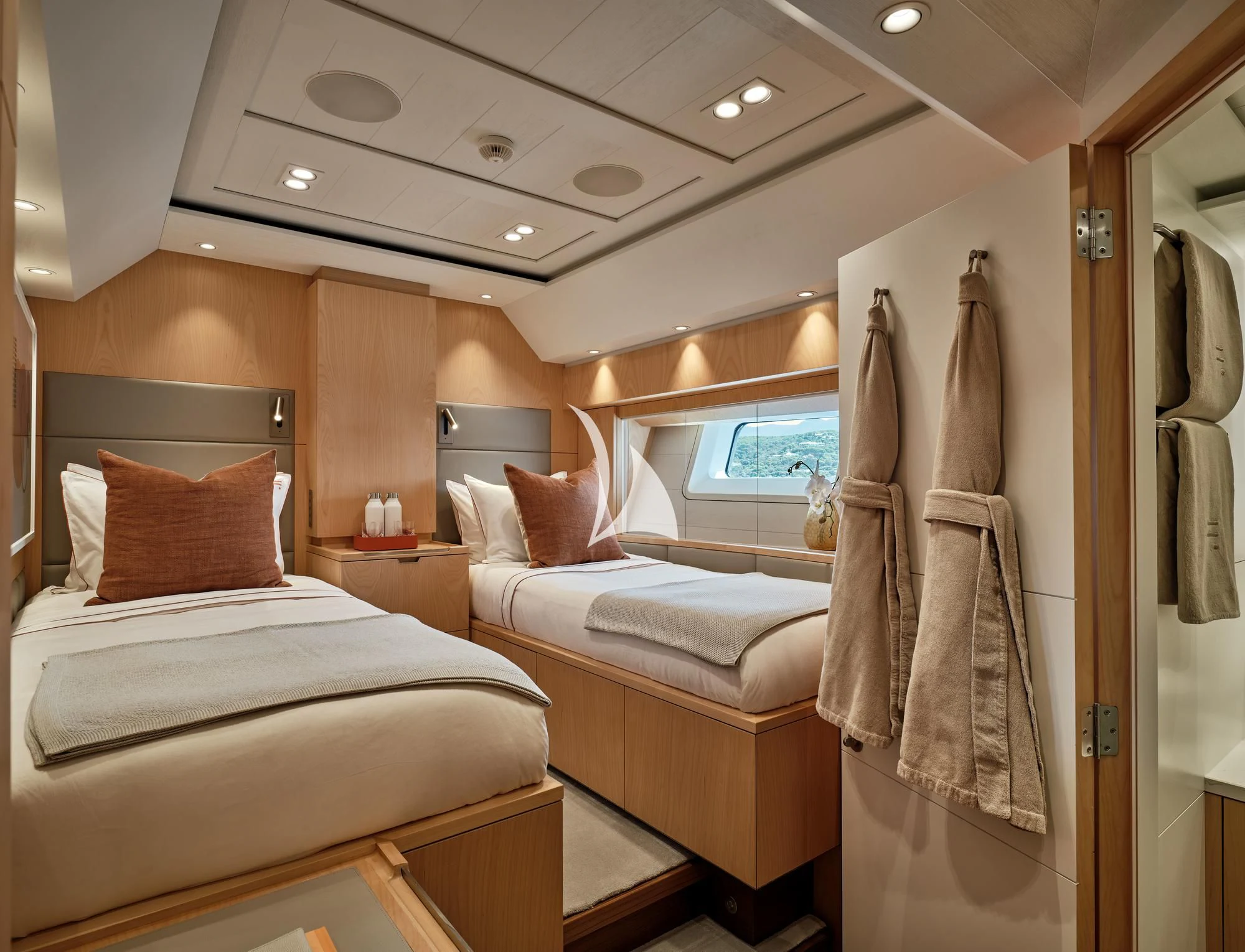Step inside GUILLEMOT and be prepared to be awed by her luxurious interior style that exudes warmth and comfort. With five beautifully appointed cabins, she can comfortably accommodate up to ten esteemed guests while maintaining utmost privacy and space. Each stateroom boasts its unique design elements with a harmonious color palette that enhances serene ambiance onboard this magnificent vessel. The master suite stands out as a haven of tranquility, offering splendid views through large windows, plush furnishings, ample storage space, and en-suite facilities adorned with premium fixtures.