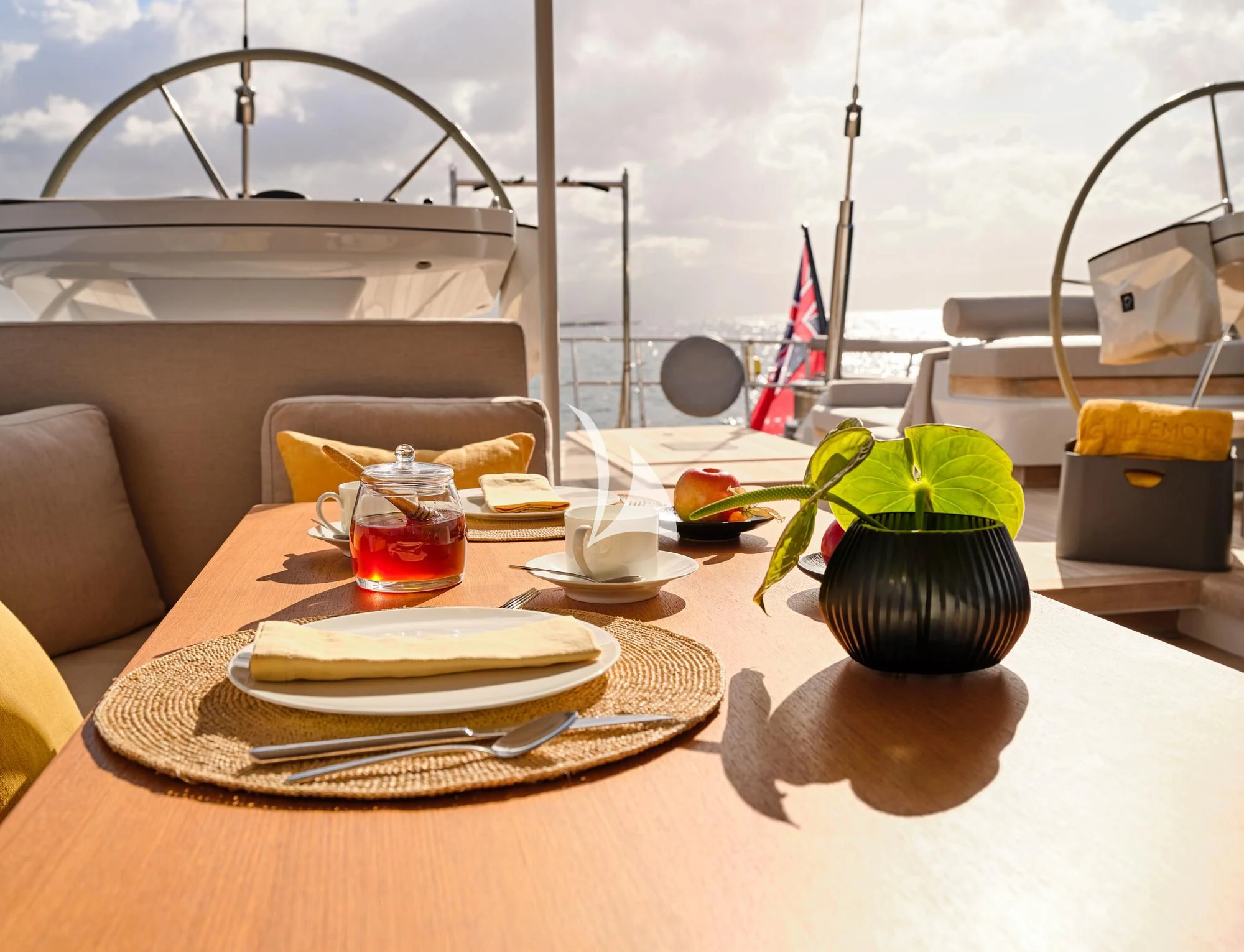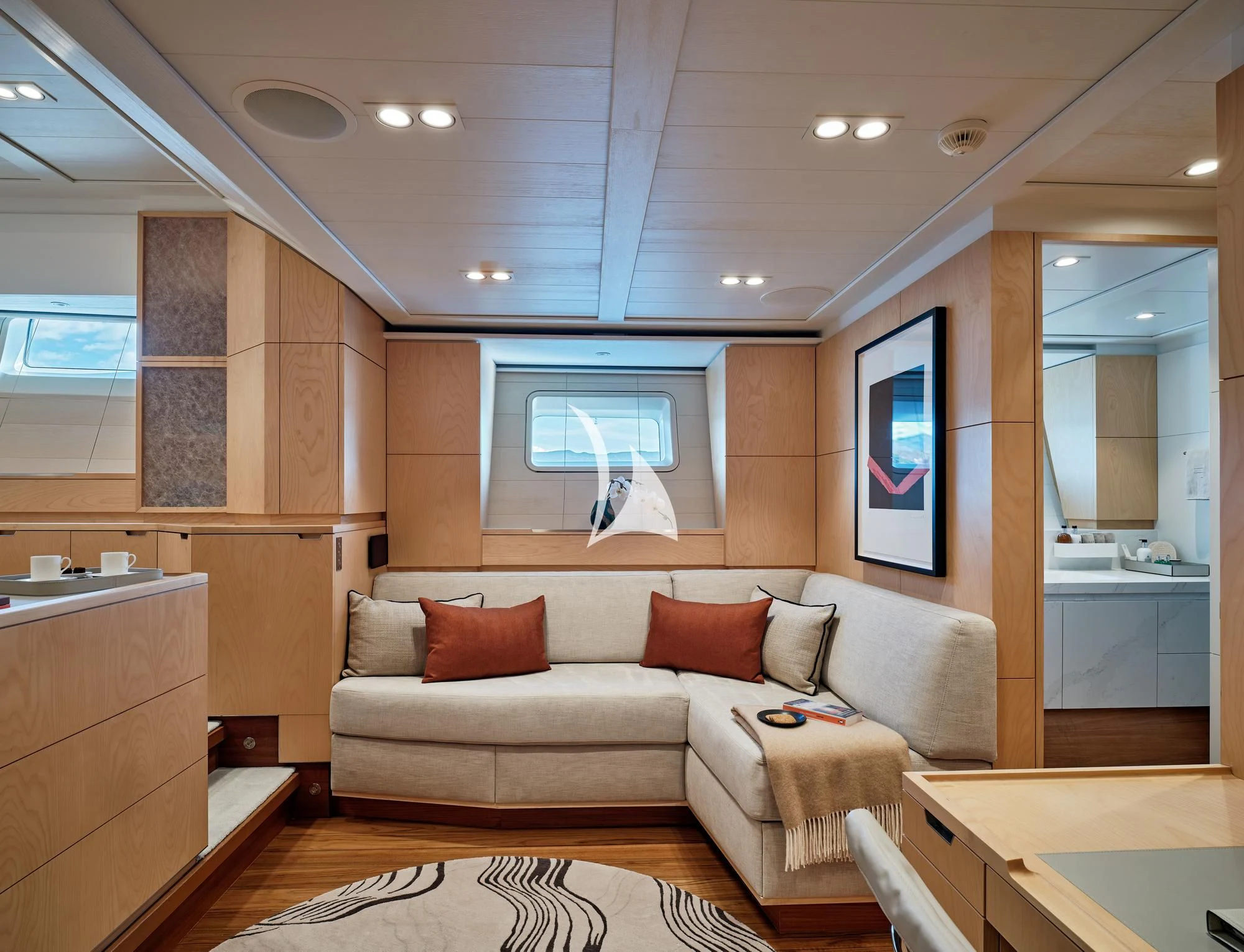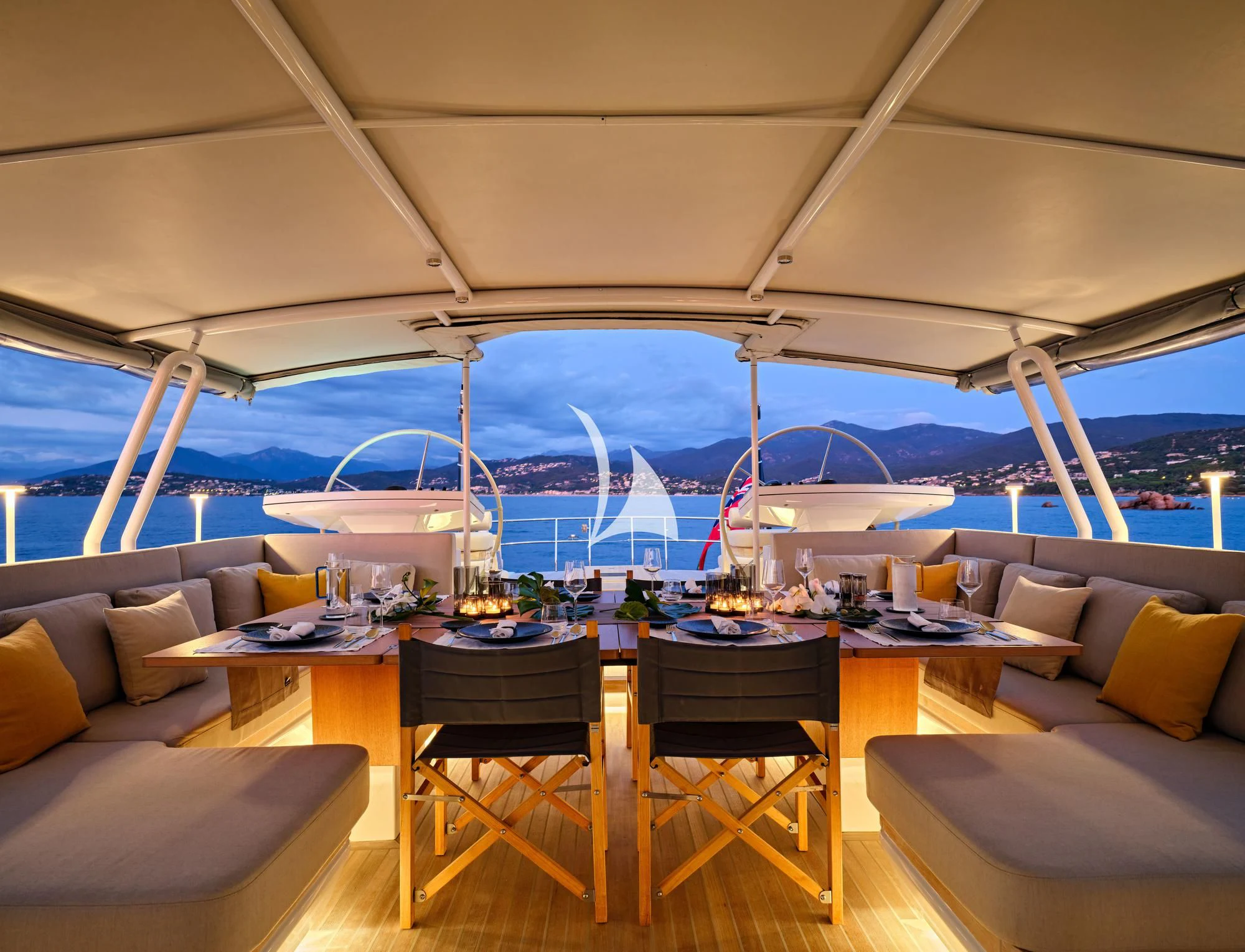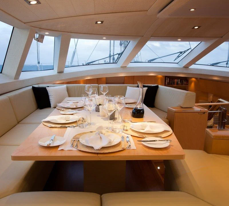 The main salon of GUILLEMOT is where contemporary design meets functionality – it's a perfect place for socializing or unwinding after an adventurous day at sea. Adjacent lies the formal dining area that sets the stage for gourmet experiences curated by our skilled chef aboard this floating paradise.