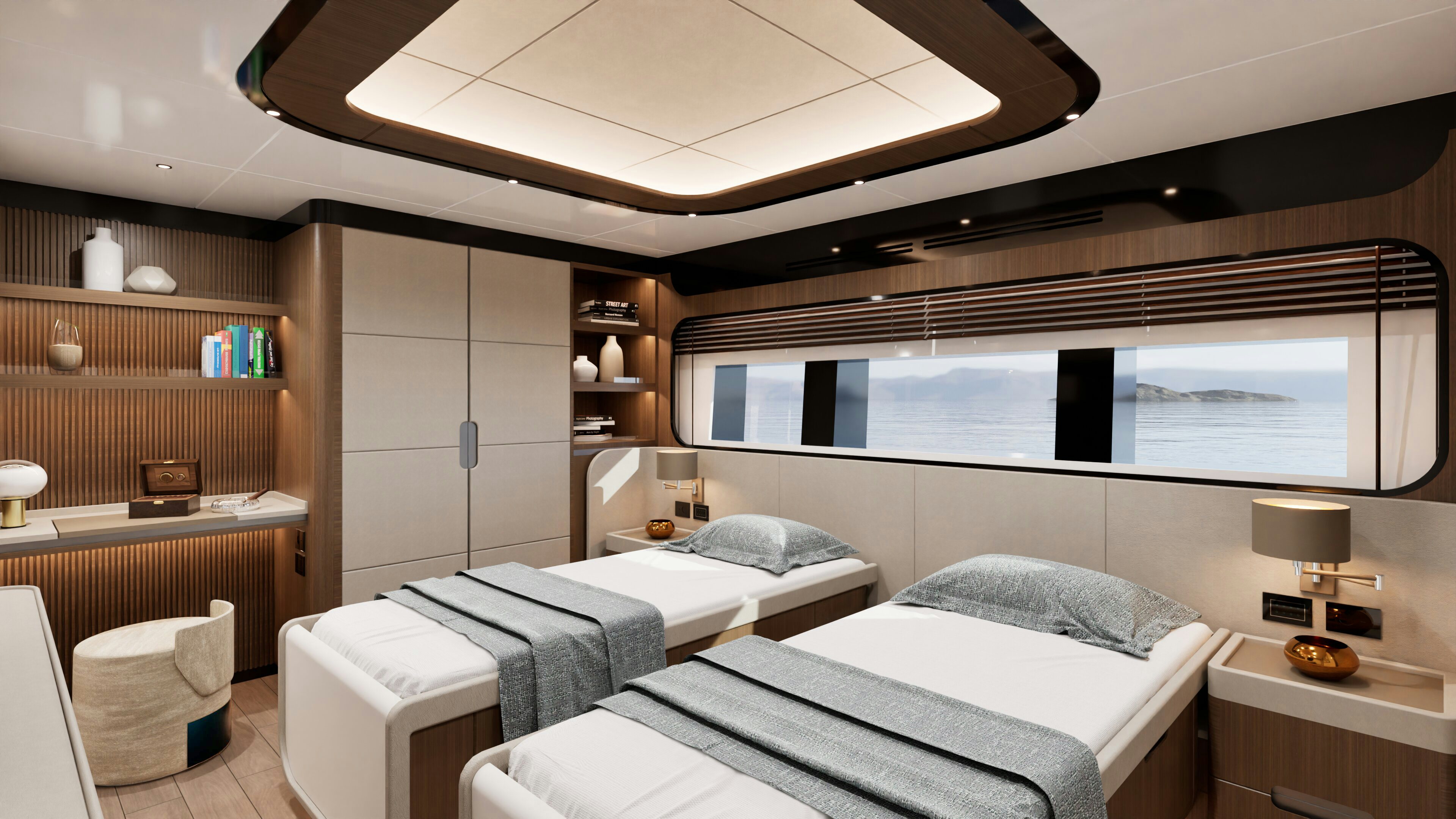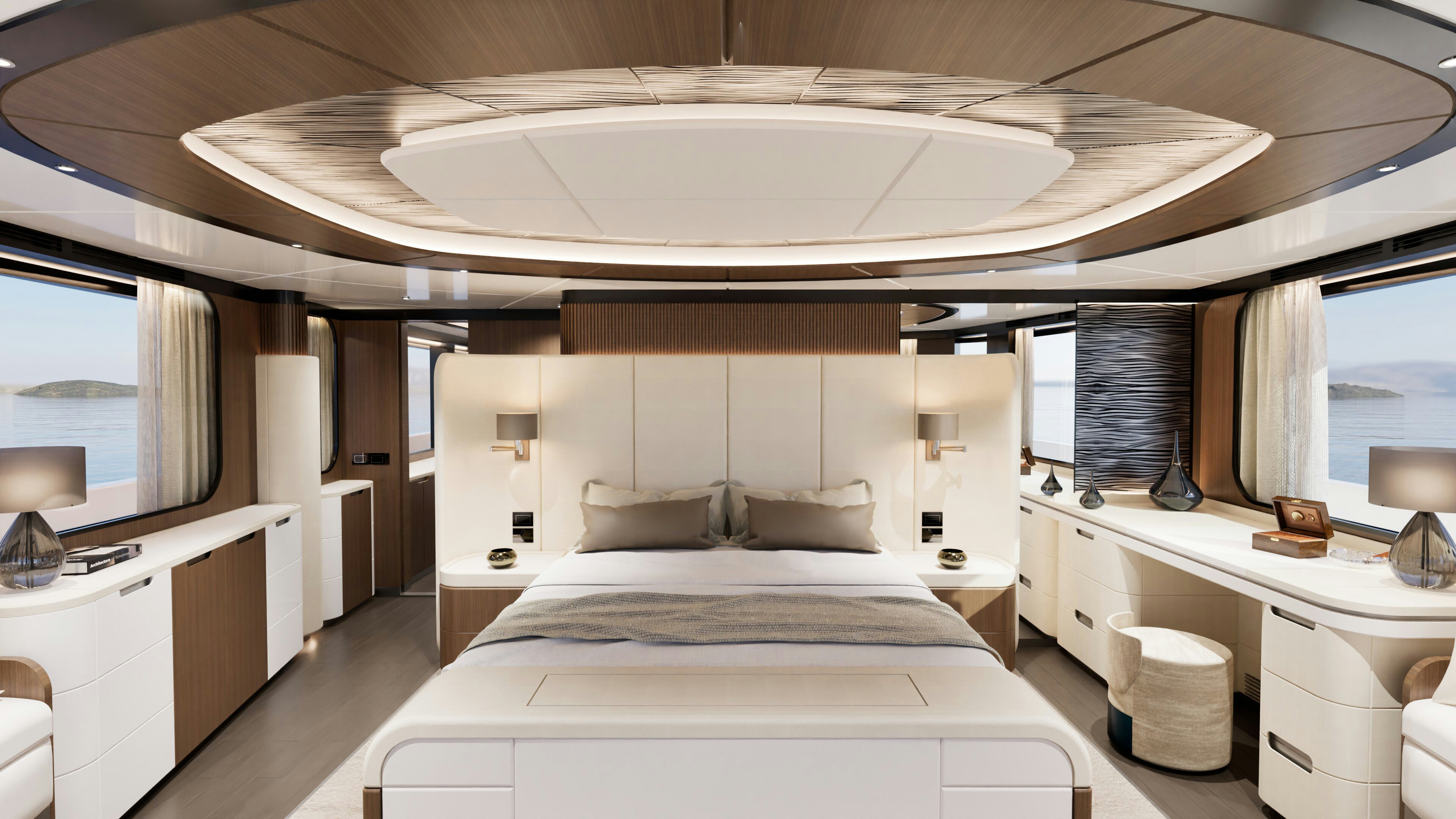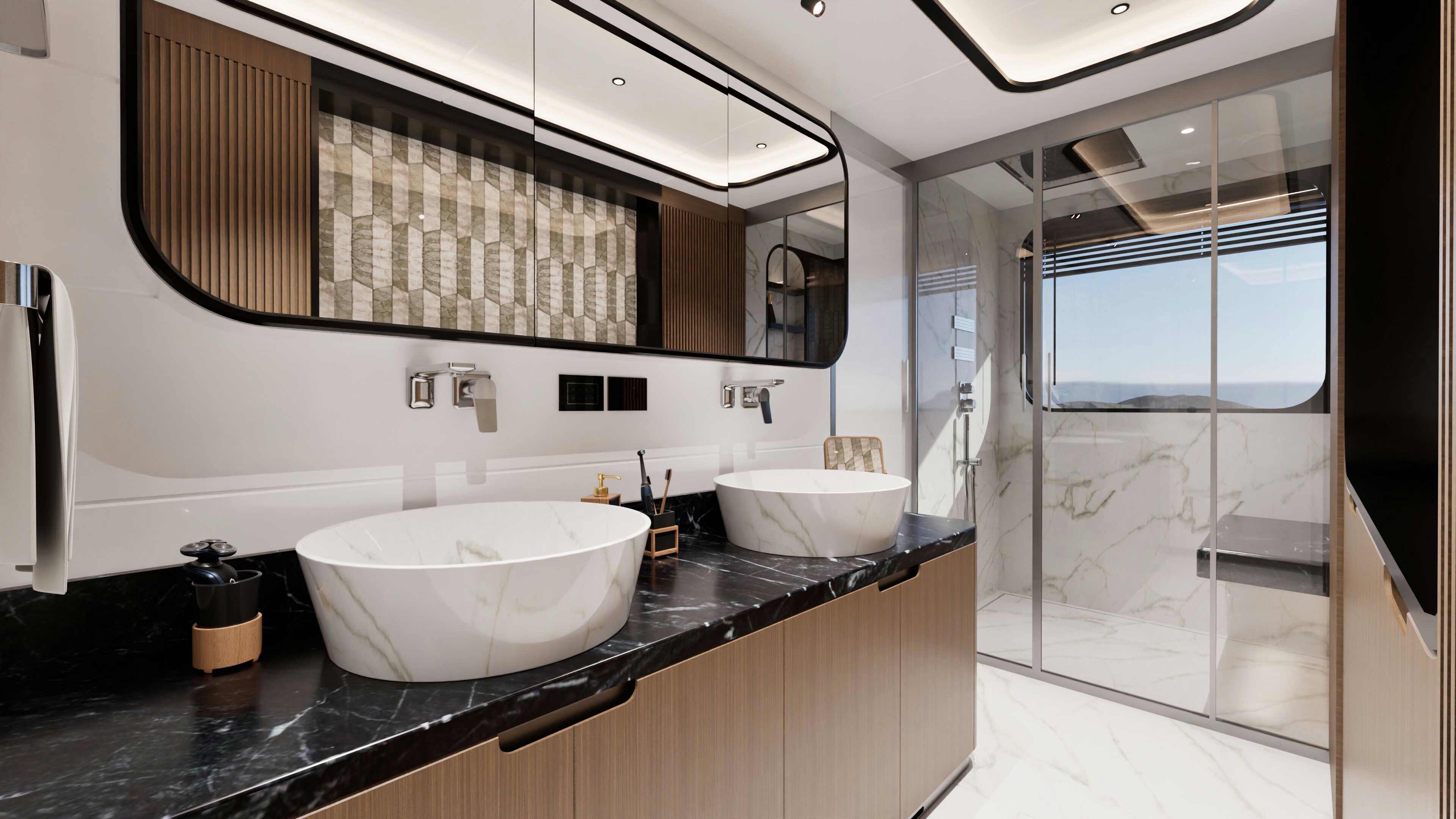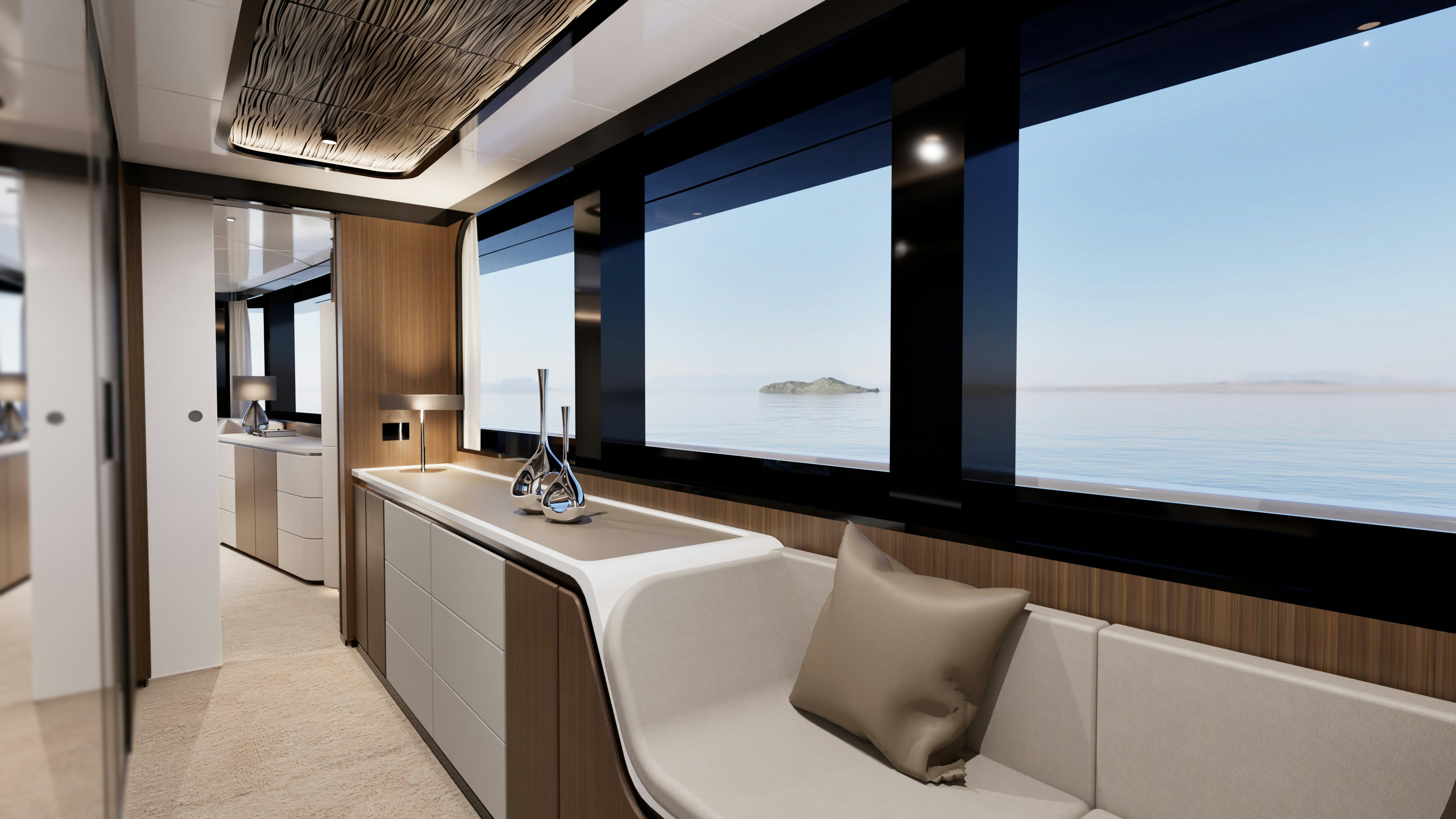 Interior design by Casali continues the theme of intelligent luxury. A seamless progression from the main saloon to the upper decks is complemented by top-tier materials and finishes: Antonio Lupi porcelainware, Dornbracht fixtures, Foglizzo leathers, Cadorin natural wood flooring, and furnishings by Poltrona Frau and Rugiano. Every detail is carefully selected for both comfort and sustainability. Accommodation is configured for 10 guests in five spacious cabins, with a dedicated crew of eight to ensure smooth operation. The layout is fully customizable to meet individual owner preferences. She also features a stunning seawater pool for alfresco enjoyment.