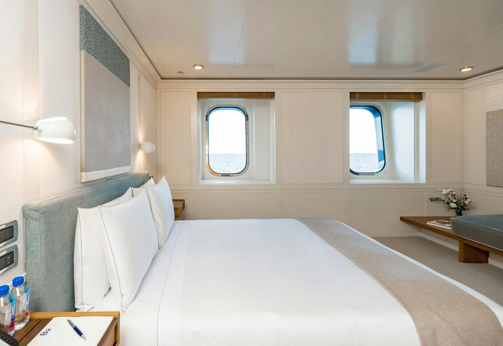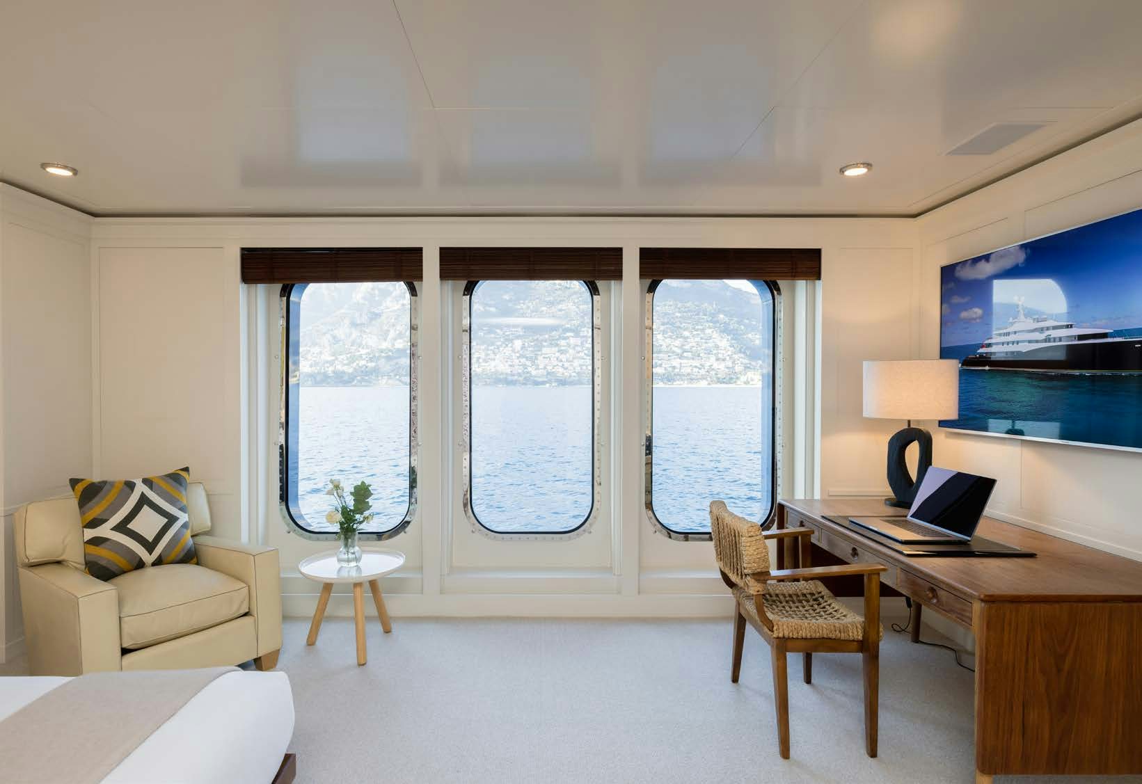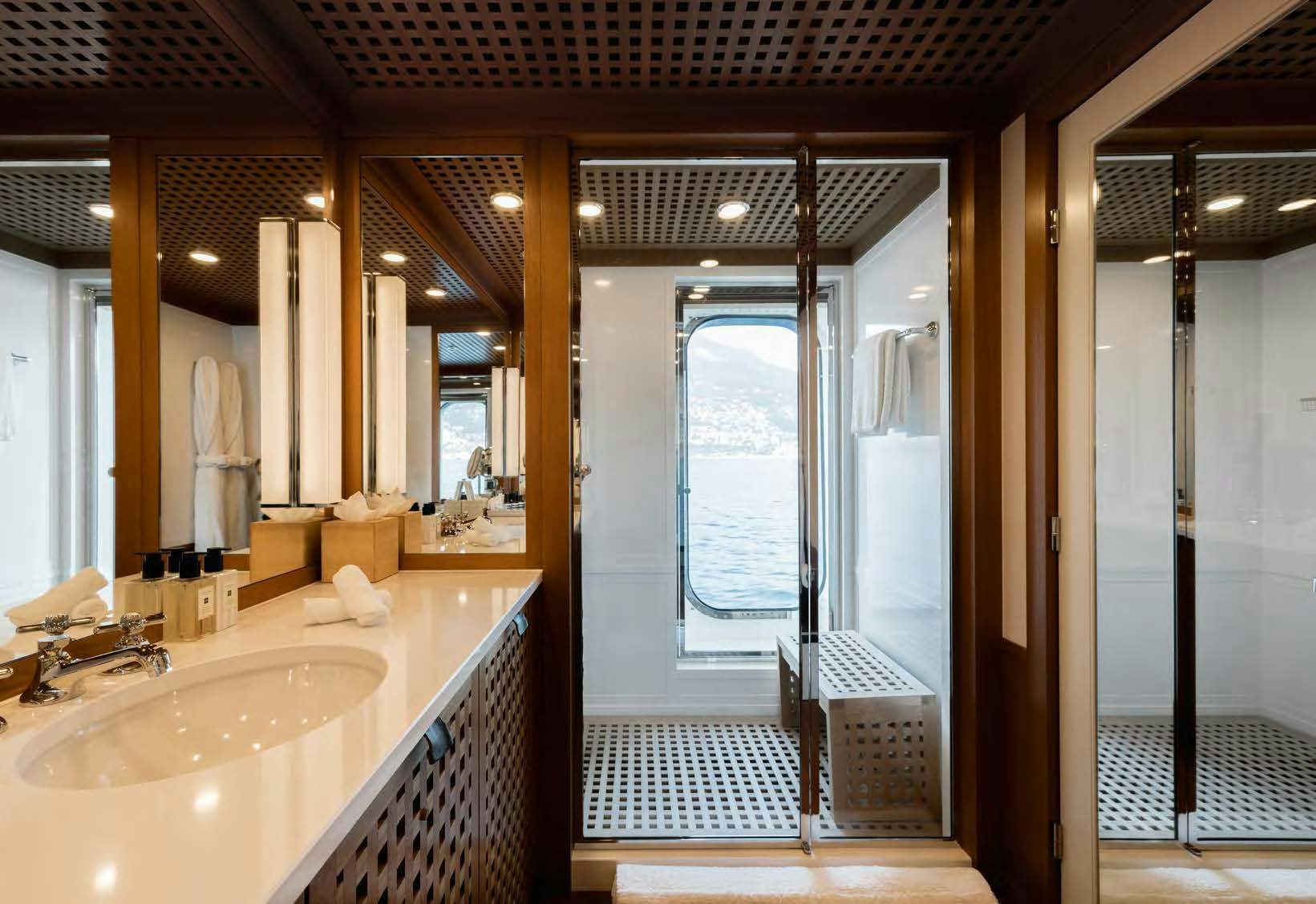 Stepping inside HBC reveals an interior that matches the grandeur of its exterior. With room for up to 22 guests across eleven opulent cabins - including a master stateroom - this yacht offers unrivaled comfort for all aboard. Each cabin features unique design elements that reflect the exquisite taste and attention to detail characteristic of custom models like HBC. The color palette throughout is refined yet inviting, creating an ambiance perfect for relaxation or entertainment.