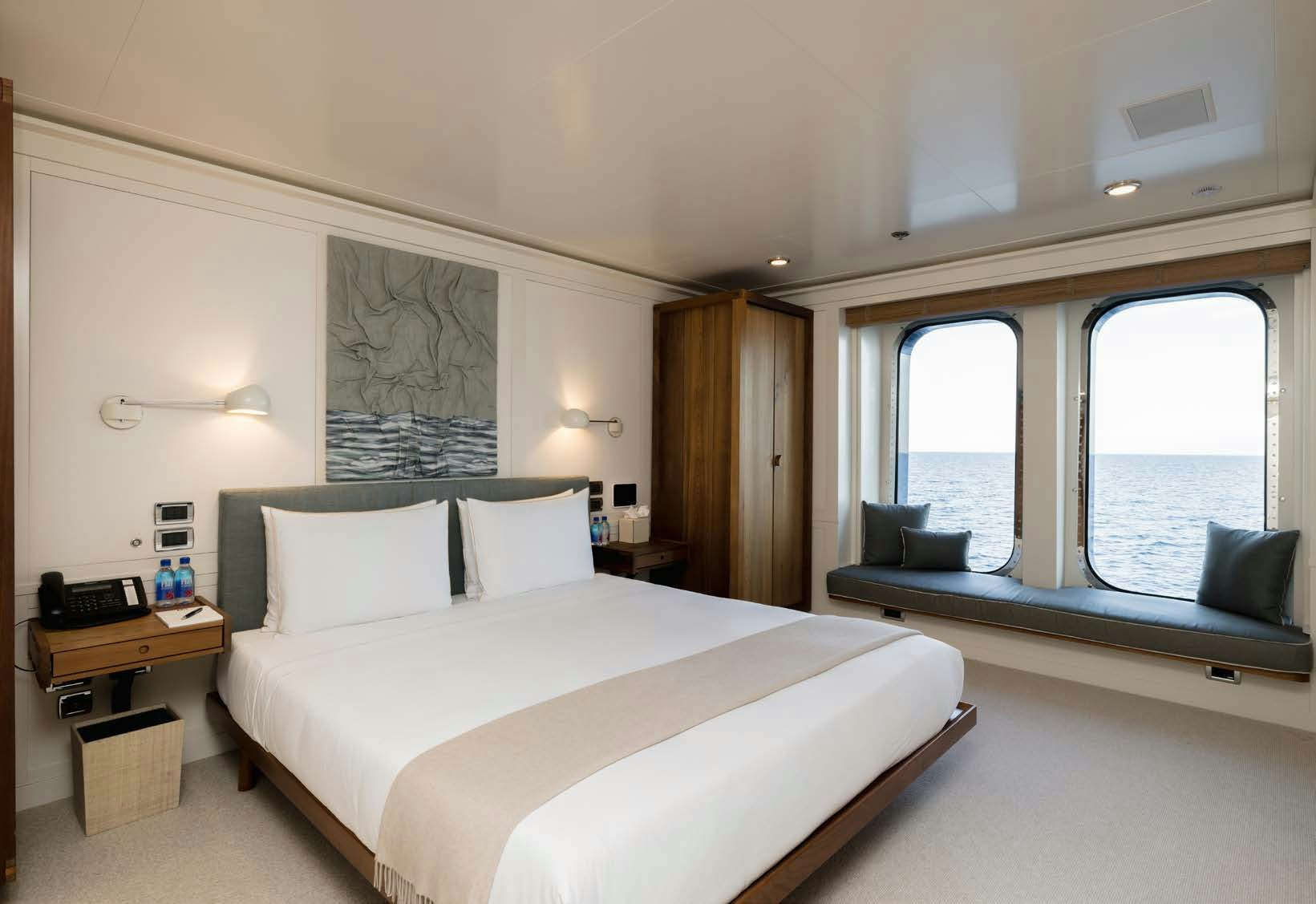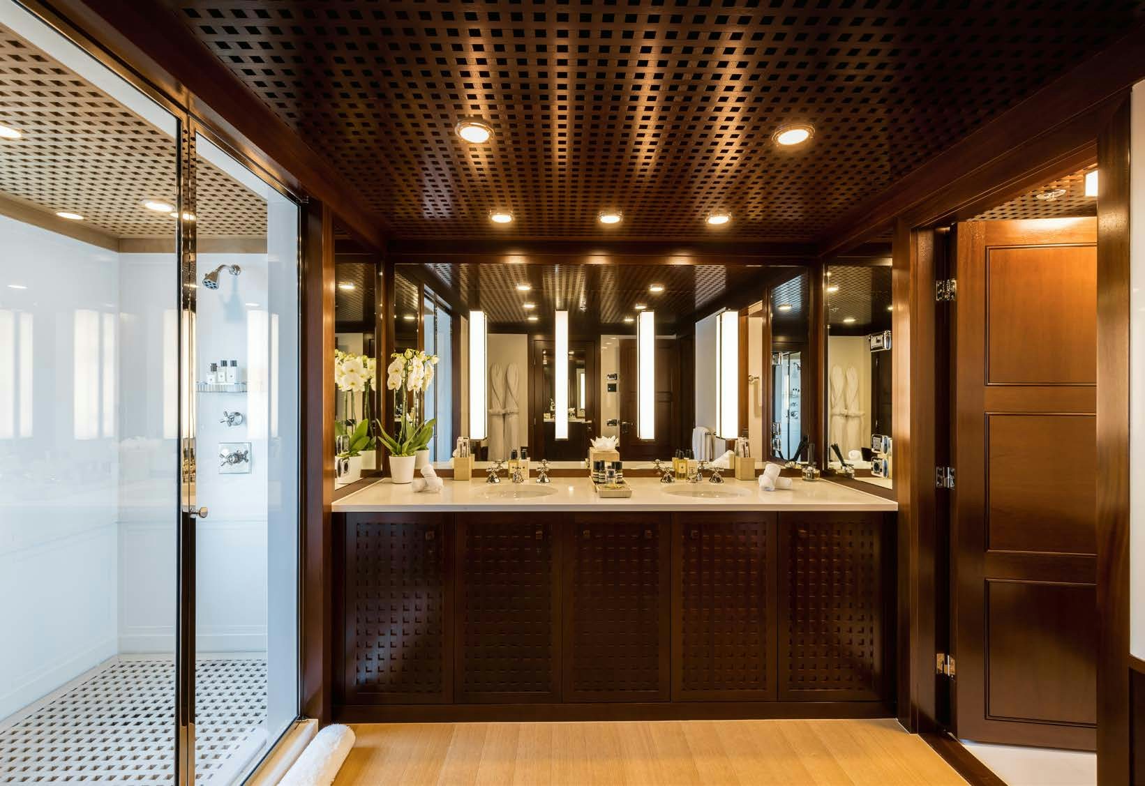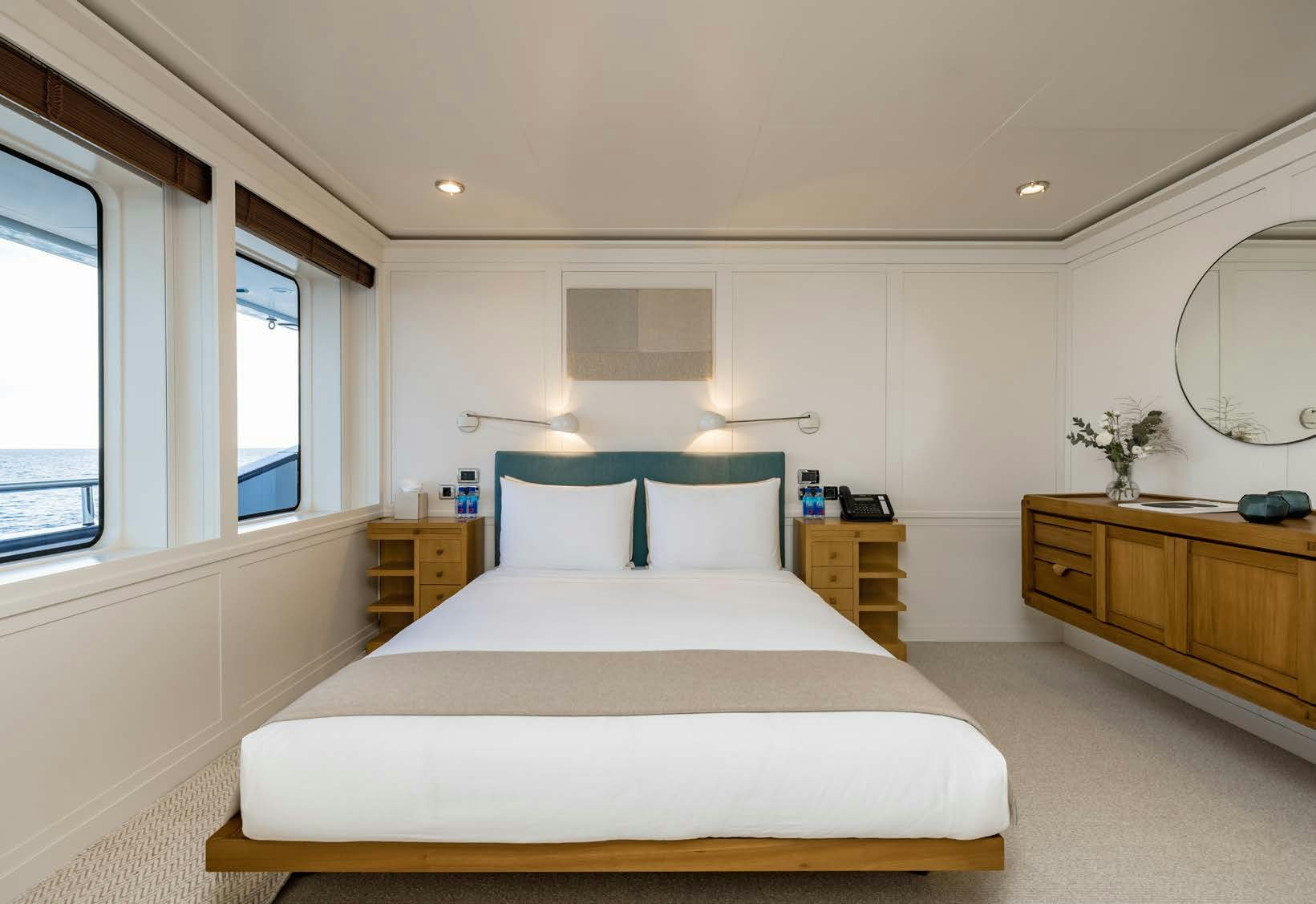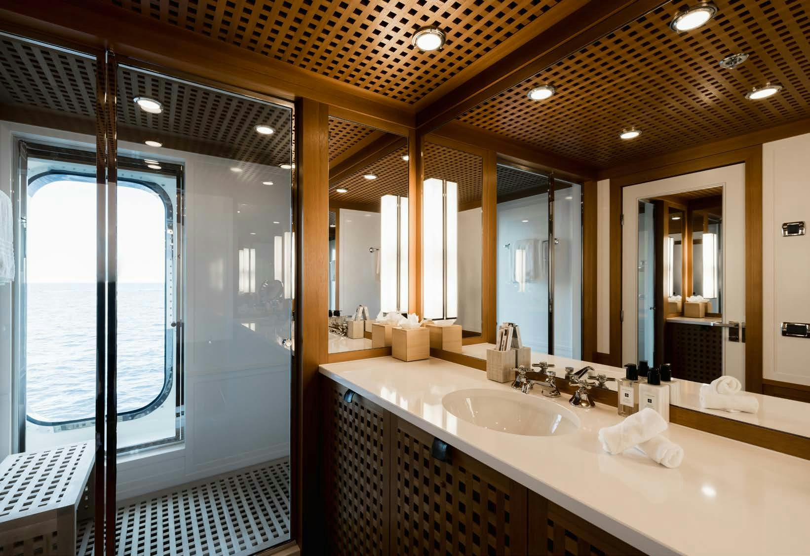 Stepping inside HBC reveals an interior that matches the grandeur of its exterior. With room for up to 22 guests across eleven opulent cabins - including a master stateroom - this yacht offers unrivaled comfort for all aboard. Each cabin features unique design elements that reflect the exquisite taste and attention to detail characteristic of custom models like HBC. The color palette throughout is refined yet inviting, creating an ambiance perfect for relaxation or entertainment.