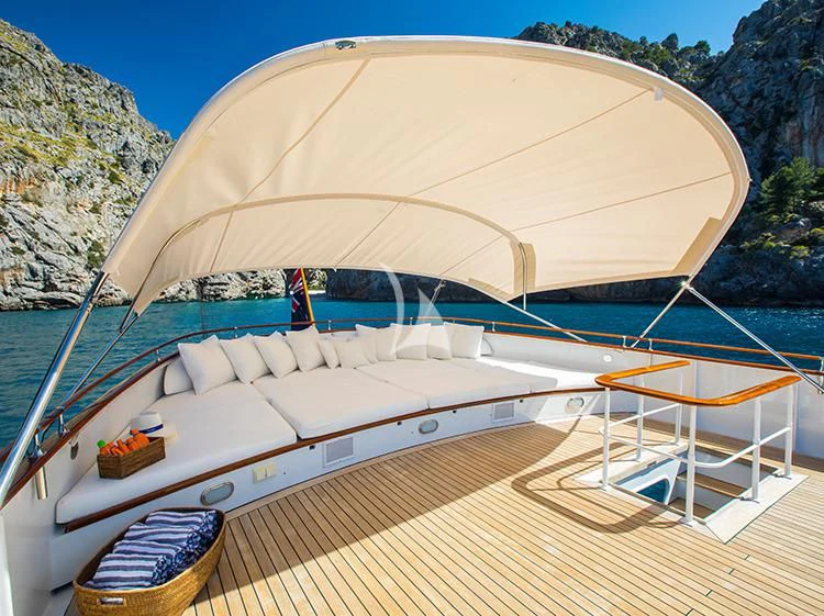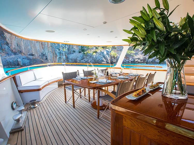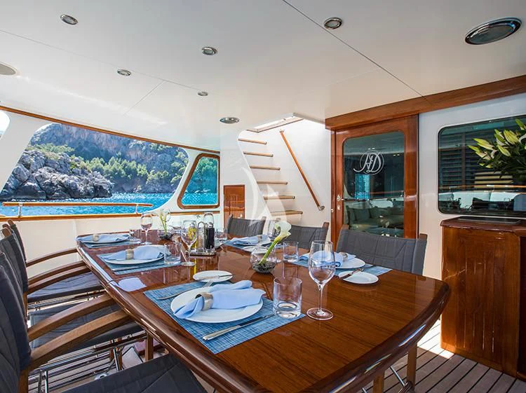 HEAVENLY DAZE's exterior design is truly captivating, showcasing the perfect blend of traditional nautical aesthetics with contemporary elements. Her steel hull glides smoothly through the water at cruising speeds of up to 11.5 knots, while her twin Caterpillar Inc D379 TA engines provide powerful propulsion enabling maximum speeds of up to 13 knots. The yacht's spacious sundecks offer panoramic views of the surrounding seascape, making it an ideal spot for sunbathing or enjoying cocktails under the stars.