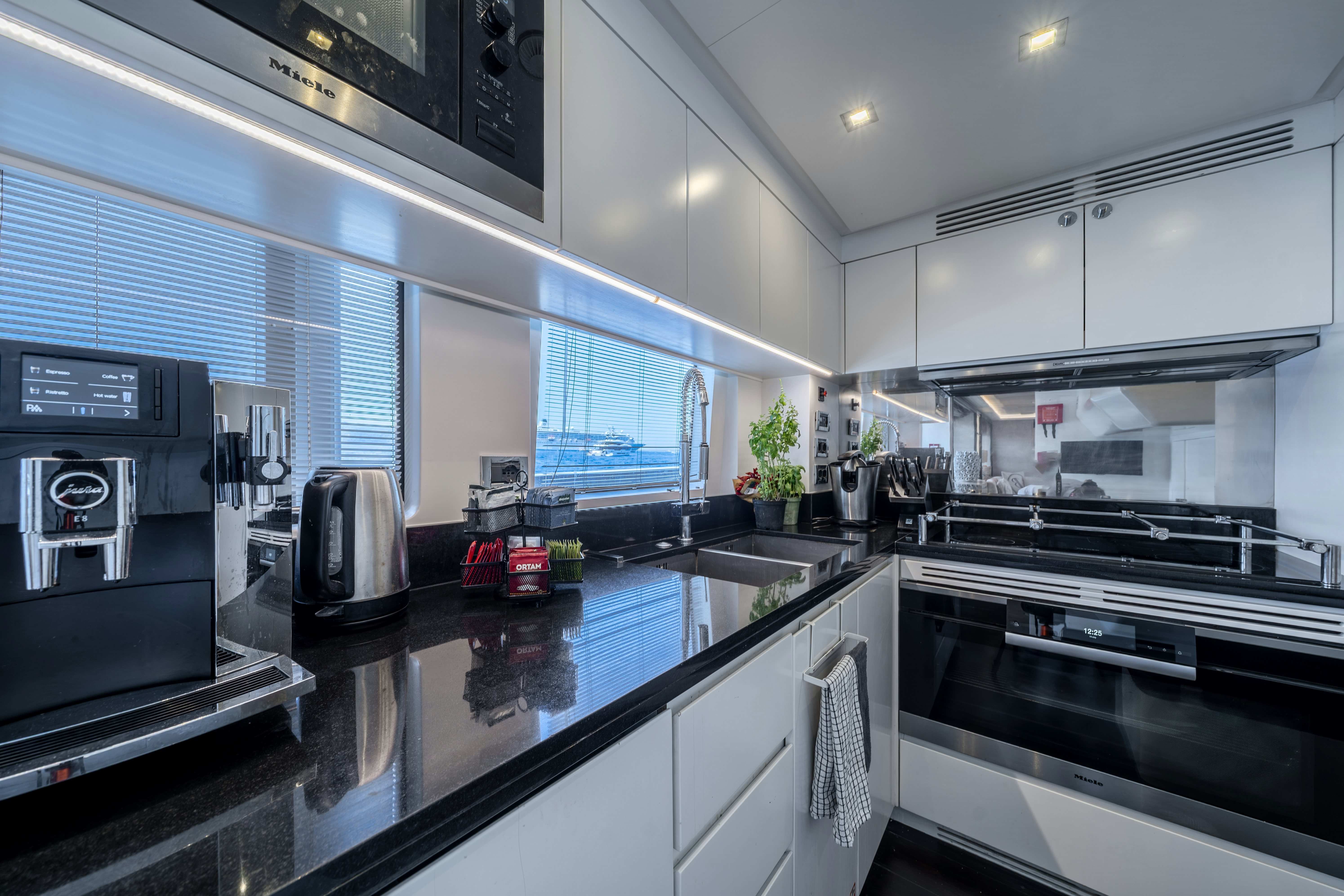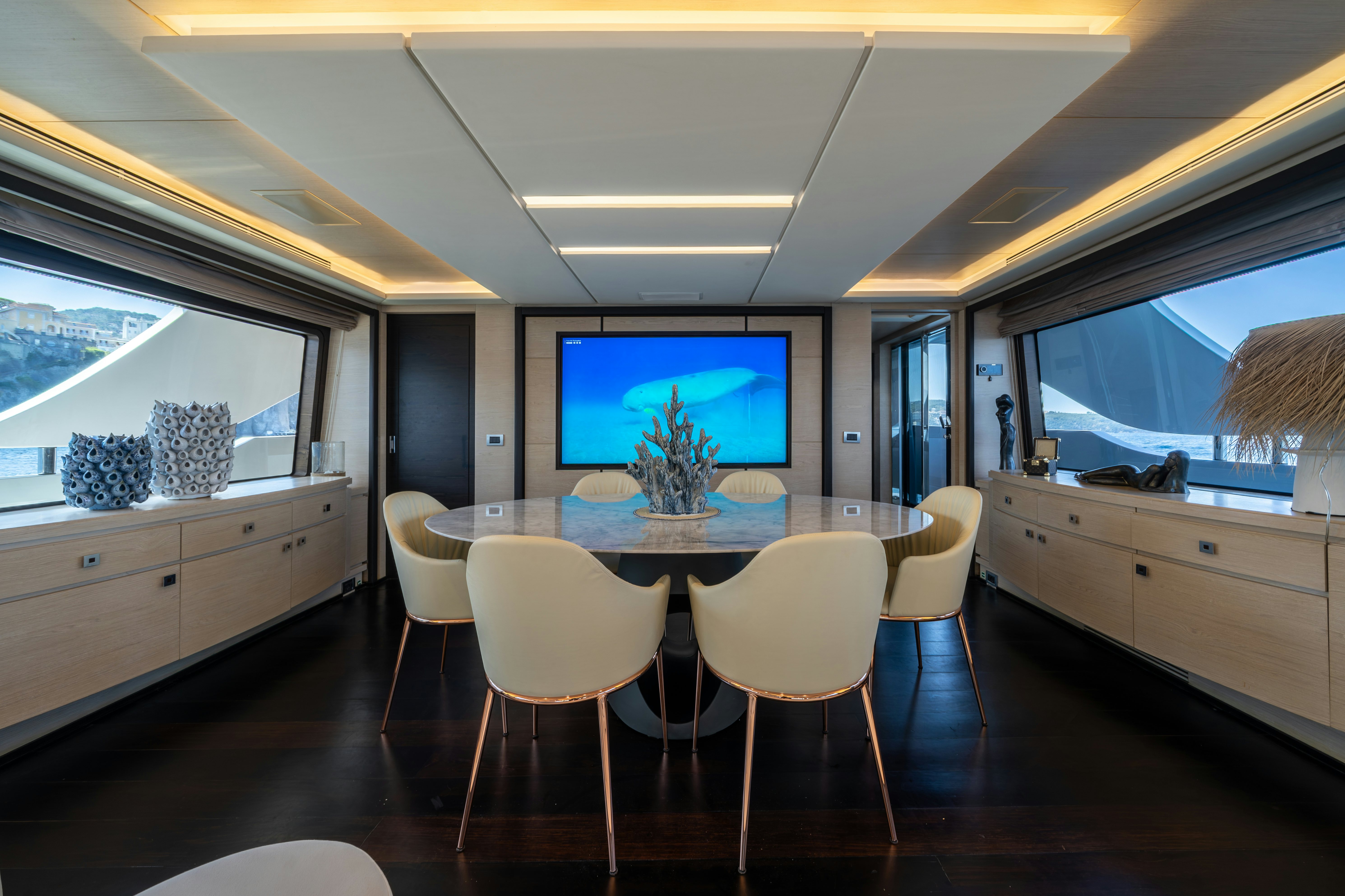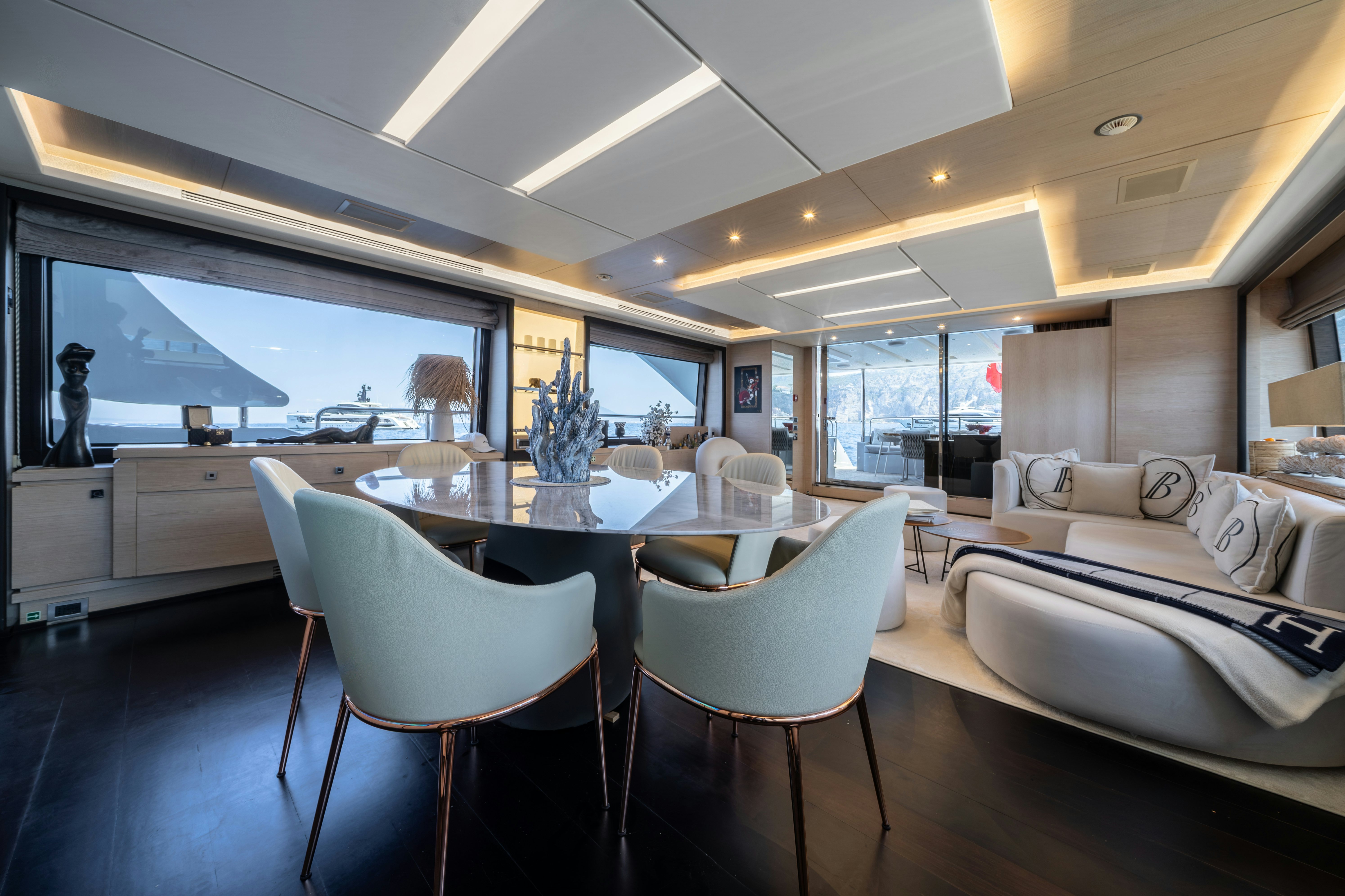 Inside, HORIZON's interior is modern, with light wood tones, clean-lined furnishings and dark accent details throughout. Large hull windows in the salon flood the space with natural light and offer panoramic views. The layout is practical and social, with curved seating in the lounge and an adjacent formal dining area. The galley is equipped with Miele appliances and is designed for discrete crew access.