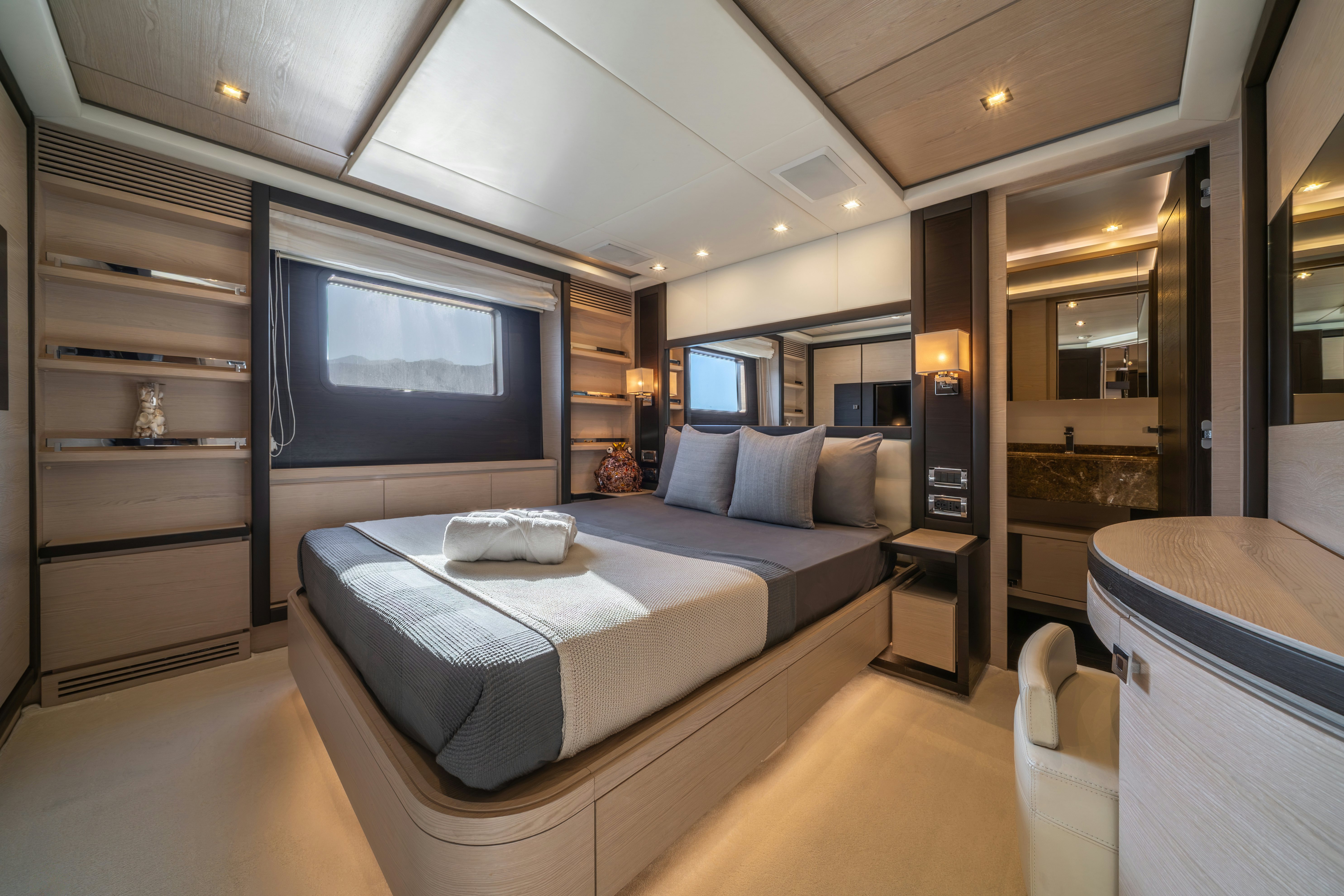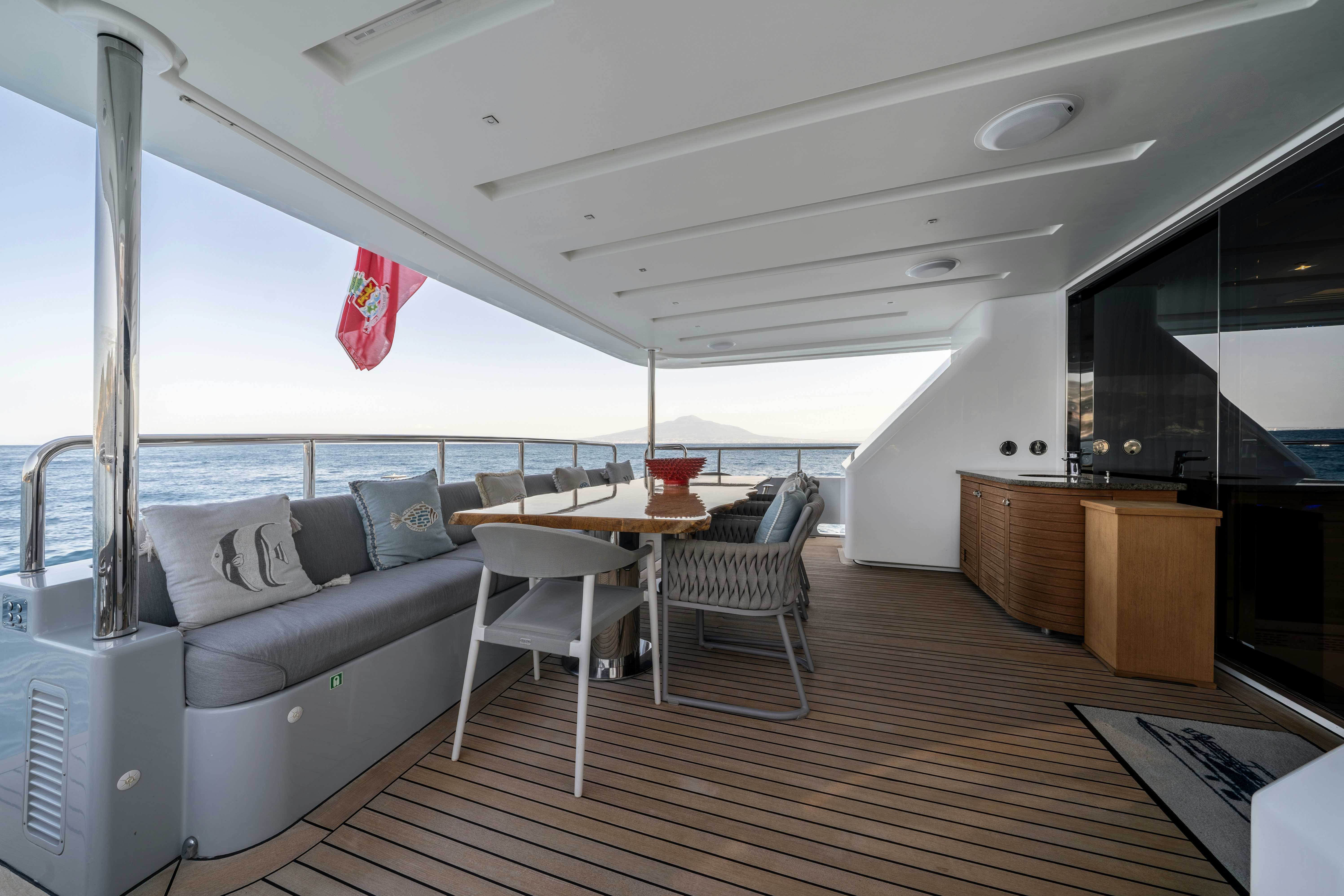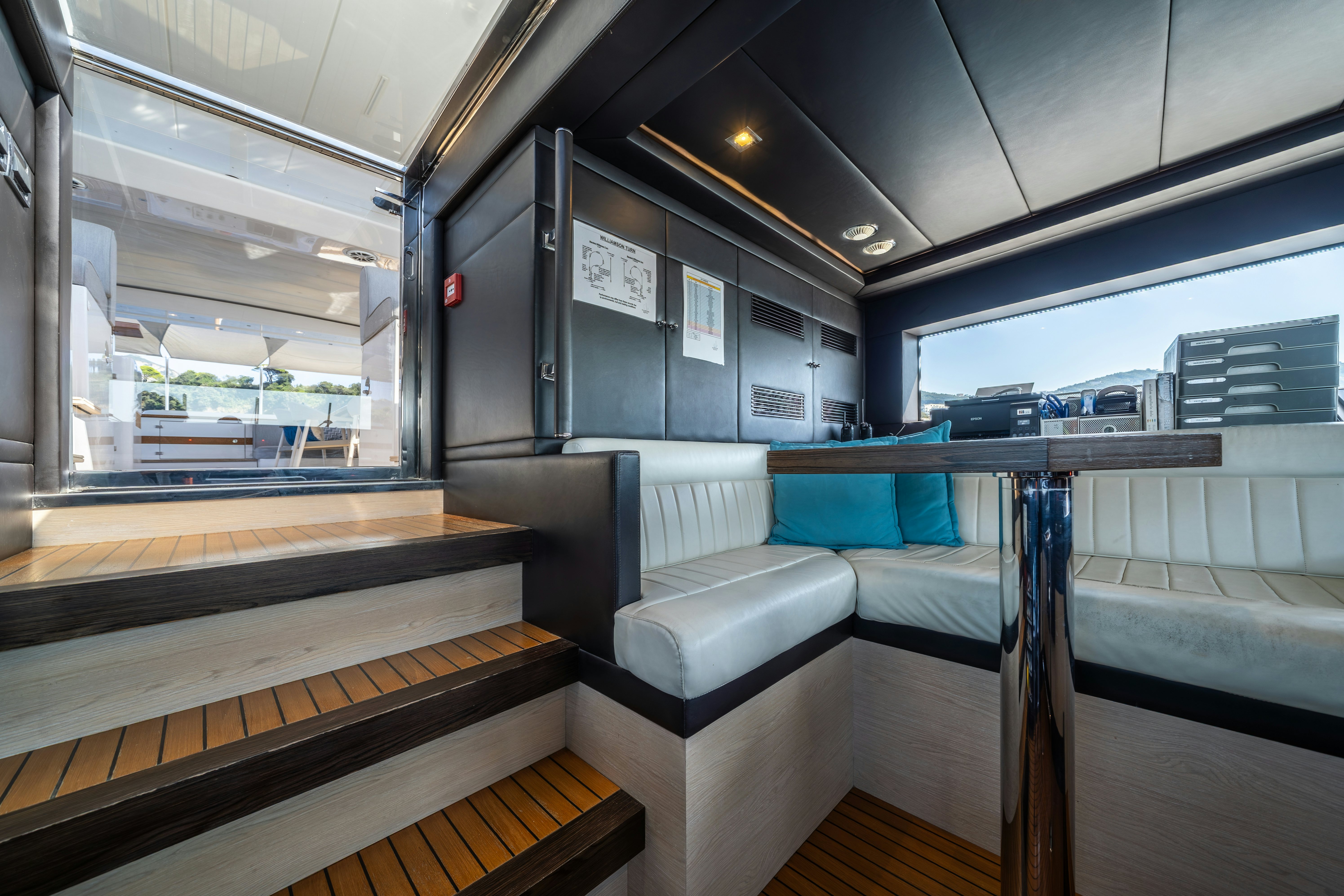 The exterior spaces are well thought out, with multiple areas for relaxing or entertaining. The aft deck is shaded and laid in teak, with a natural wood dining table and built-in aft bench seating. Upstairs, the sundeck features a raised Jacuzzi surrounded by sunpads, twin dining tables with wraparound seating, and a partial hardtop for optional shade.