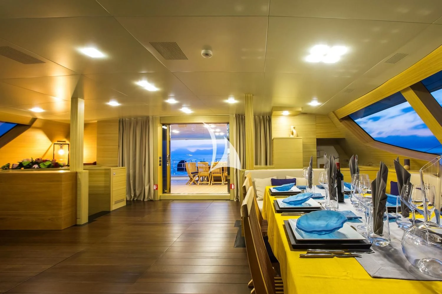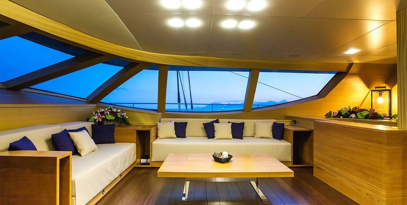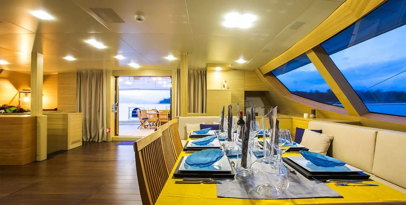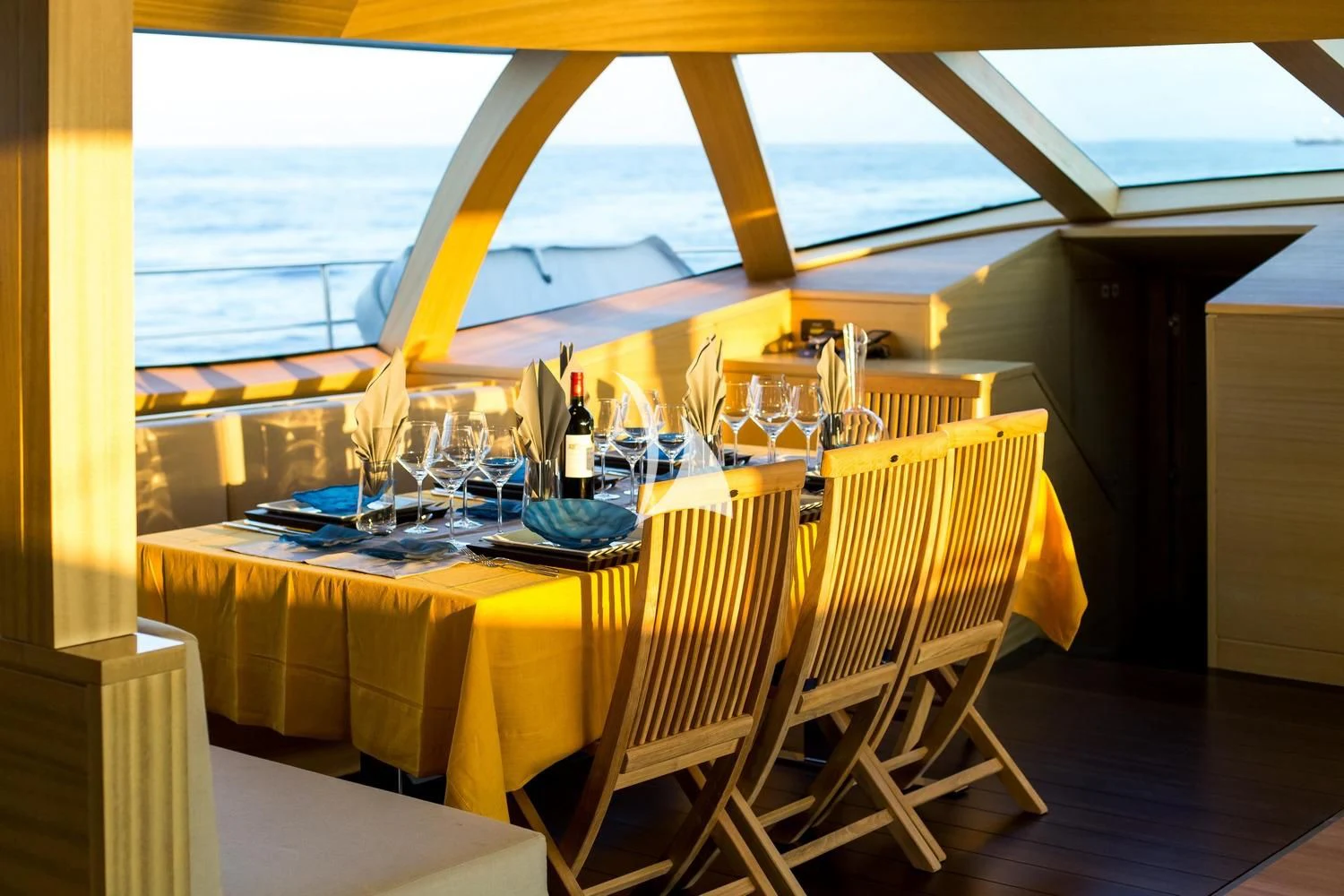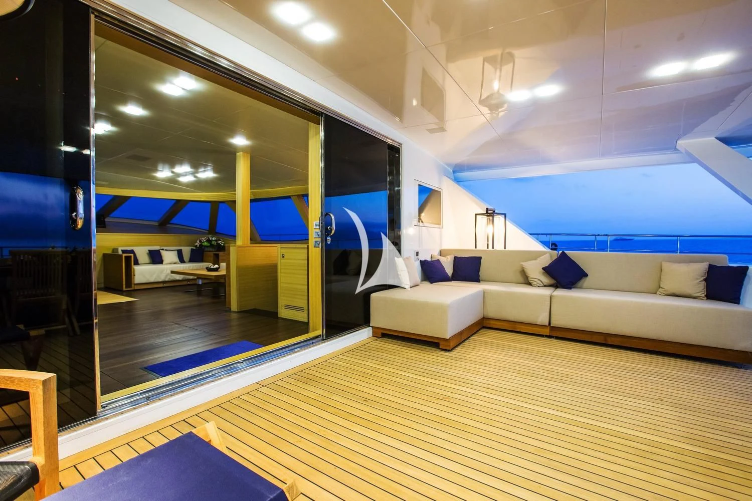 The exterior of MANTANI is as much about function as it is about form. Crafted from durable aluminum, she cuts through the waves with grace and stability, reaching cruising speeds of up to 11 knots and a maximum speed of 12 knots. Her expansive sundecks invite guests to bask under the sun or enjoy alfresco dining with panoramic ocean views. The lounging areas provide ample space for relaxation, making them perfect spots for sunset cocktails or star-gazing sessions.