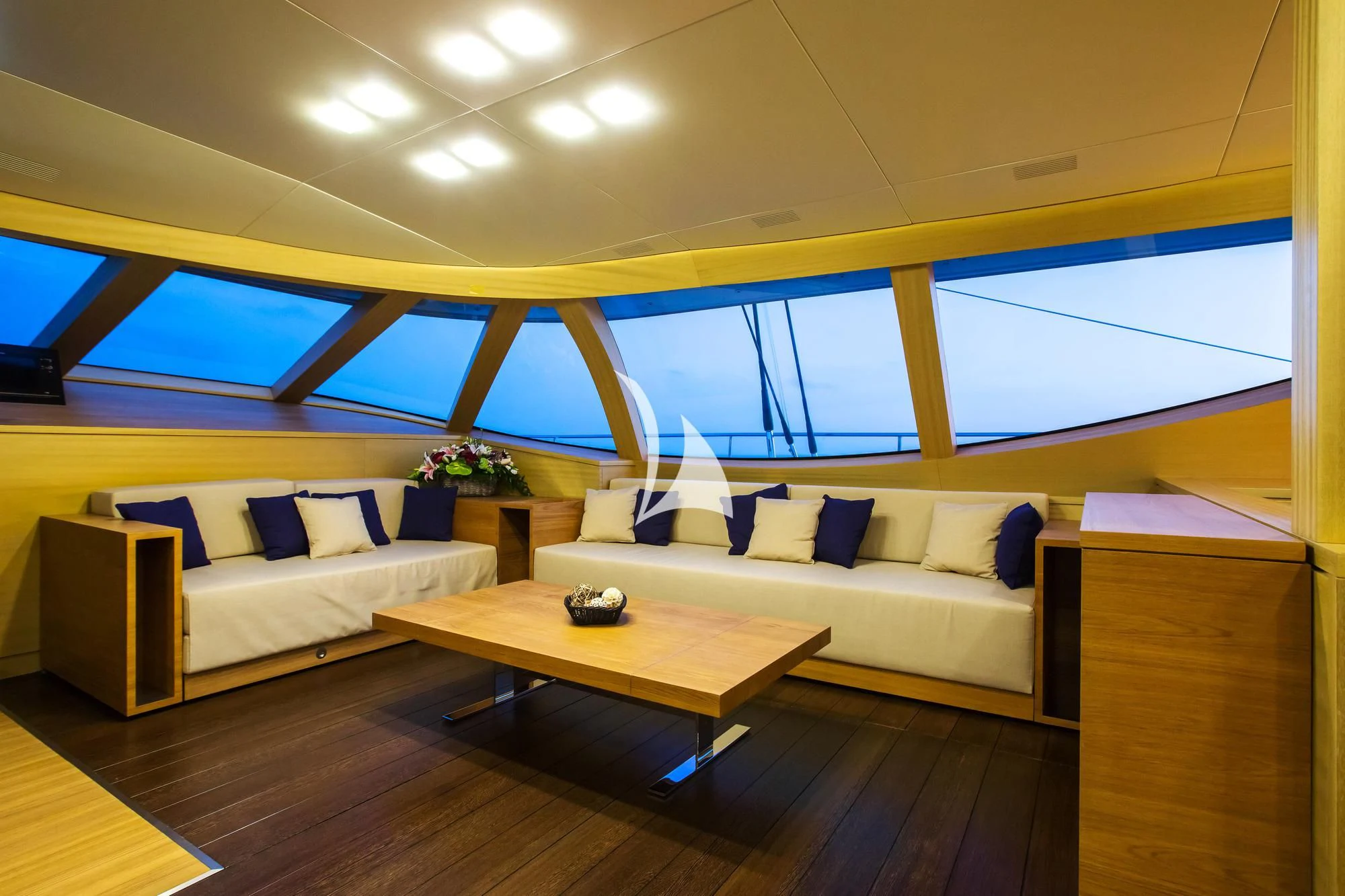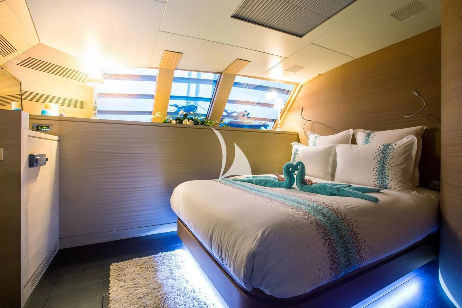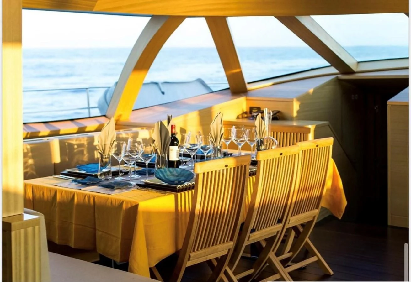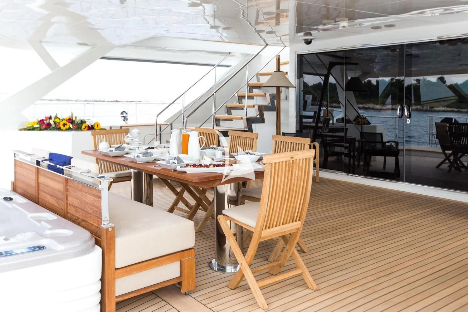 The exterior of MANTANI is as much about function as it is about form. Crafted from durable aluminum, she cuts through the waves with grace and stability, reaching cruising speeds of up to 11 knots and a maximum speed of 12 knots. Her expansive sundecks invite guests to bask under the sun or enjoy alfresco dining with panoramic ocean views. The lounging areas provide ample space for relaxation, making them perfect spots for sunset cocktails or star-gazing sessions.