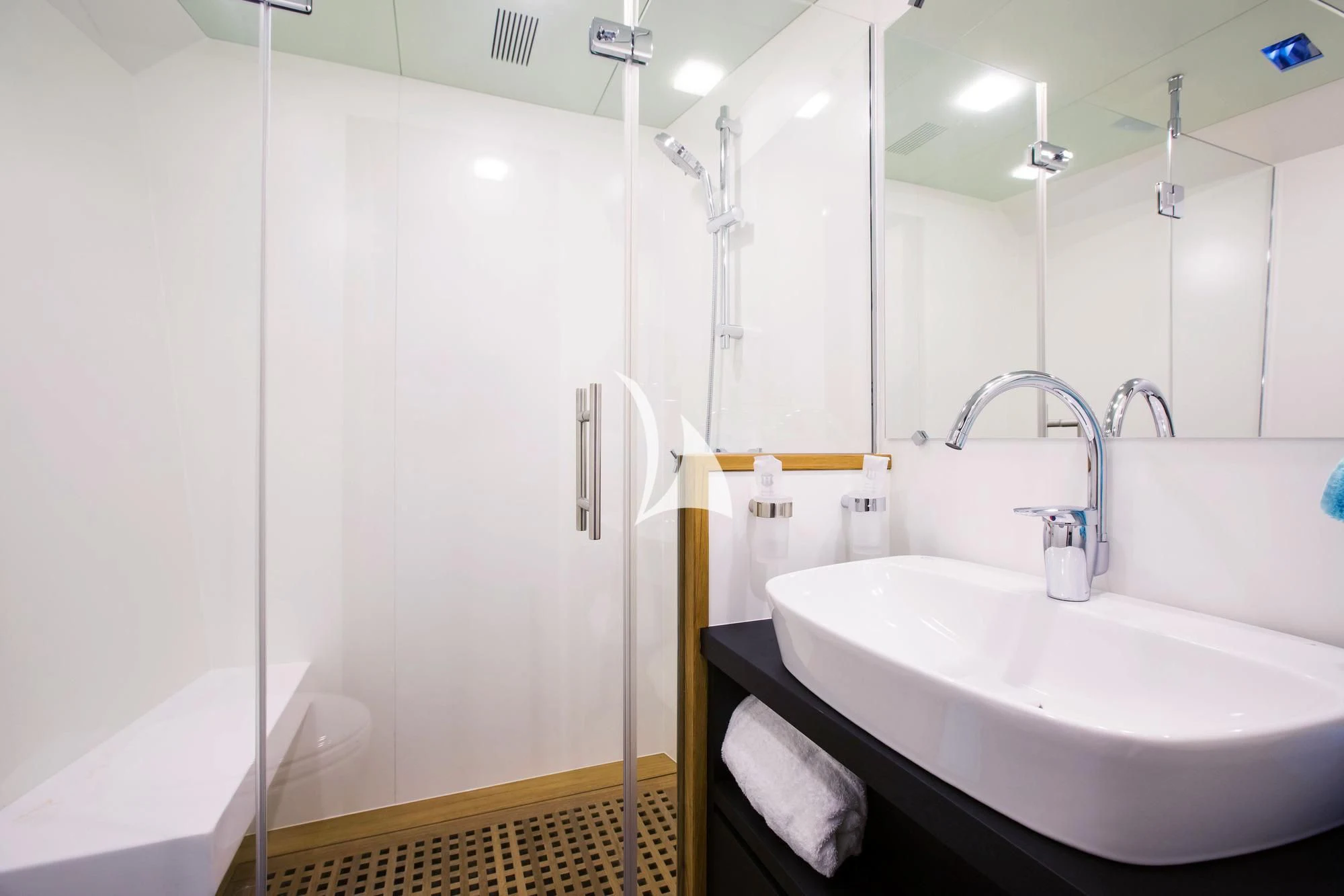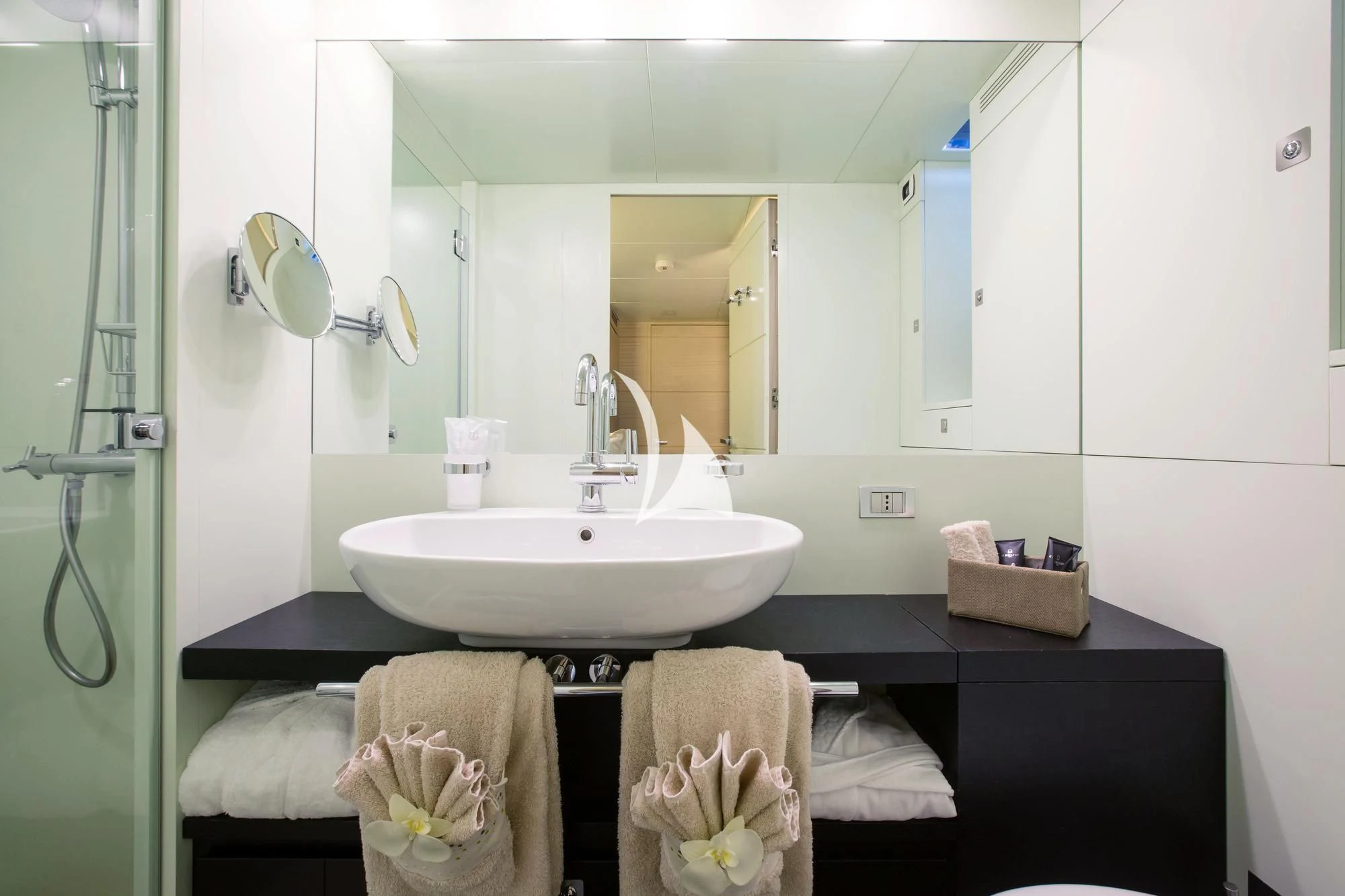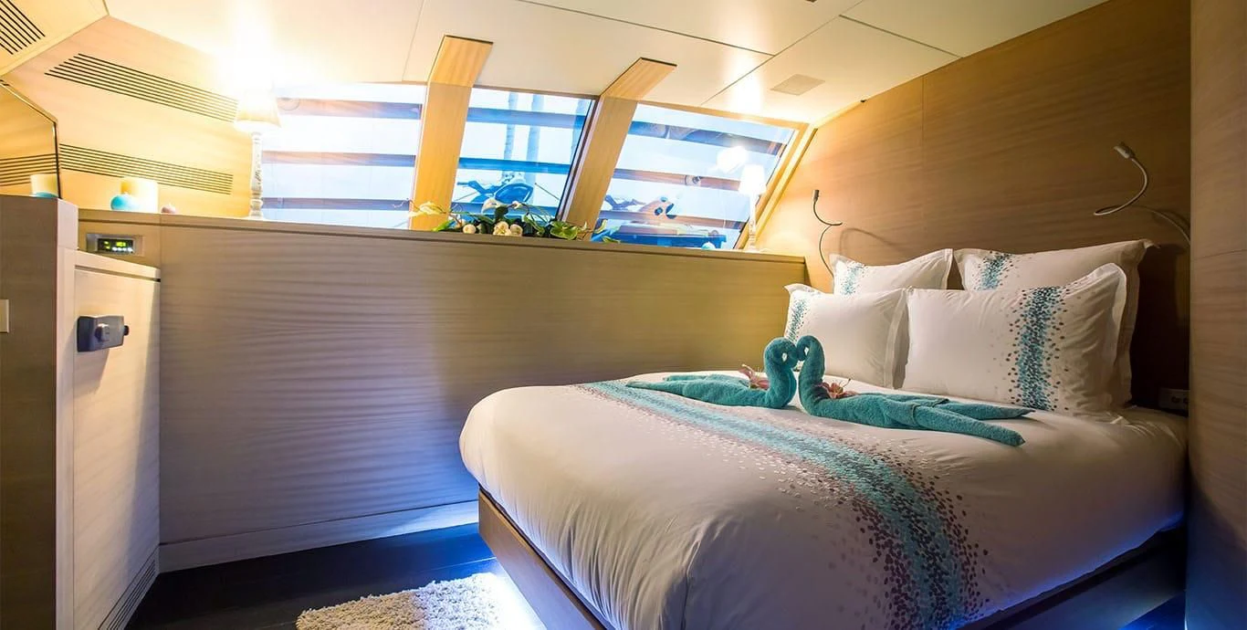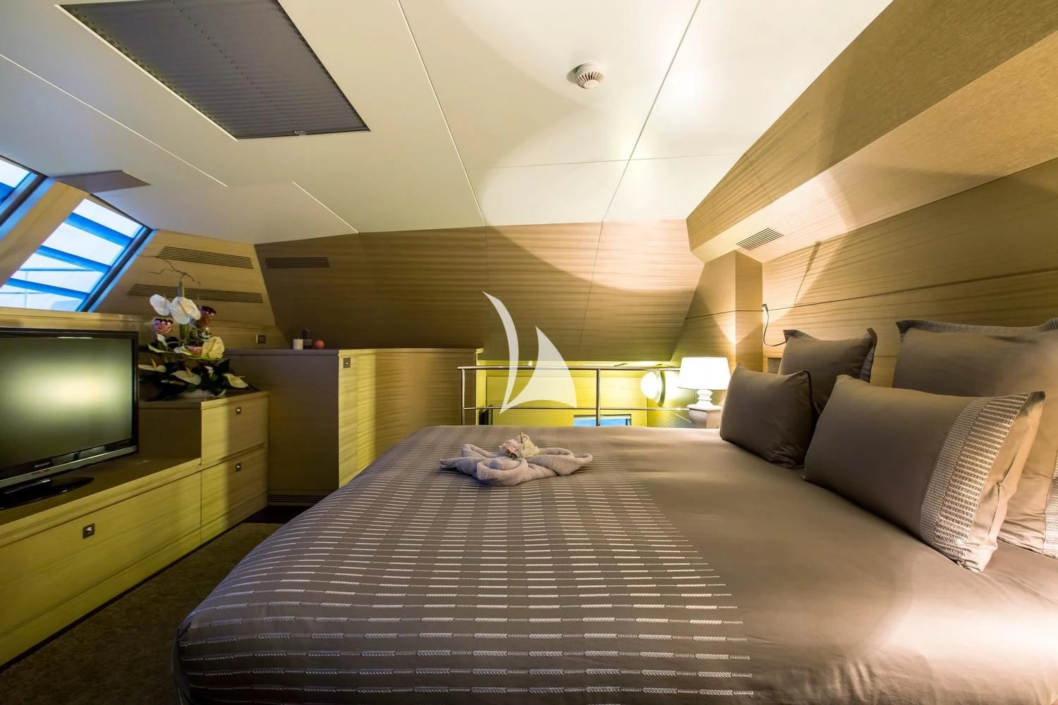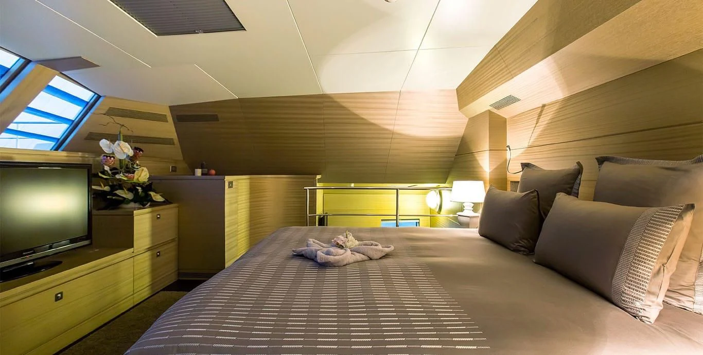 Step inside MANTANI and you are introduced to an interior that exudes elegance and sophistication. The color palette is soothing yet luxurious, creating a warm ambiance throughout her living spaces. Three exquisite cabins comfortably accommodate six guests while ensuring privacy and tranquility during your voyage. Each cabin has been meticulously designed to offer ultimate comfort paired with unparalleled luxury. The master stateroom stands out with its lavish décor, spacious layout, and state-of-the-art amenities.