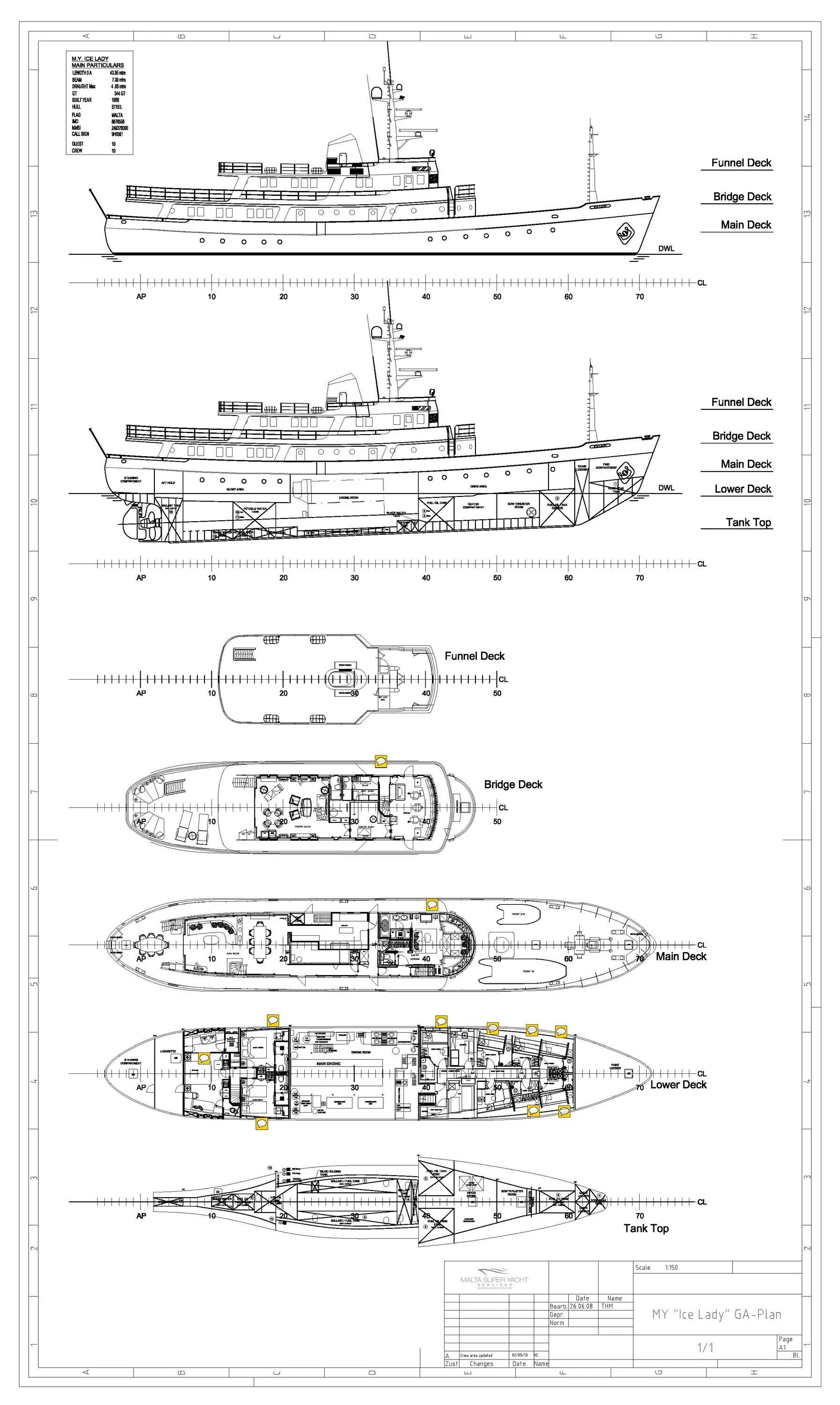 The machinery powering this magnificent vessel includes one Werkspoor engine boasting an impressive power output of 1800 hp /1342 kW enabling her seamless navigation through tranquil waters or braving turbulent seas alike. In terms of tank capacities – ICE LADY features holding tanks capable of storing up to 427 gallons while her freshwater capacity extends up to a staggering 4383 gallons – ensuring extended voyages without frequent stops for replenishment.