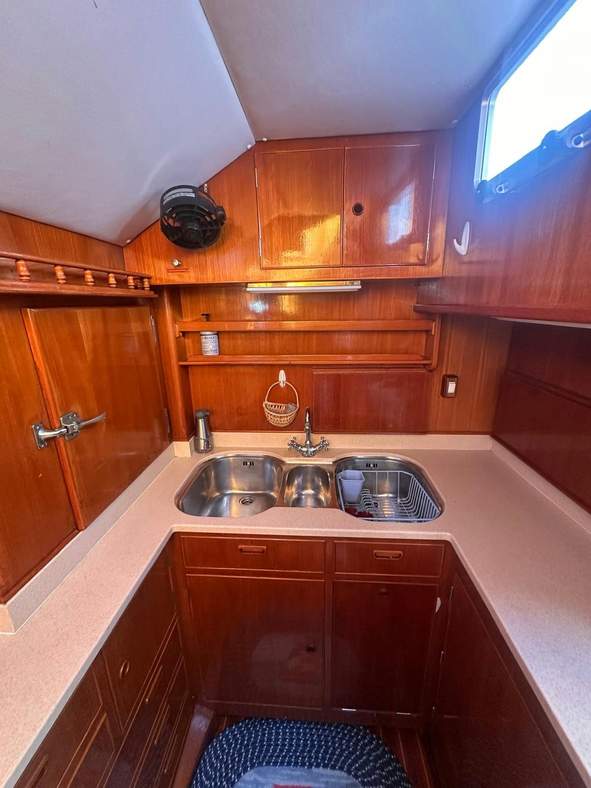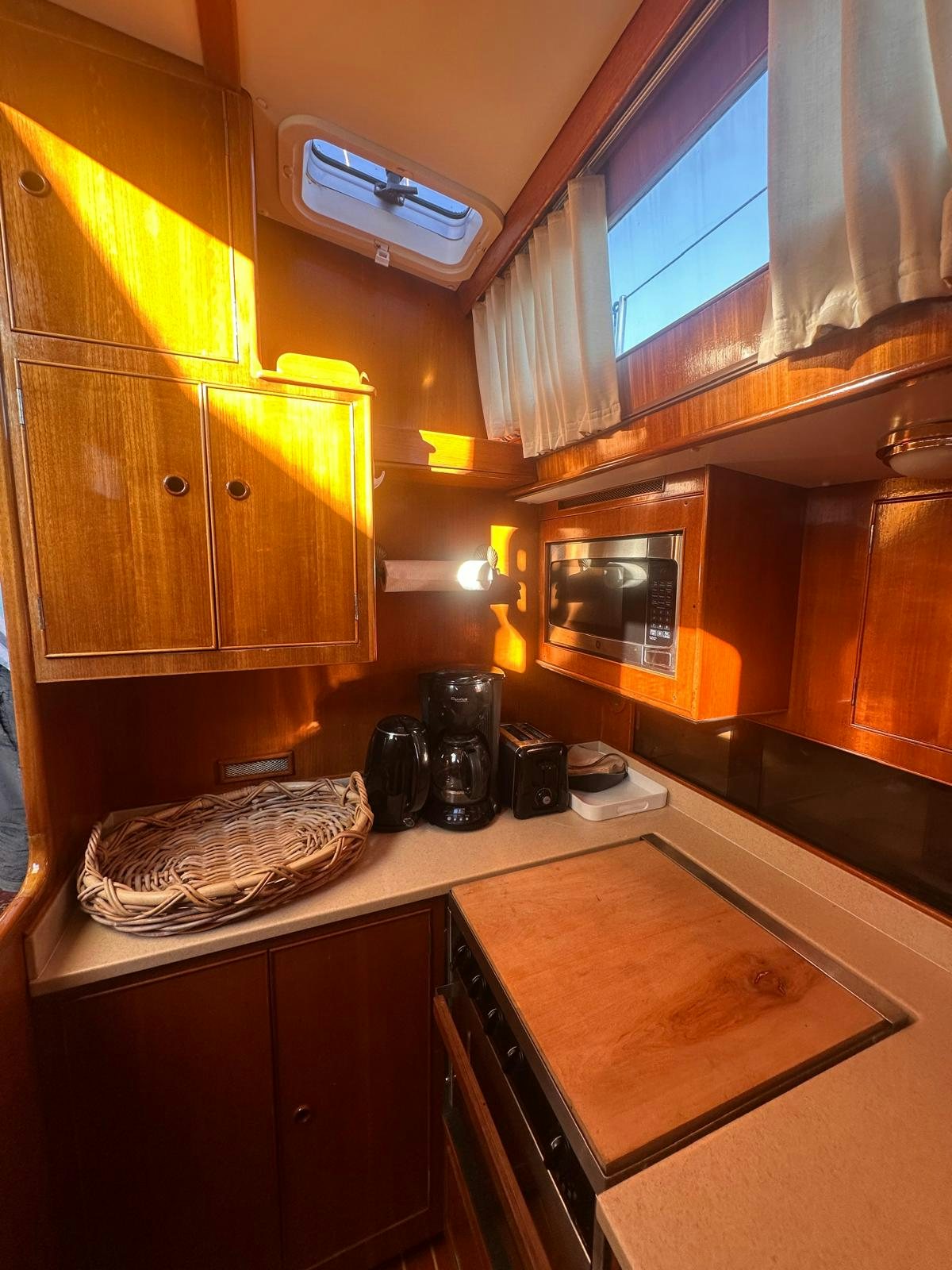 The galley, located starboard aft of the salon, is equally impressive. Upgraded during the refit, it includes Corian countertops, a Force 10 four-burner gimbaled stove with oven, microwave/convection oven, and a Grunert refrigeration system. Additional features include stainless-lined fridge and dual-compartment freezer, three-bay stainless sink, and ample storage, all laid out in a secure step-down workspace flooded with natural light.