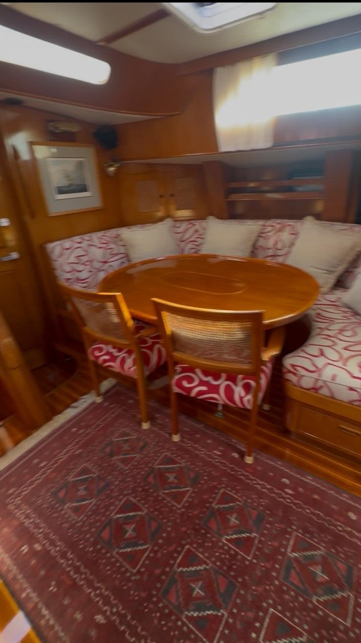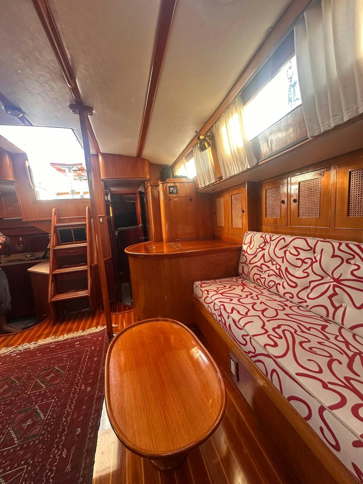 The interior showcases classic elegance, with rich teak joinery, brass reading lamps, teak-and-holly soles, and wicker-paneled cabinetry. The spacious main salon welcomes sunlight and features a curved built-in dining table and additional chairs, along with a navigation station, upholstered settee, cocktail table, and dry bar with custom cabinetry and liquor dispenser.