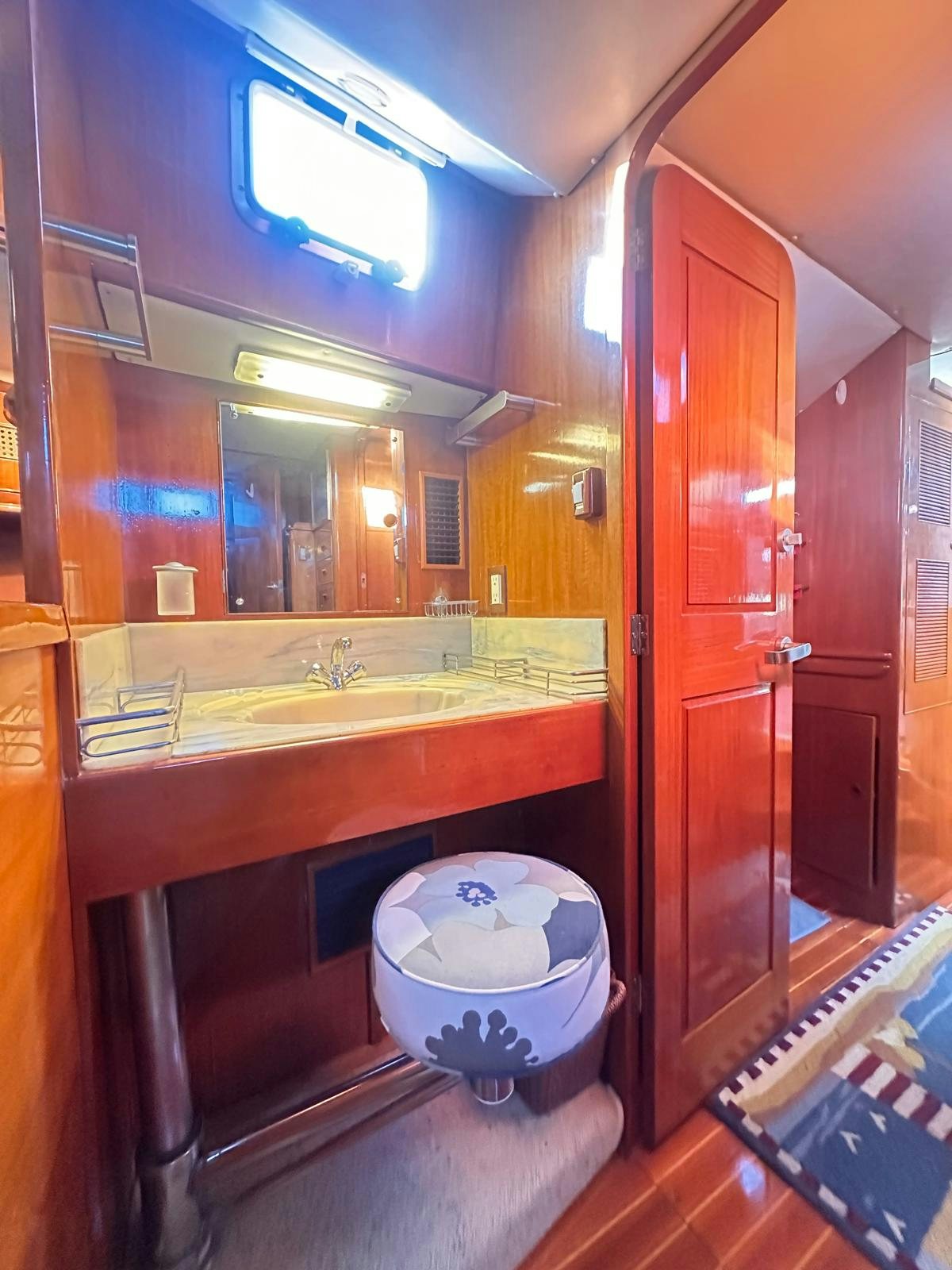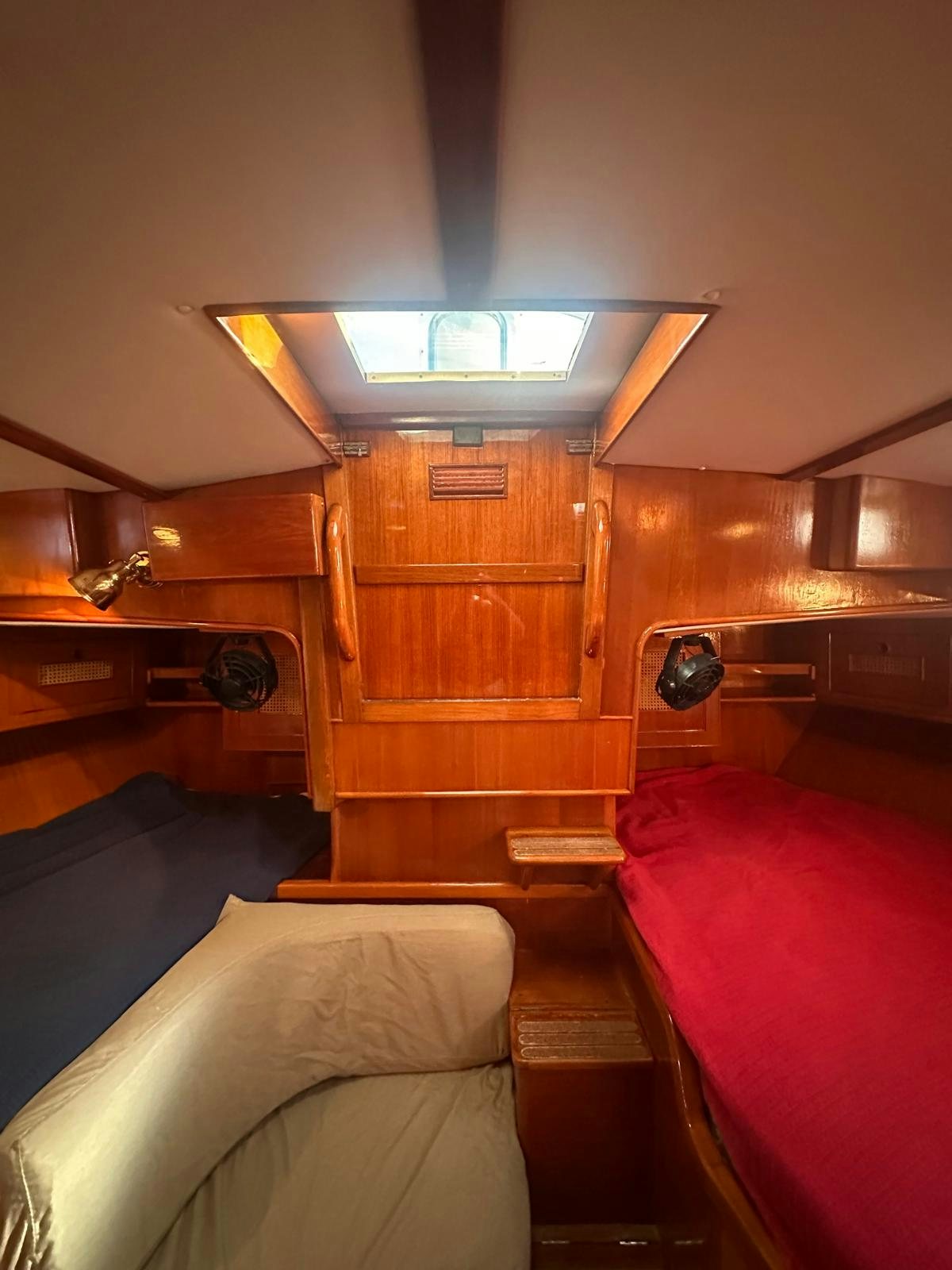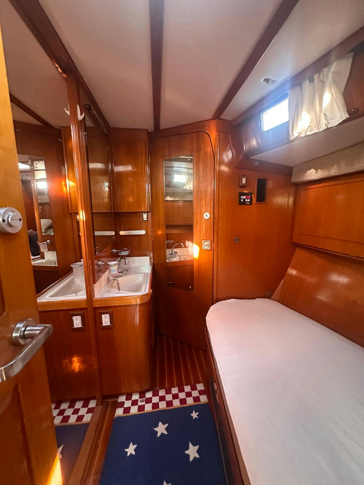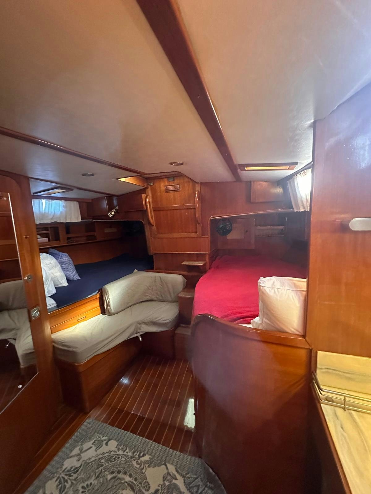 Below deck, II offers three staterooms for seven guests and accommodations for one crew member. The full-beam master suite lies aft, featuring a double berth to port, single berth with L-shaped settee to starboard, marble vanity with sink, en-suite head, and separate shower stall. A private companionway provides direct access to the helm cockpit, a rare and desirable feature on a yacht of this size. Forward of the salon, two mirror-image guest cabins each include a double berth, Pullman single berth, marble vanity with sink, and can be combined into a large VIP suite via a removable centerline partition. The forward cabin serves as crew quarters, complete with separate deck access, making her ideal for charter configurations.