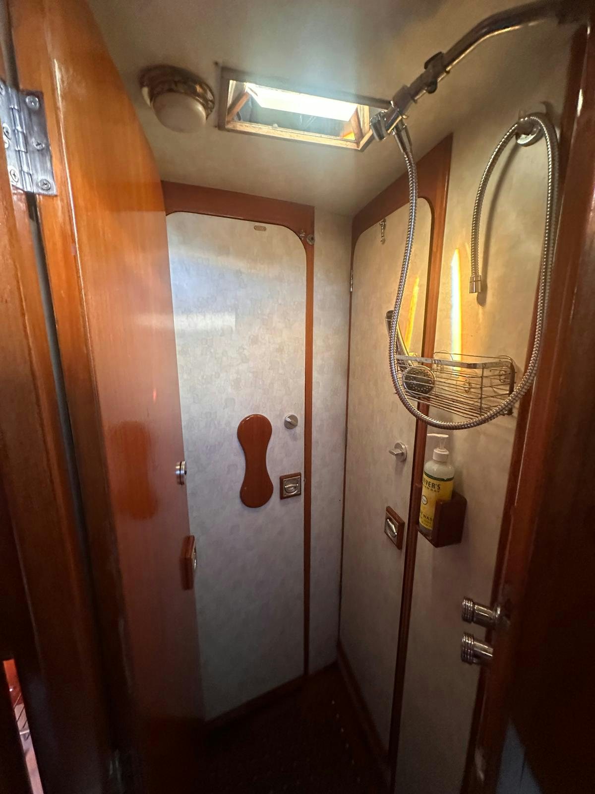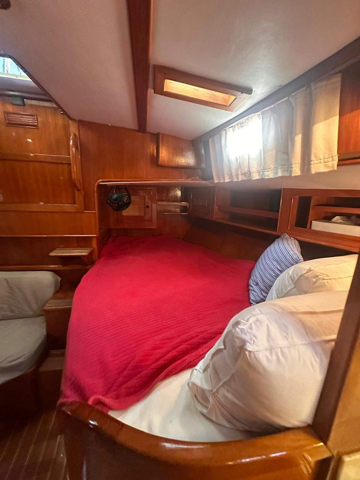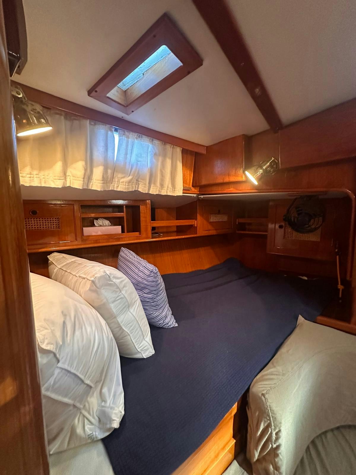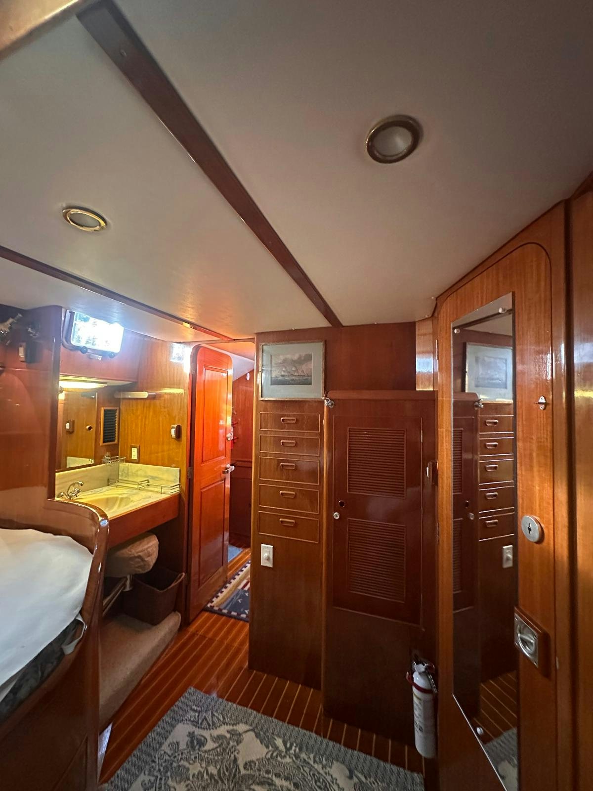 Below deck, II offers three staterooms for seven guests and accommodations for one crew member. The full-beam master suite lies aft, featuring a double berth to port, single berth with L-shaped settee to starboard, marble vanity with sink, en-suite head, and separate shower stall. A private companionway provides direct access to the helm cockpit, a rare and desirable feature on a yacht of this size. Forward of the salon, two mirror-image guest cabins each include a double berth, Pullman single berth, marble vanity with sink, and can be combined into a large VIP suite via a removable centerline partition. The forward cabin serves as crew quarters, complete with separate deck access, making her ideal for charter configurations.