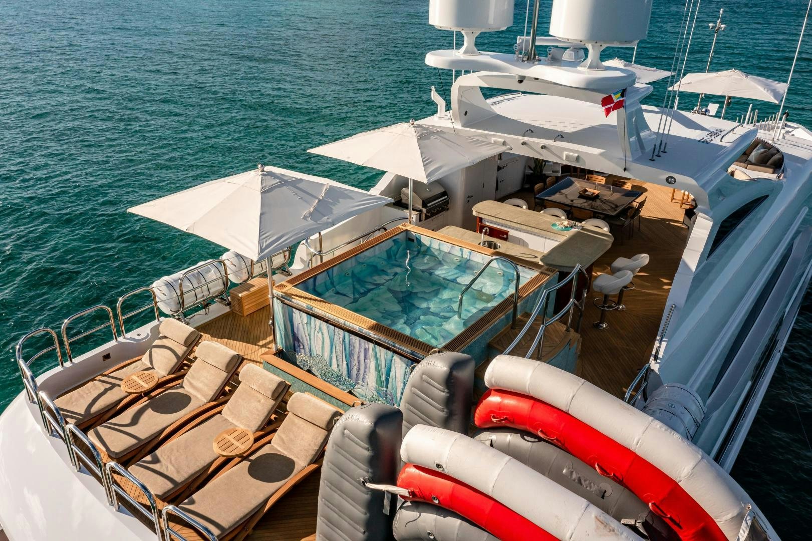 The luxury yacht’s stunning sundeck is the ideal place for guests to gather together. The centerpiece of this impressive area is her custom, raised waterfall Jacuzzi for 12, with intricate tilework and steps to enter from both sides. The space also showcases a large outdoor bar with seating for five, a barbeque and a dayhead. The large dining table encourages alfresco dining under the stars. Forward and aft chaise loungers flank the perimeter of the sundeck, along with an oversized sunpad and built-in seating areas.