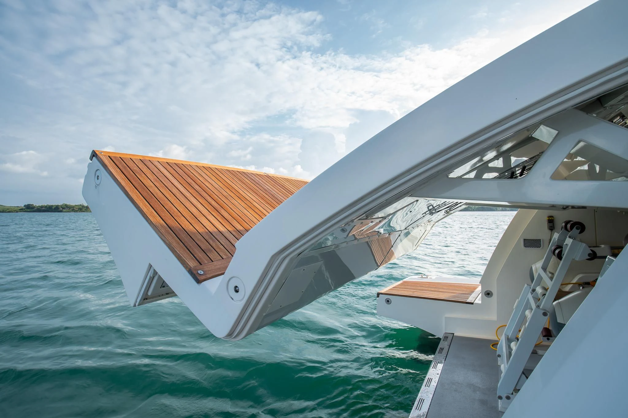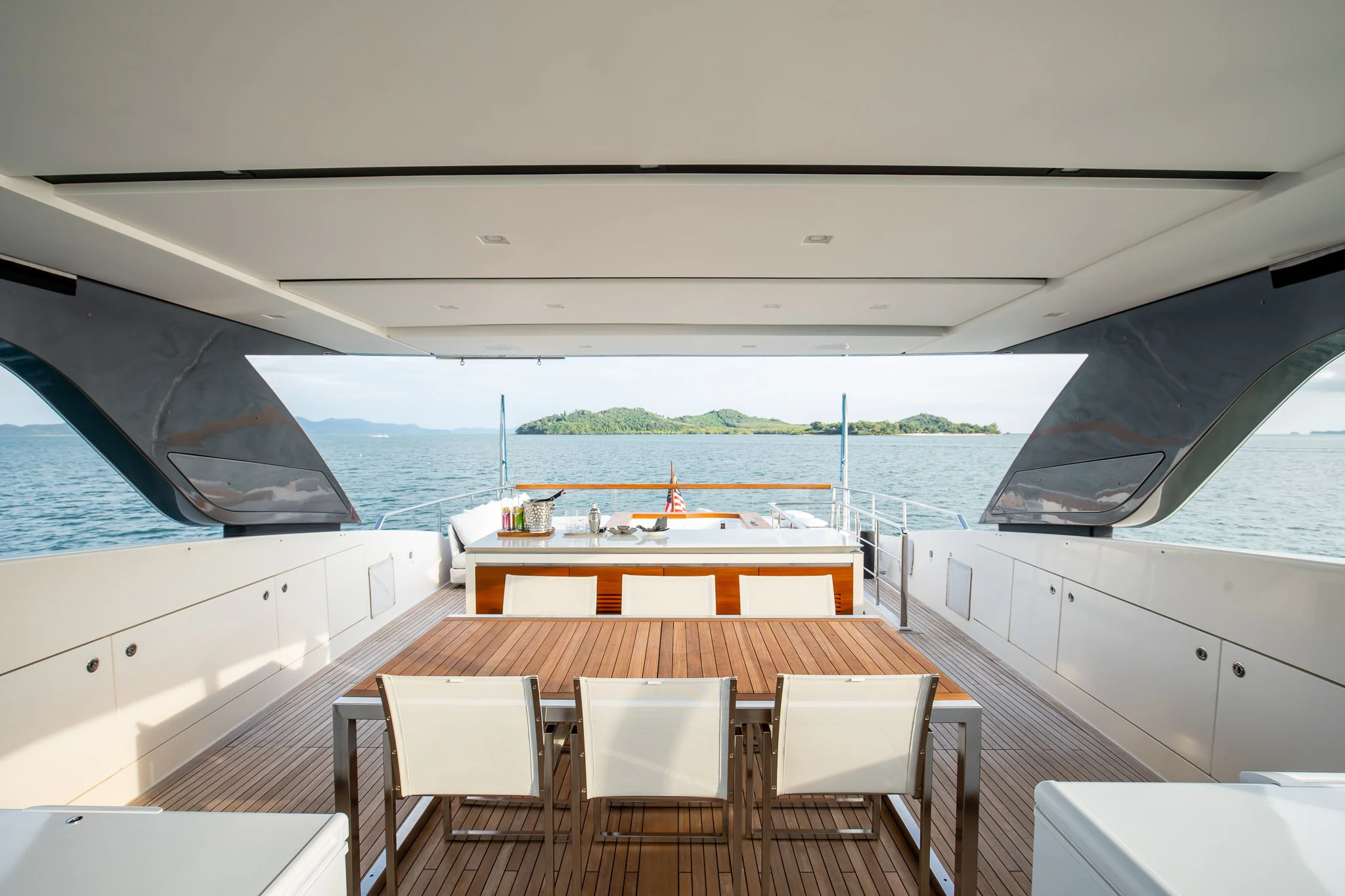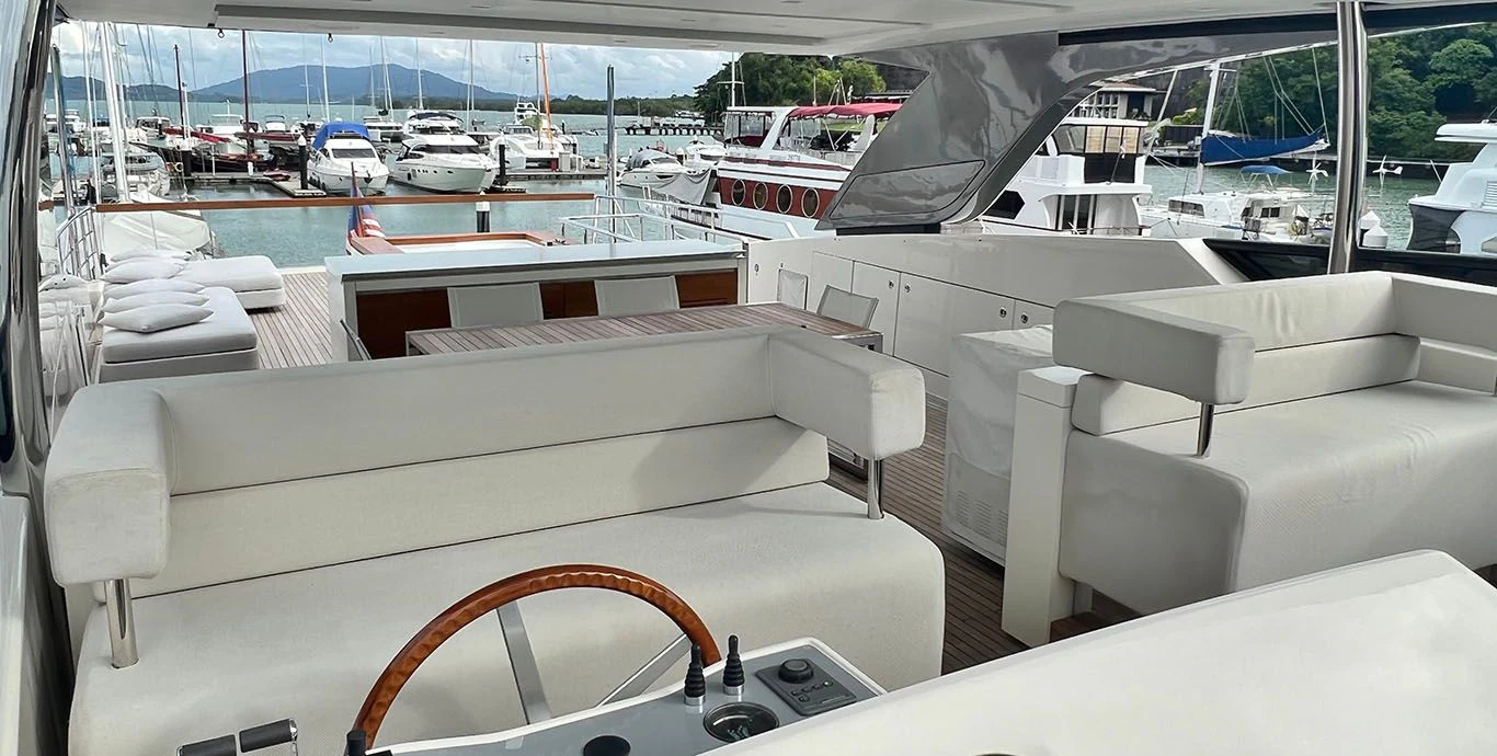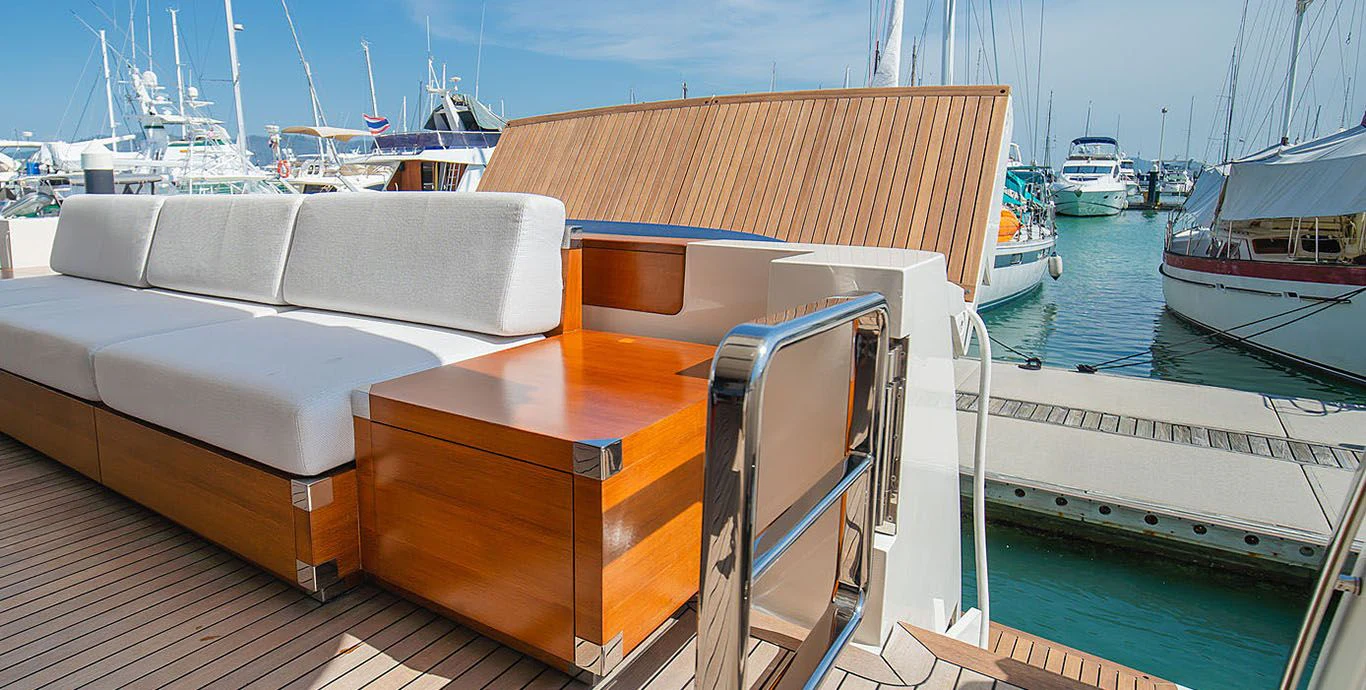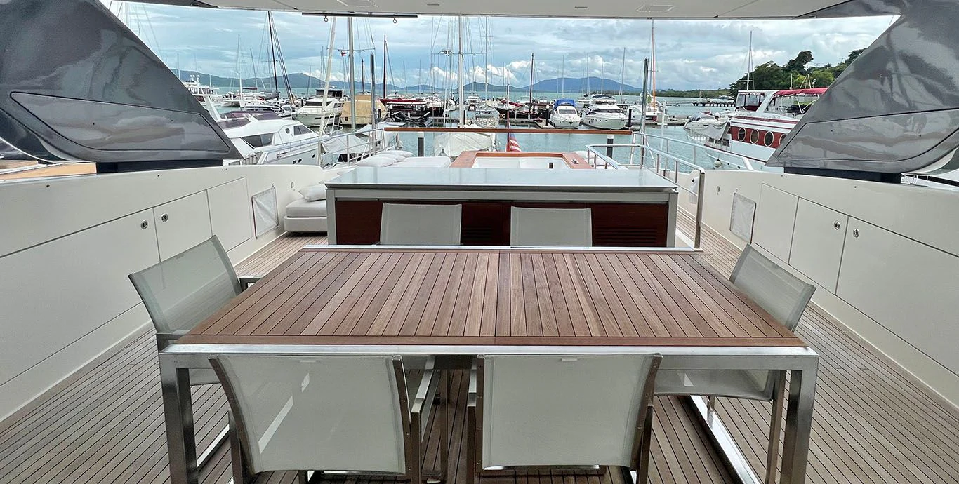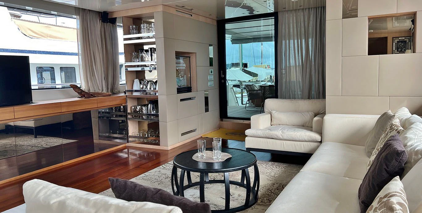 INDIGO's exterior design is every bit as compelling as her impressive statistics suggest. Her GRP hull material is not only robust but also pleasingly sleek and elegant. The beam measures at about 7.05 meters or roughly 24 feet and two inches, providing ample space for guests to enjoy their time on board while basking in panoramic ocean views. The yacht's maximum draft stands at around two meters or roughly six feet seven inches, ensuring smooth sailing even in shallow waters.