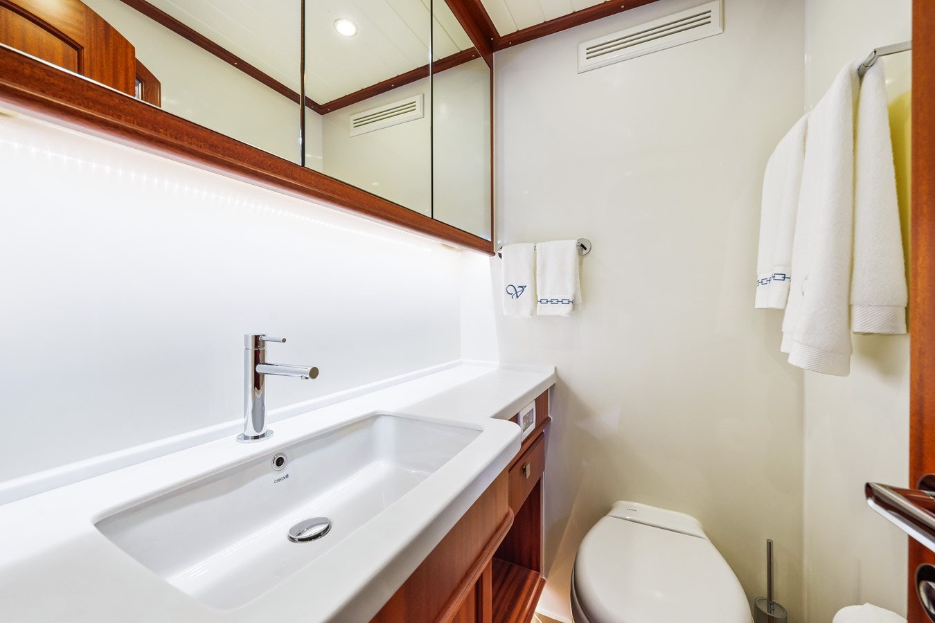 Step into the salon from the aft deck and you're met with handcrafted mahogany doors that swing open effortlessly. Twin couches to port and starboard create a welcoming lounge, and both sides feature their own built-in Fusion audio systems. Forward-looking seating at both the port side and starboard helm positions ensures everyone gets a front-row view, whether underway or at anchor. The Starlink system is already installed, so you're always connected.