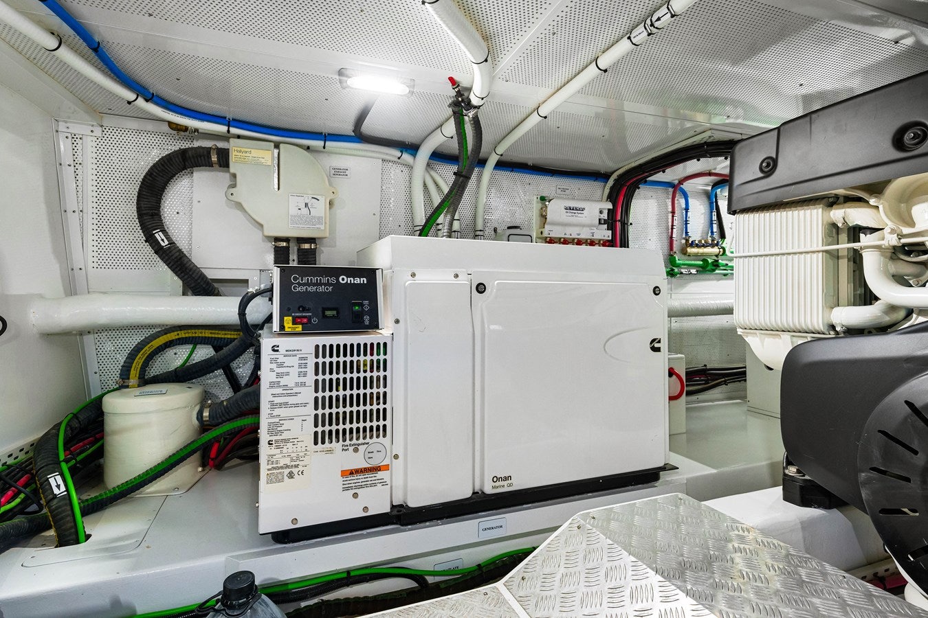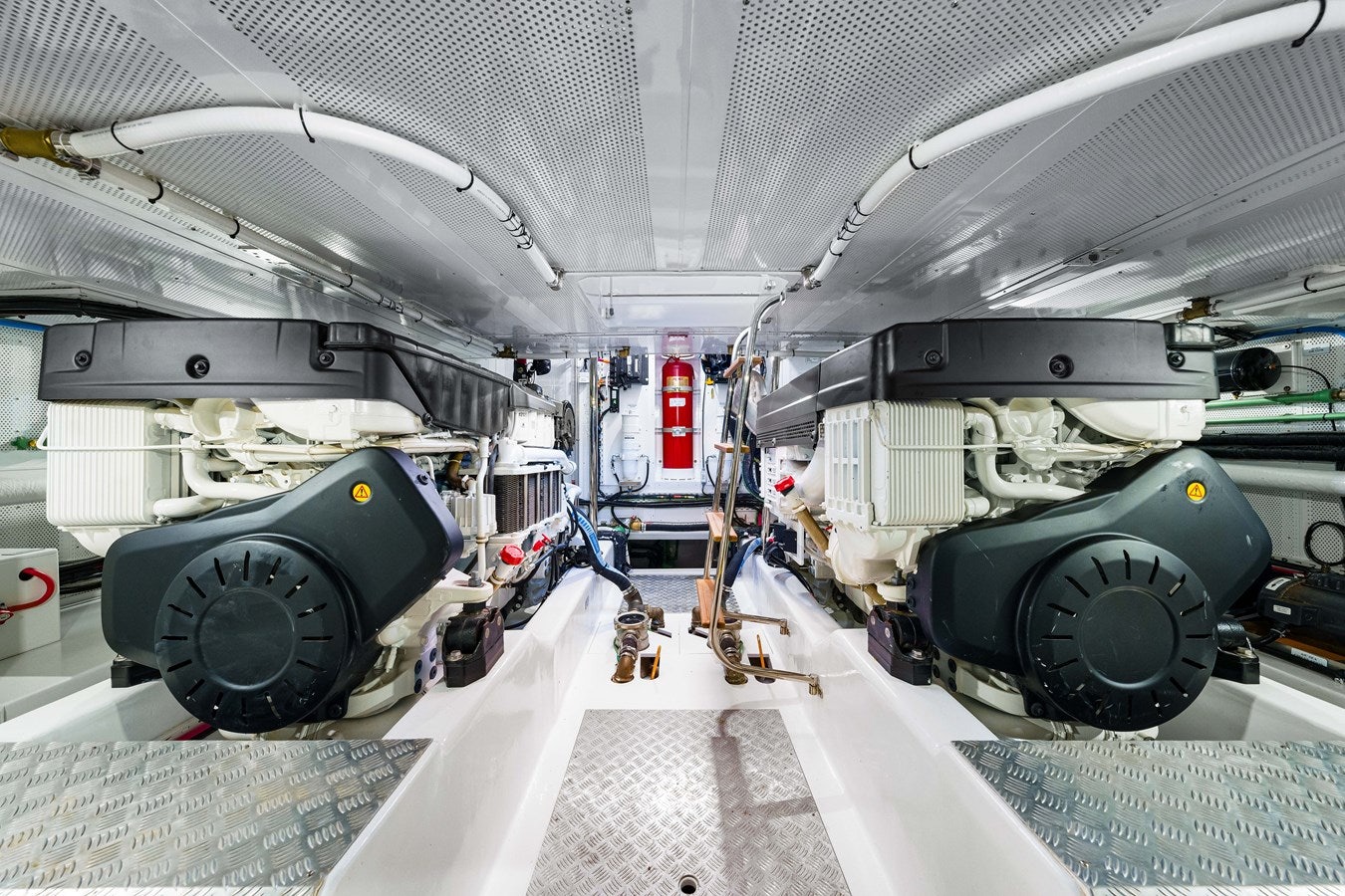 Access to the engine room is straightforward from the aft deck, and once inside, you'll find a well-laid-out space with diamond plate flooring and room to move. Power comes from twin Volvo D13-900s with V-drives, not pods, providing reliable performance and easy serviceability. A Cummins Onan 18kW genset supports onboard systems, and dual single 4-ton chillers ensure climate control remains uncompromised.