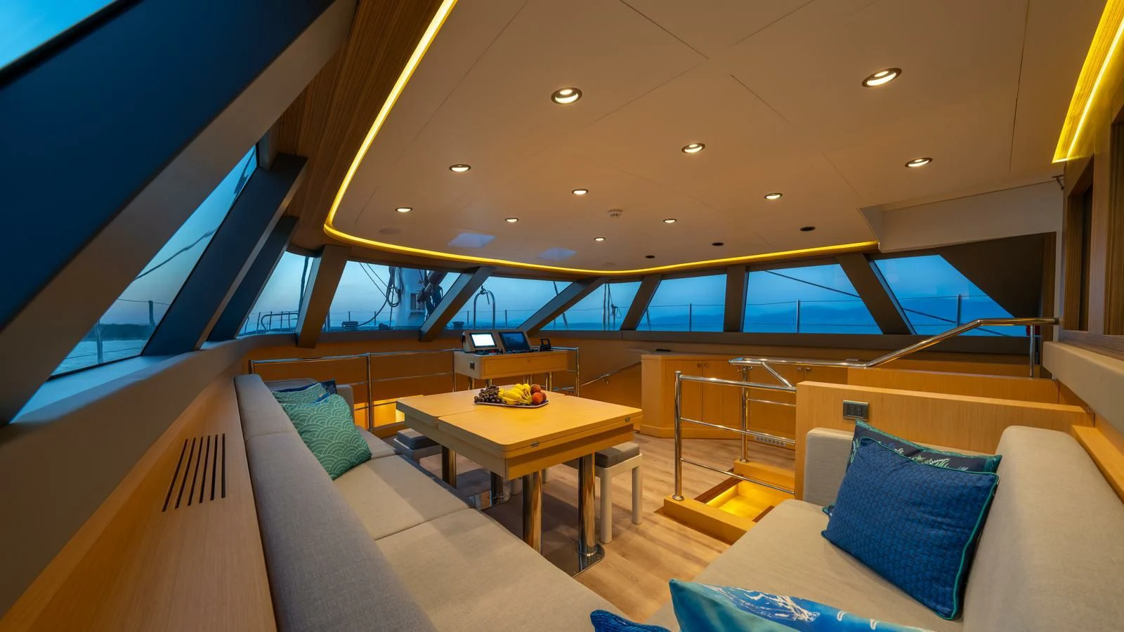 With a beam of 7.7 meters and a maximum draft of 3.7 meters, she offers stable cruising powered by a single John Deere engine, reaching a top speed of 12 knots and an economical cruising speed of 9 knots.