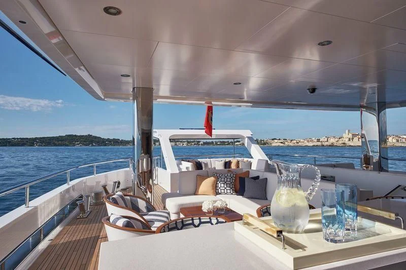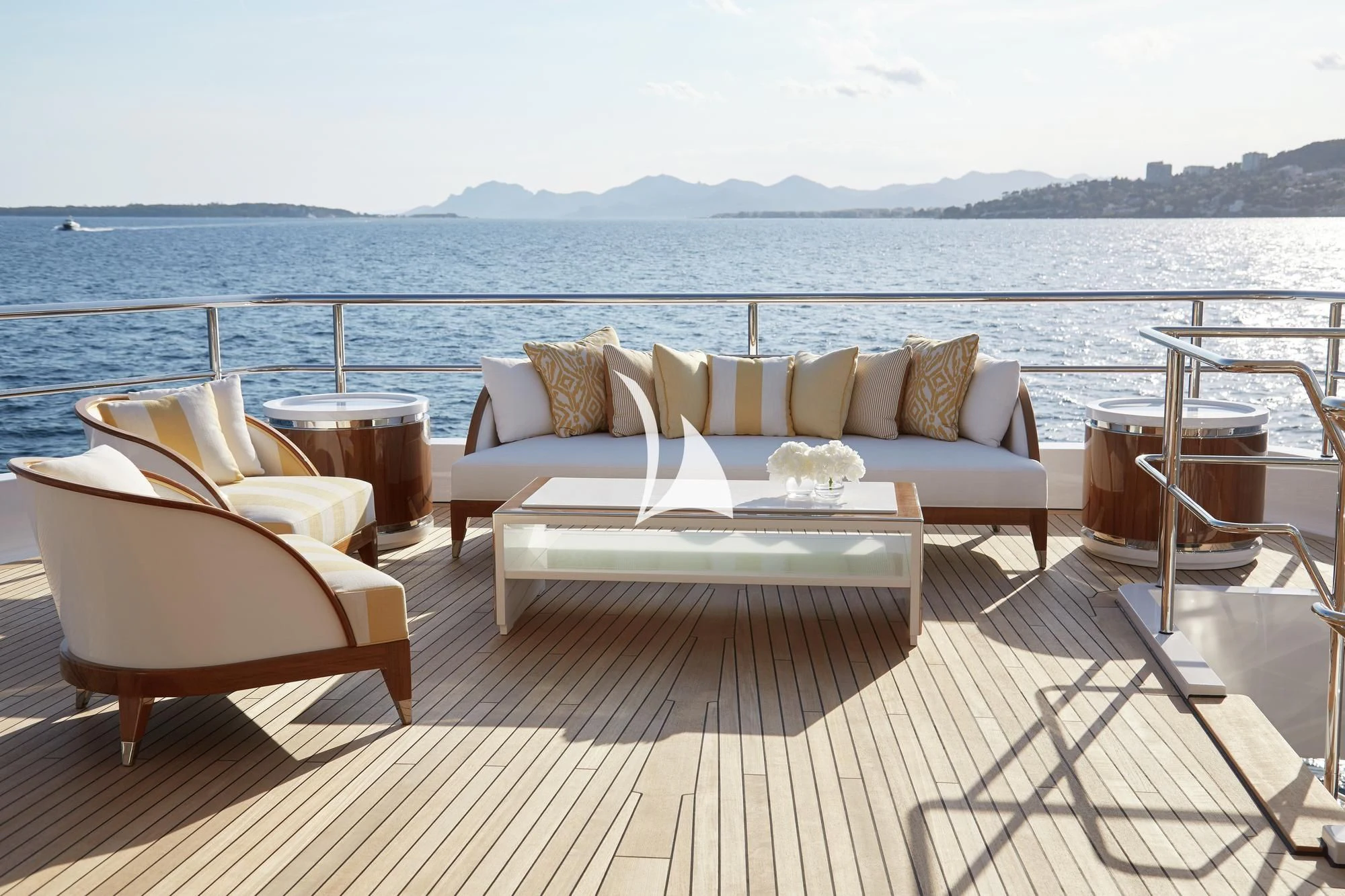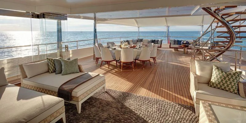JOY's exterior is the result of an exceptional collaboration between Feadship and Bannenberg & Rowell Design. Her silhouette is bold yet sleek, with fluid lines that echo the rhythm of the sea itself. Notable exterior features include expansive sundecks perfect for soaking up the sun and alfresco dining areas where guests can dine under starlit skies. There are also numerous lounging areas for those who prefer quiet relaxation or intimate conversations while cruising at a comfortable speed of 12 knots.