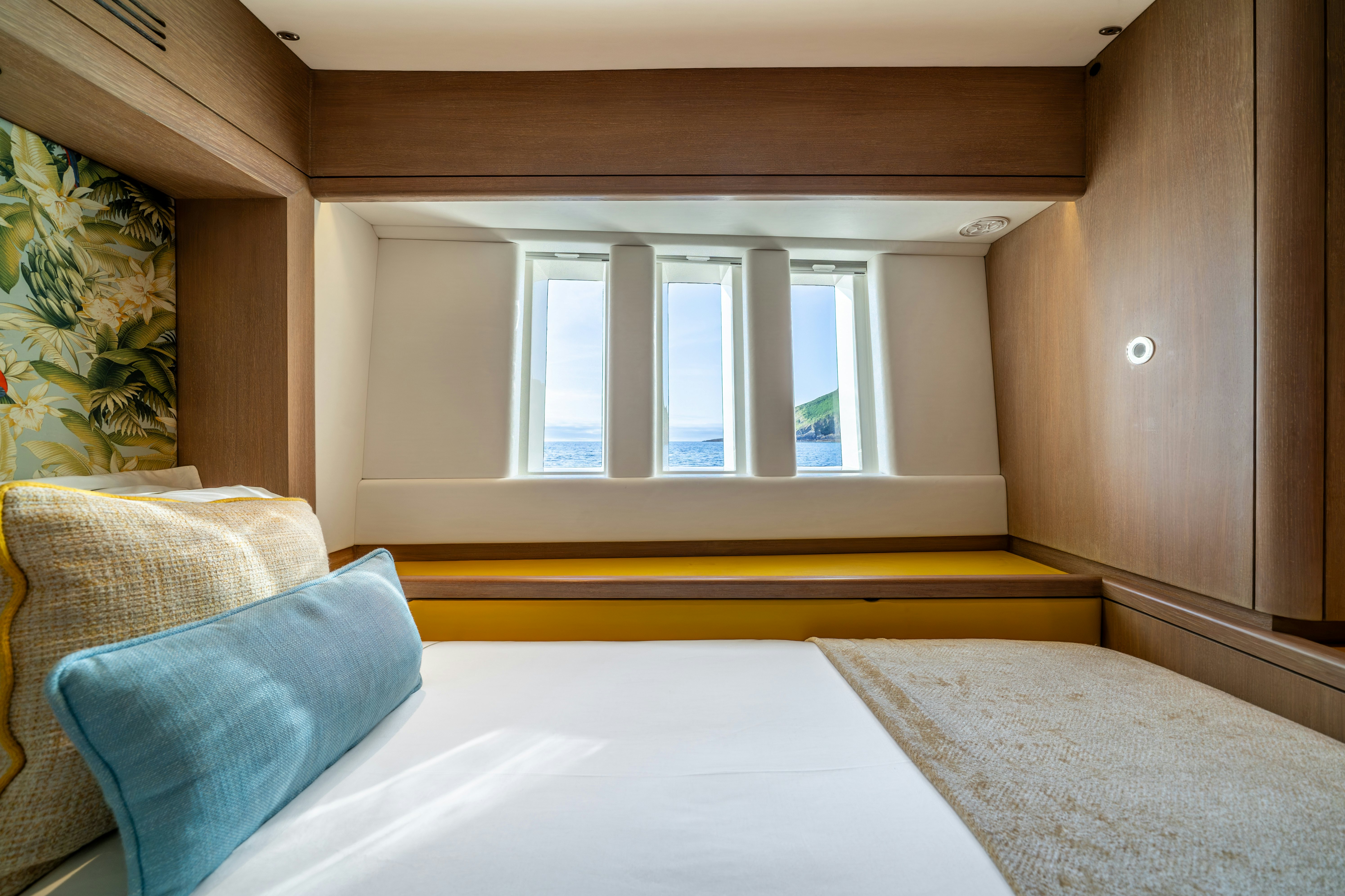 Inside, the raised main saloon benefits from wraparound windows and a U-shaped sofa to starboard. Expandable coffee tables with rise-and-fall functionality allow the space to convert seamlessly into an interior dining area. During the refit, bespoke timber furniture was added throughout, along with a new bar area featuring a wine fridge, ice maker and glass cabinetry. The entire interior was redesigned in collaboration with the multi-award-winning UK-based Design Unlimited, using vibrant colors and high-end materials to create a relaxed and inviting atmosphere.