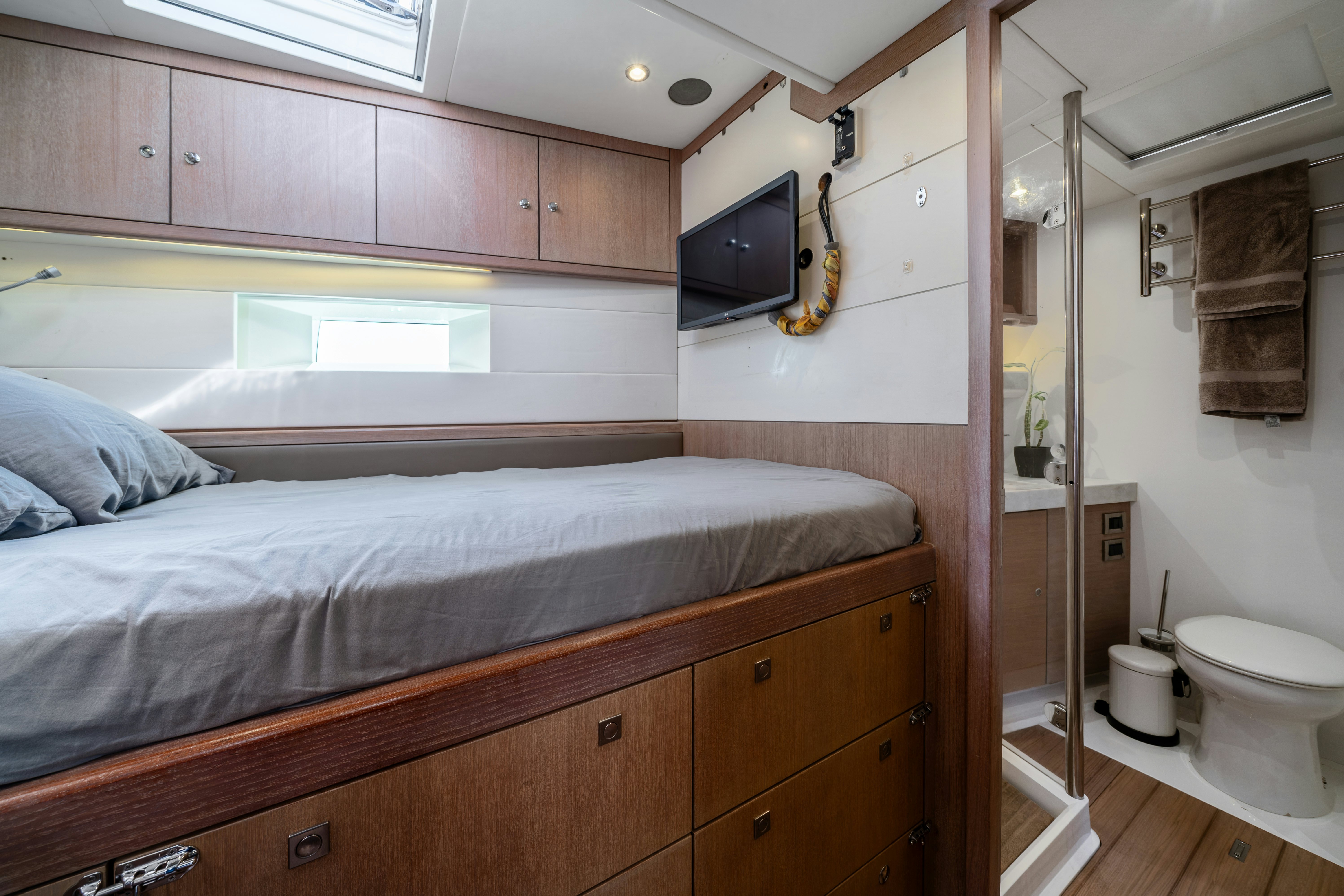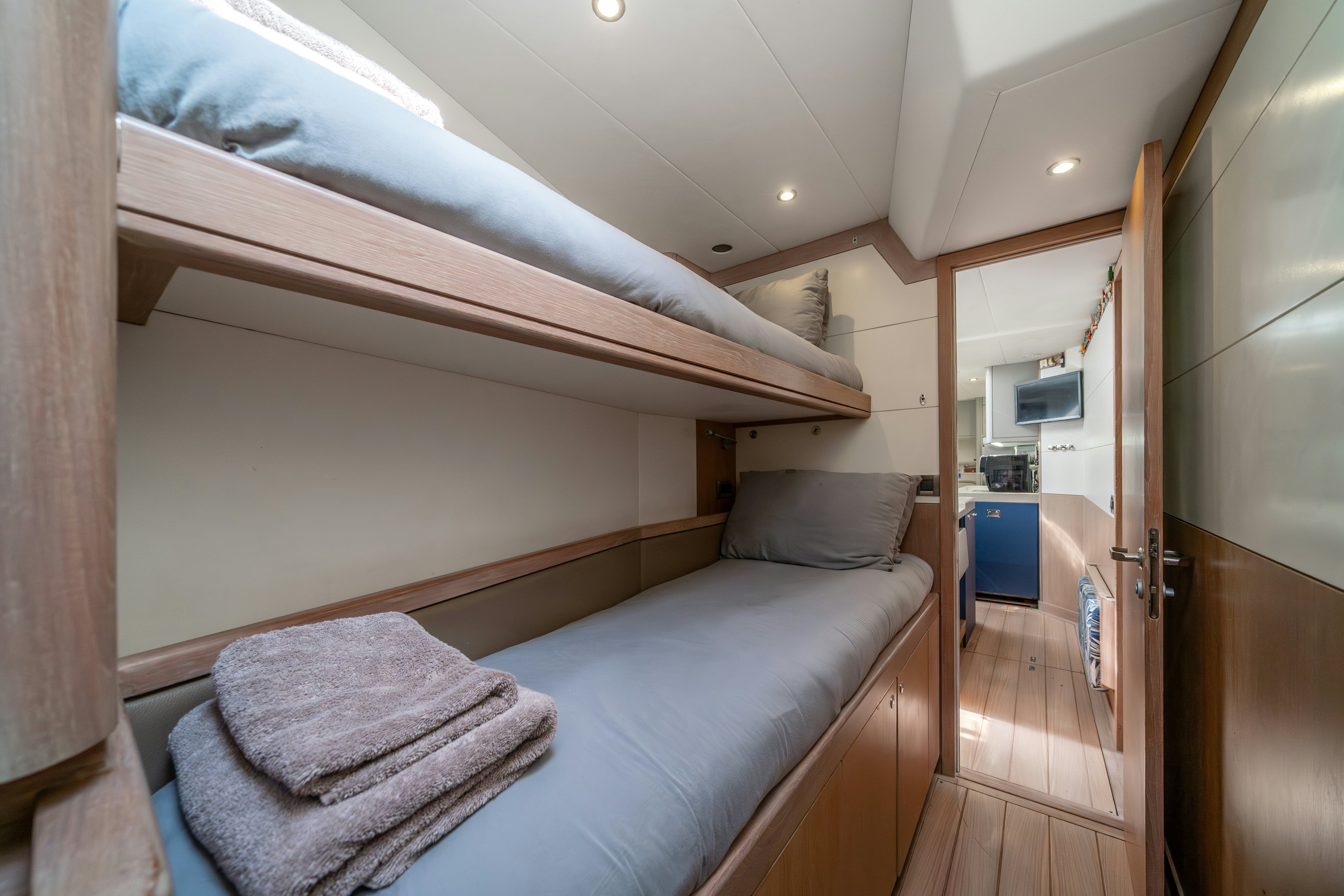 With four comfortable cabins, KARIBU sleeps 8 guests and offers the perfect set-up for two families with children or a group of friends or relatives. Four crew are comfortably accommodated in 2 cabins. The captain’s cabin is currently configured with a double berth, however an additional bunk can be fitted as required to accommodate a twin cabin configuration.
