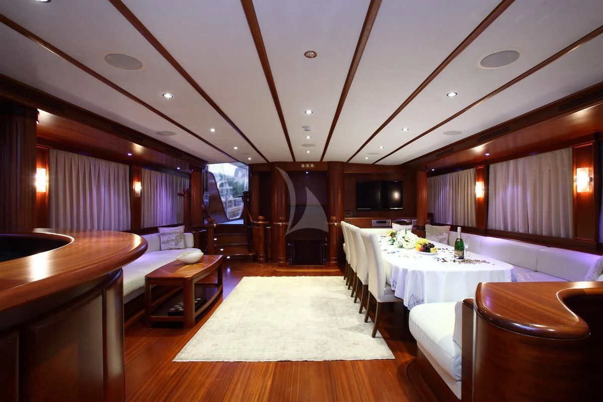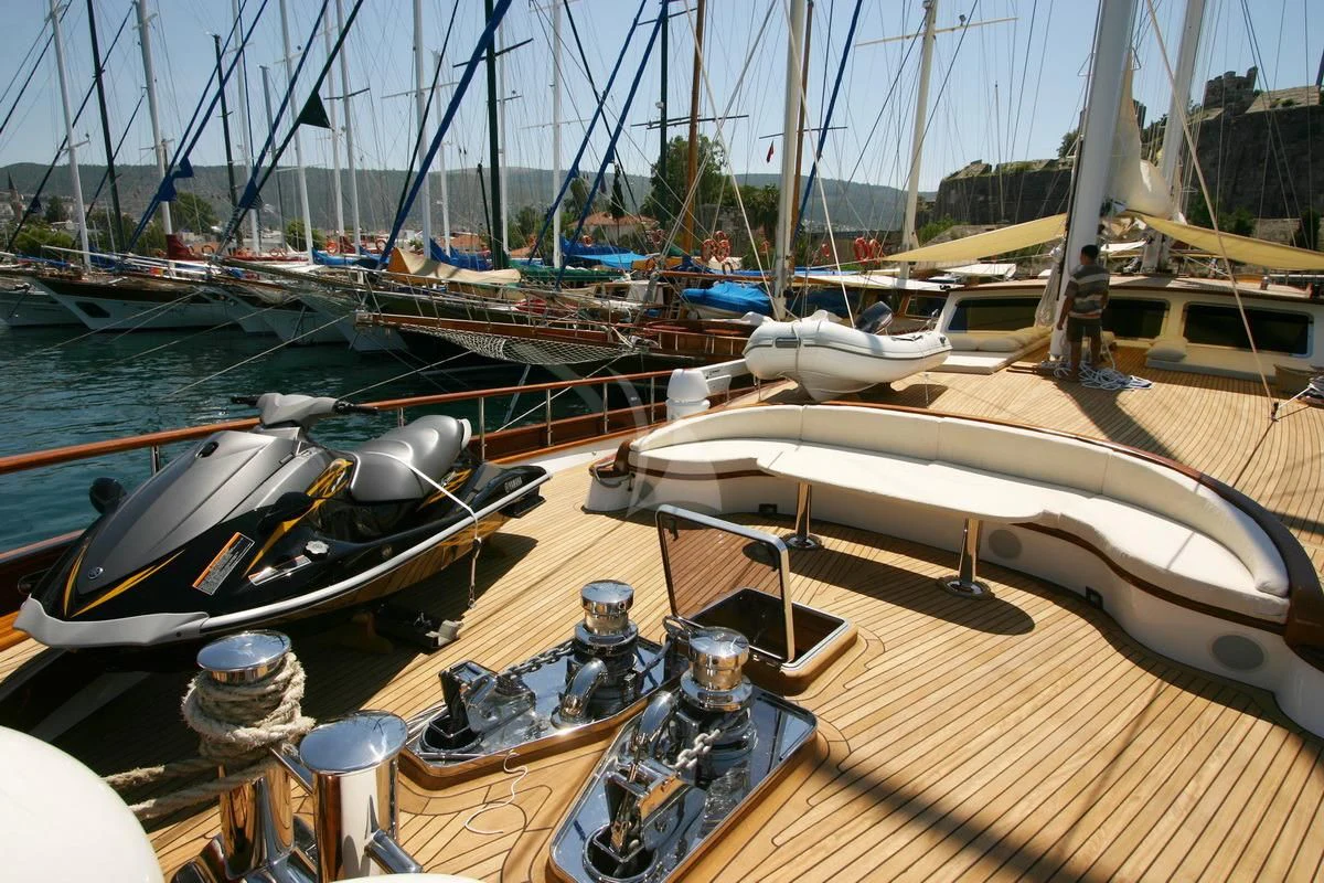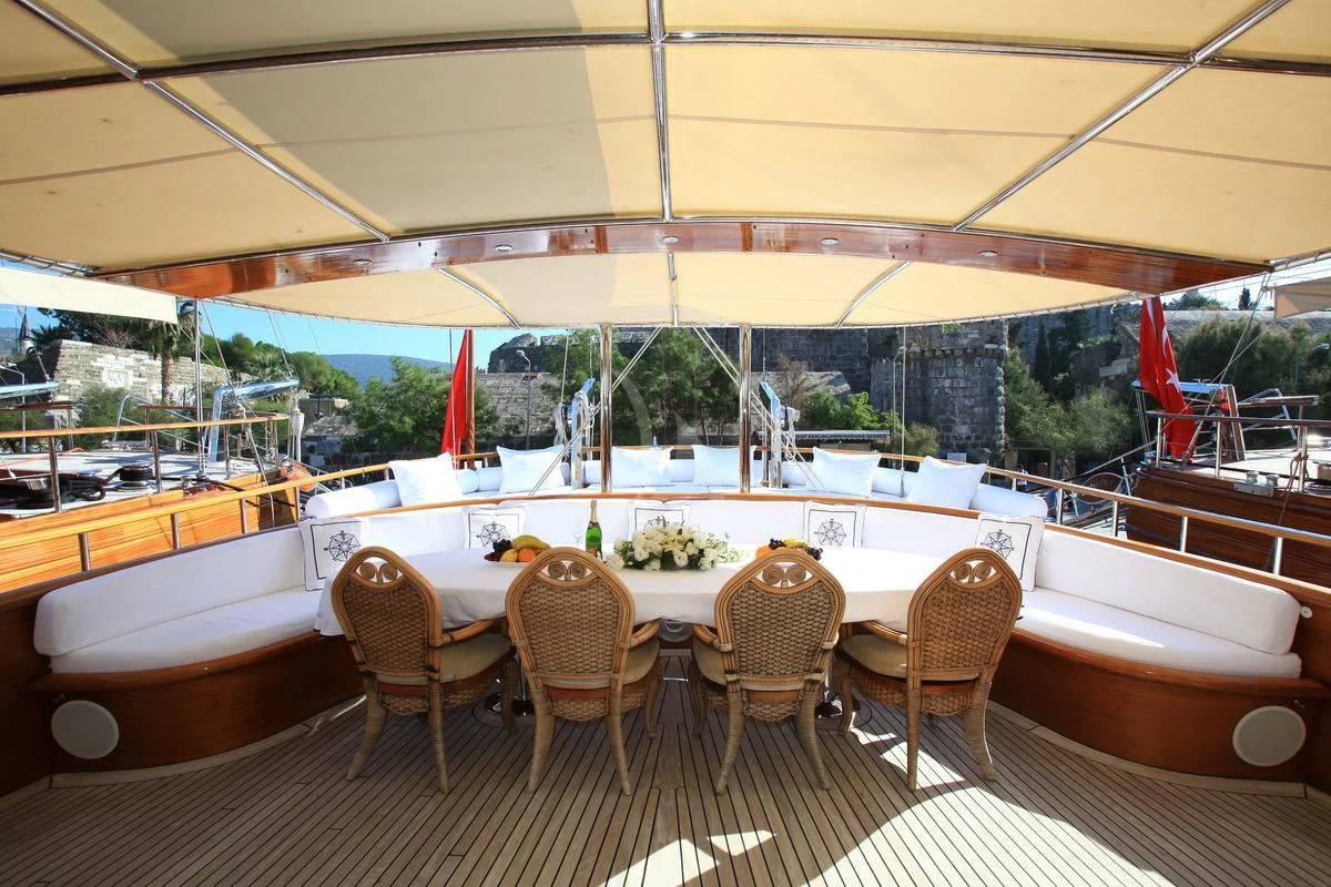 KAYA GUNERI V's exterior spaces are designed for absolute relaxation and entertainment under the open sky. Imagine lounging on spacious sundecks or sharing meals in alfresco dining areas as you bask in breathtaking ocean views - all these become everyday experiences aboard this magnificent vessel. Its beam measures 29 feet 6 inches or around nine meters, providing ample space for guests to indulge in various outdoor activities.