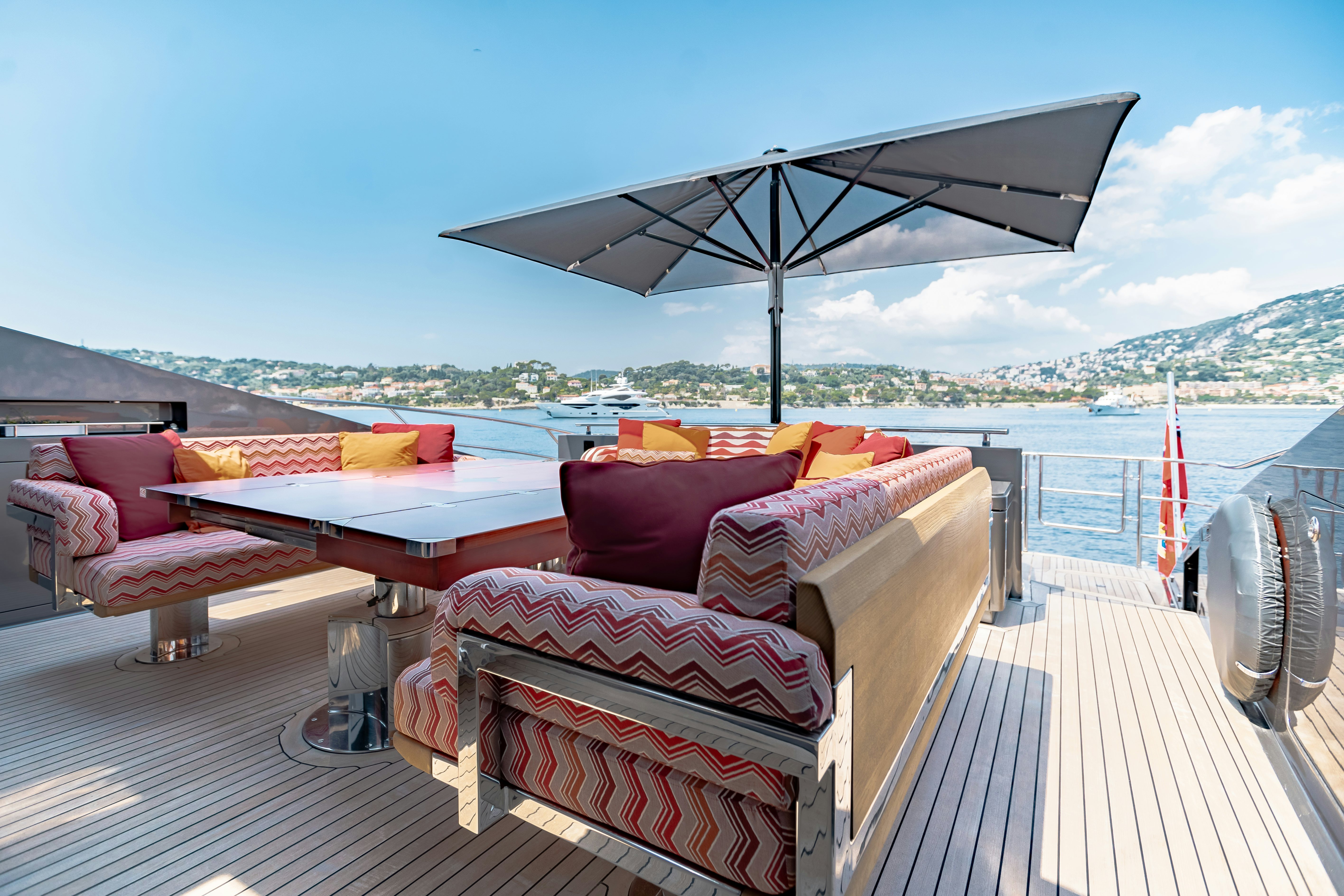 KJOS’ exterior spaces are well suited to socializing and relaxing. Her aft deck is particularly well suited to entertaining; it’s extremely spacious and comfortable with eating and lounging areas and a large bathing platform to foster a genuine connection with the water. Above, her flybridge enjoys panoramic views with three built-in seating arrangements, a large sunpad and a coffee table. Cabinets hide a fridge and ice maker.