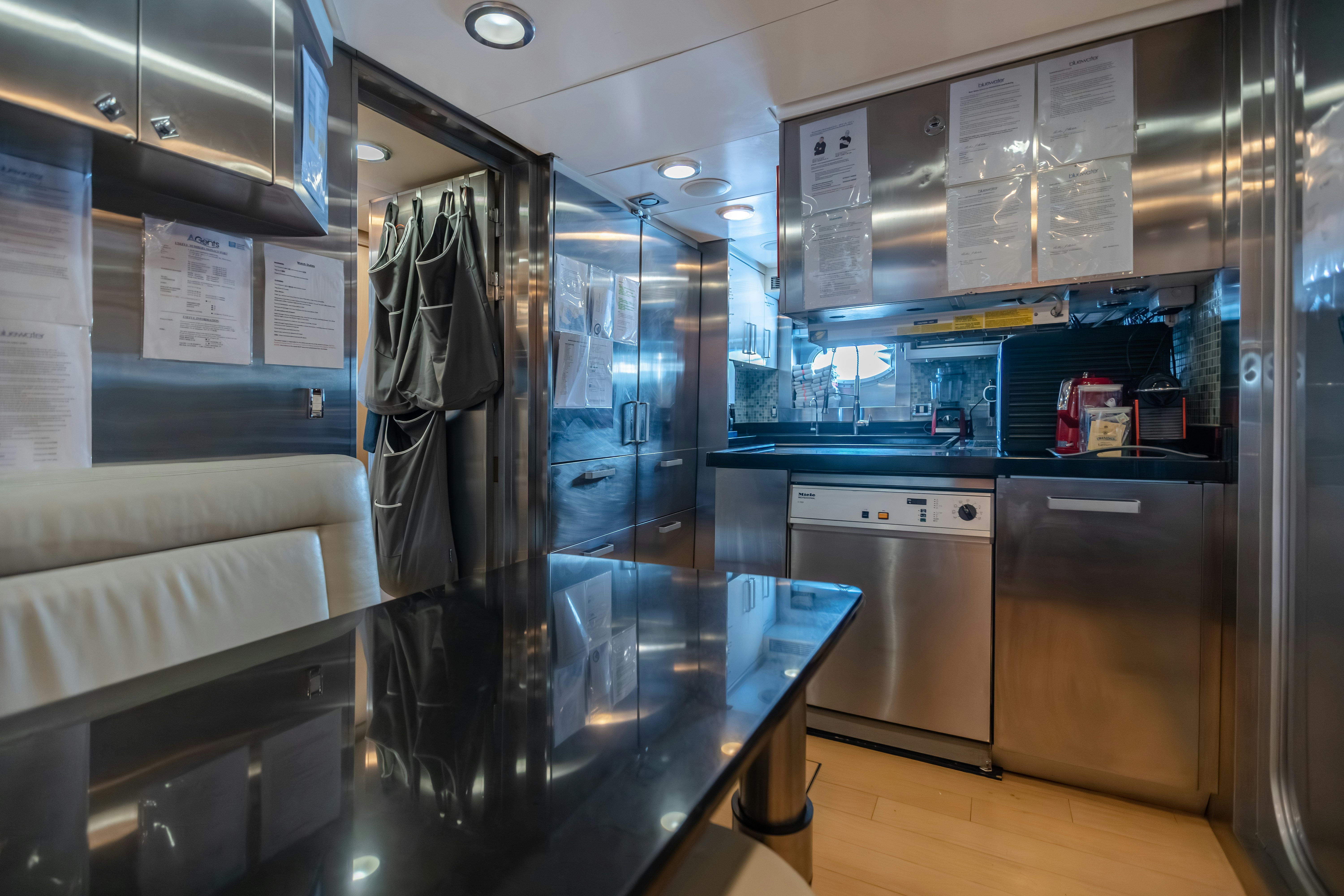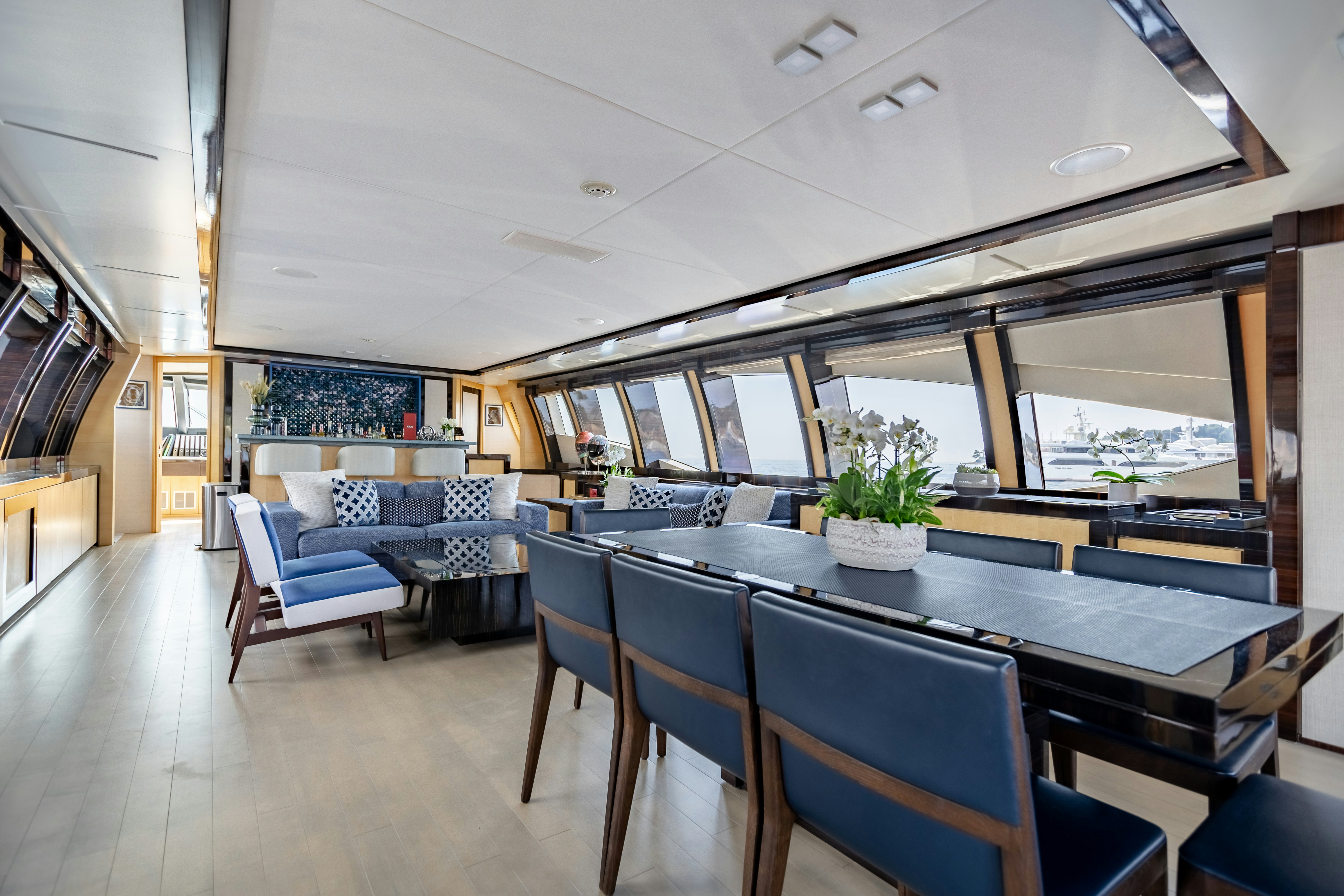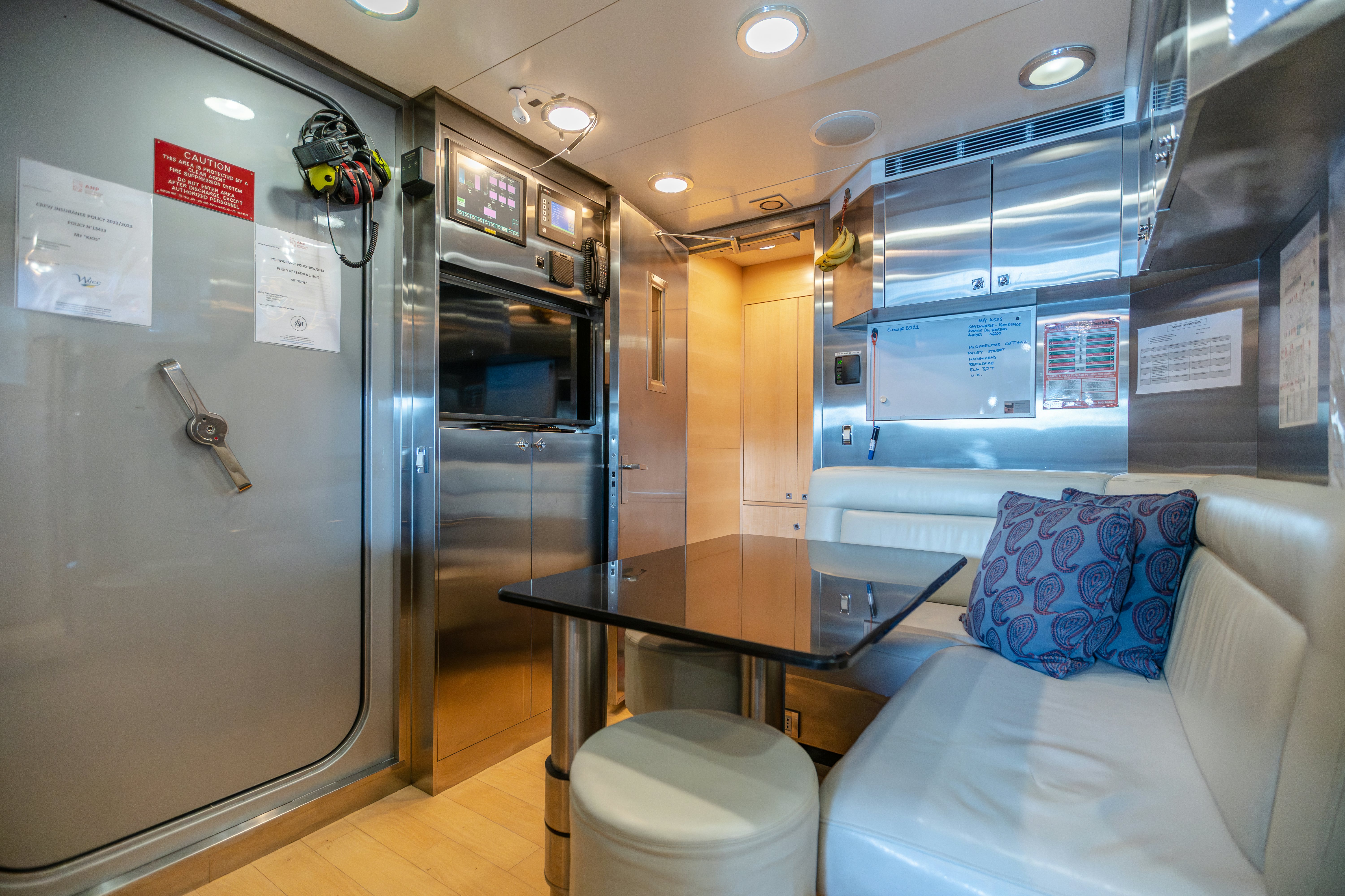 Crafted with the highest attention to detail, KJOS boasts both interior and exterior design by Nuvolari & Lenard, well-known and respected Italian designers. Sliding doors with stainless steel frames and tinted glass provide a sleek entrance into her main salon. The ambiance here is sophisticated, luxurious and comfortable, with plush seating laid out to encourage socializing with a custom showpiece cabinet hiding a flat-screen television. Moving forward is a custom dining table featuring wood with inset fine leather, glass and marble with seating for eight. This space also features a full-service bar with sink, and an under counter ice maker and refrigerator. Her galley enjoys custom cabinetry with marble countertops and is fully equipped.