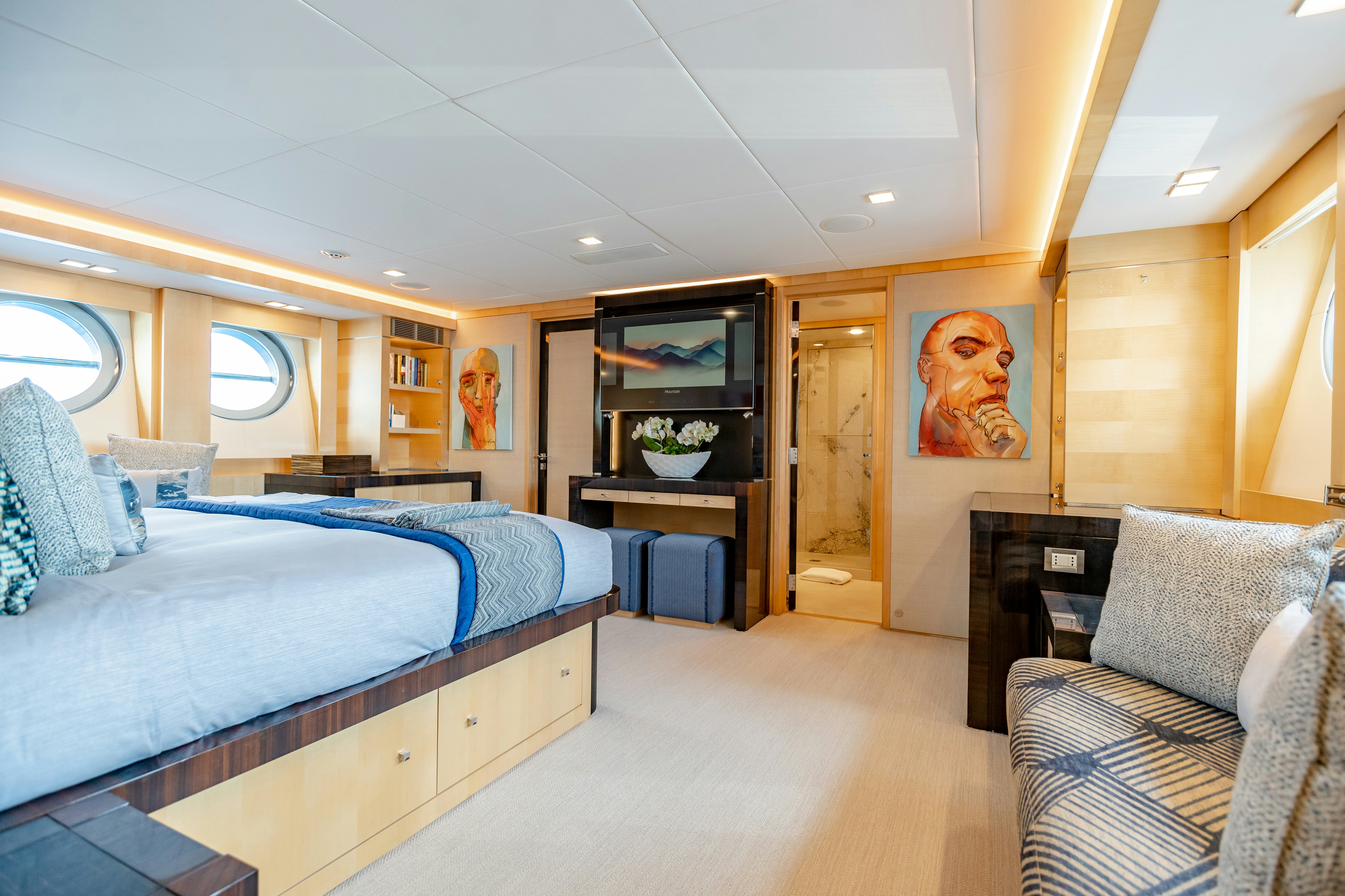 KJOS can comfortably accommodate eight guests across four cabins. Her owner’s stateroom, upholstered in fine fabrics and finishings, is spacious and airy and has plenty of storage, with a king-size bed, nightstands, and a desk with vanity and flip-up mirror. An entertainment cabinet contains a flat screen television and media storage and is built from the same high-gloss cross-grained wood accents as the bed and desk for seamless style. A built-in sofa and walk-in wardrobe complete the amenities, along with an ensuite his-and-hers bathroom boasting marble, glass and stainless steel fixtures and finishings. Her three guest cabins also have a full entertainment setup, plenty of storage and en-suites. KJOS can sleep five crew including a captain’s cabin with en-suite.