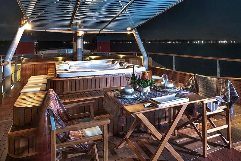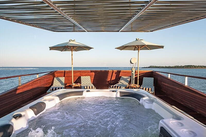 Onboard amenities elevate every moment spent aboard the KUDANIL EXPLORER into something truly special. A state-of-the-art Jacuzzi invites relaxation while Wi-Fi ensures constant connectivity even while sailing through azure waters. For those who prefer their leisure time served with bubbles, there's also a deck Jacuzzi offering panoramic views over whichever exotic location you find yourself anchored in.