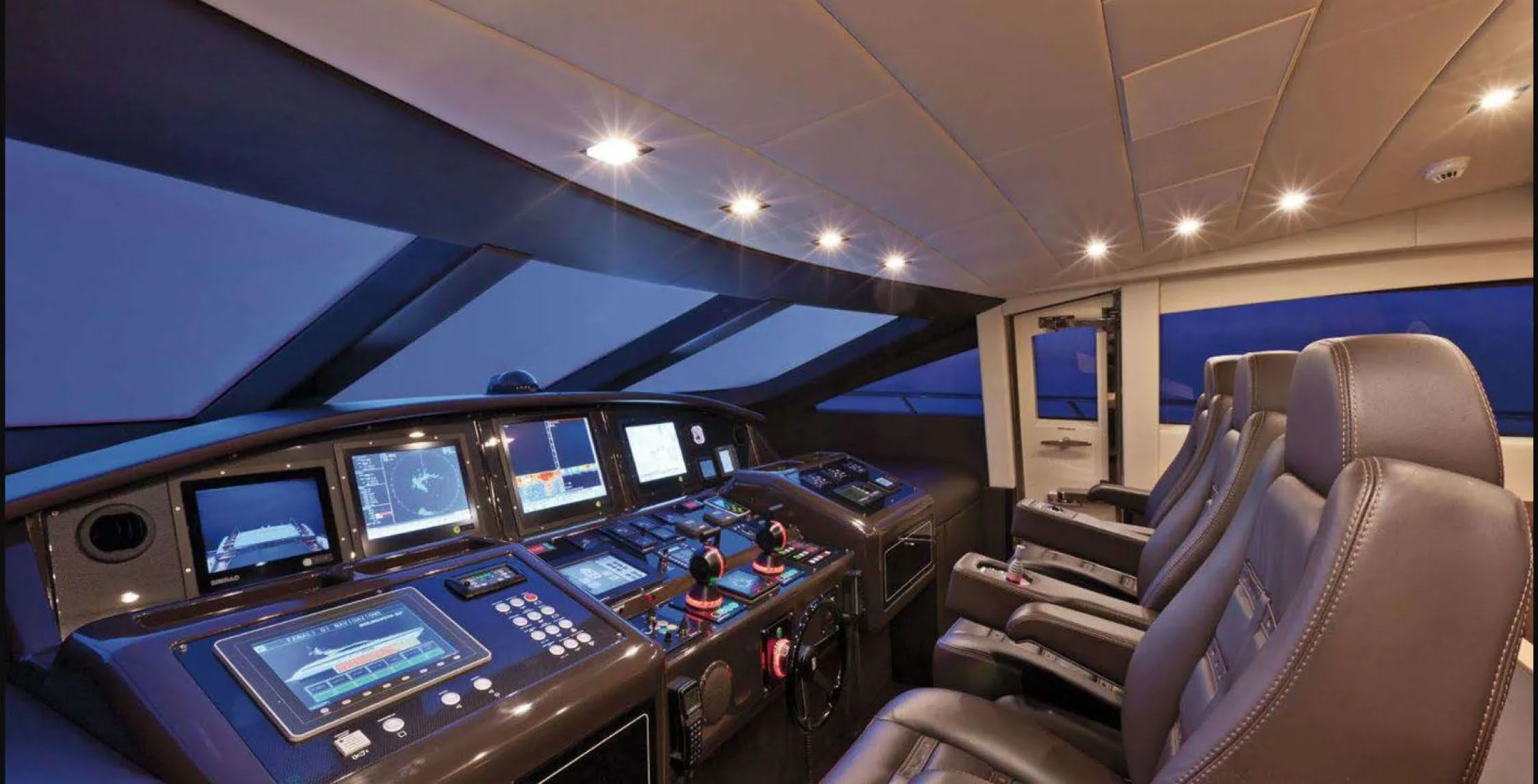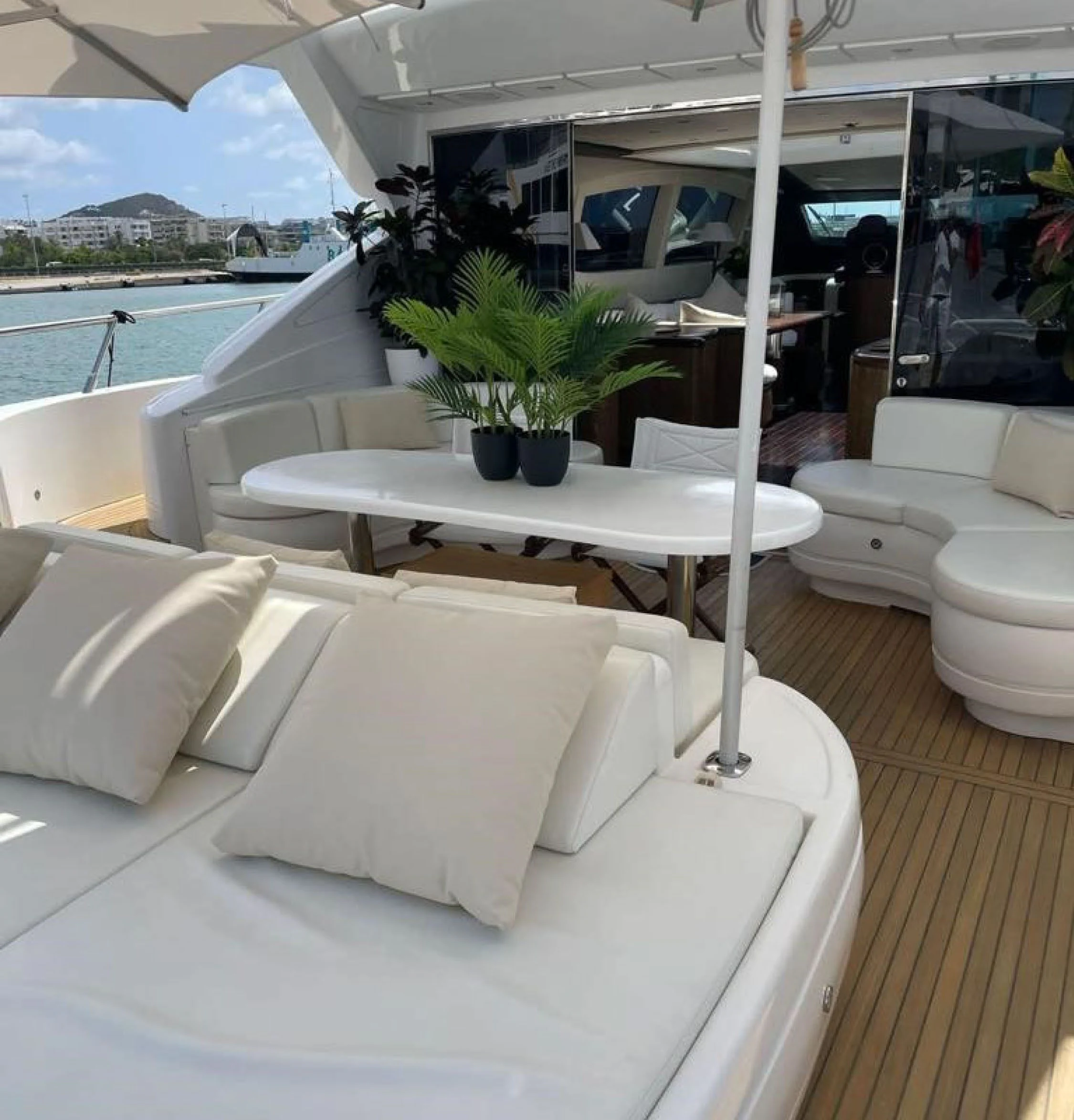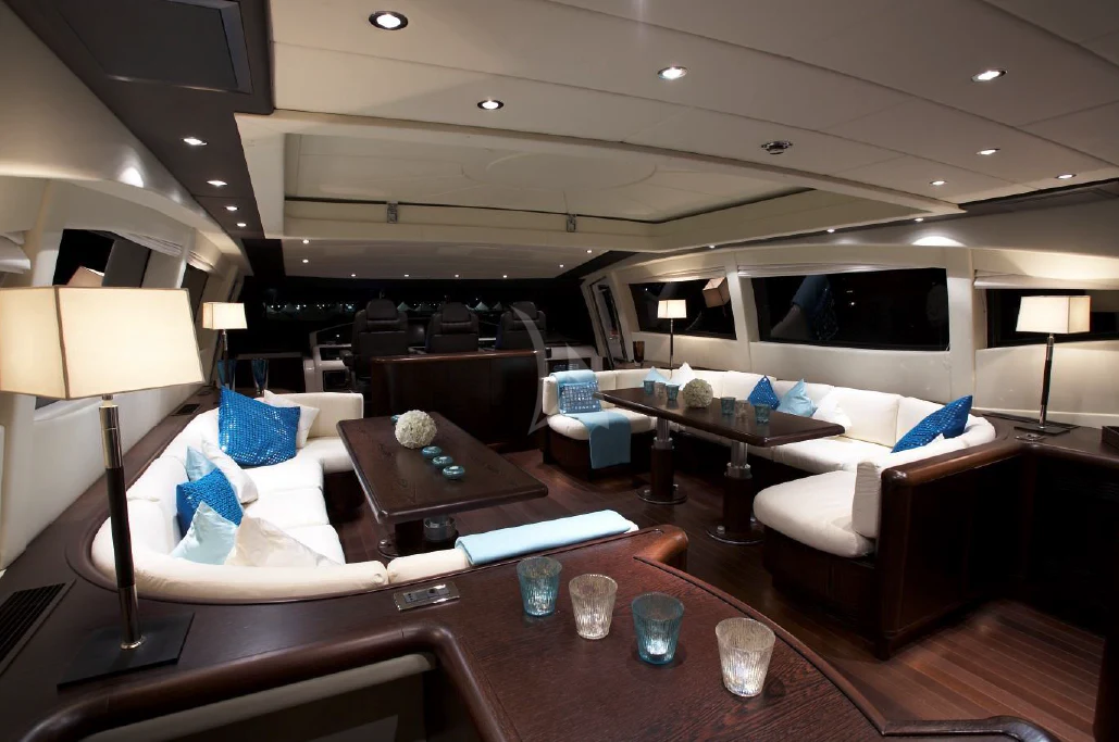 Her exterior profile is low, aggressive, and instantly recognisable as a Mangusta, designed to deliver both visual impact and exhilarating performance. Expansive deck spaces are arranged for relaxed outdoor living, with generous sunbathing areas and an aft cockpit well suited for socialising or alfresco dining. Large sliding doors create a seamless transition between the cockpit and the interior salon, enhancing the connection between indoor and outdoor spaces and reinforcing the yacht’s open, lifestyle-focused design philosophy.