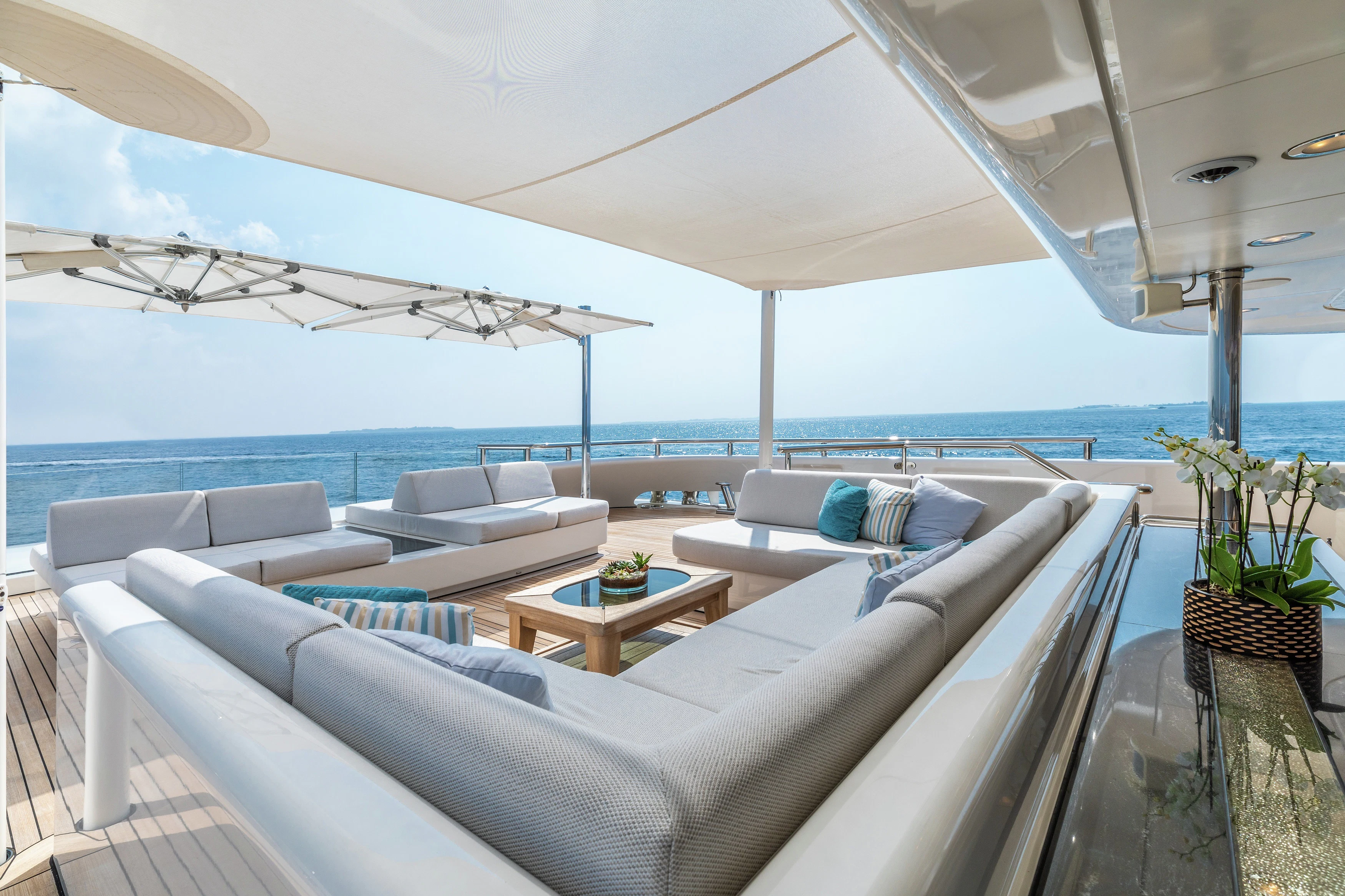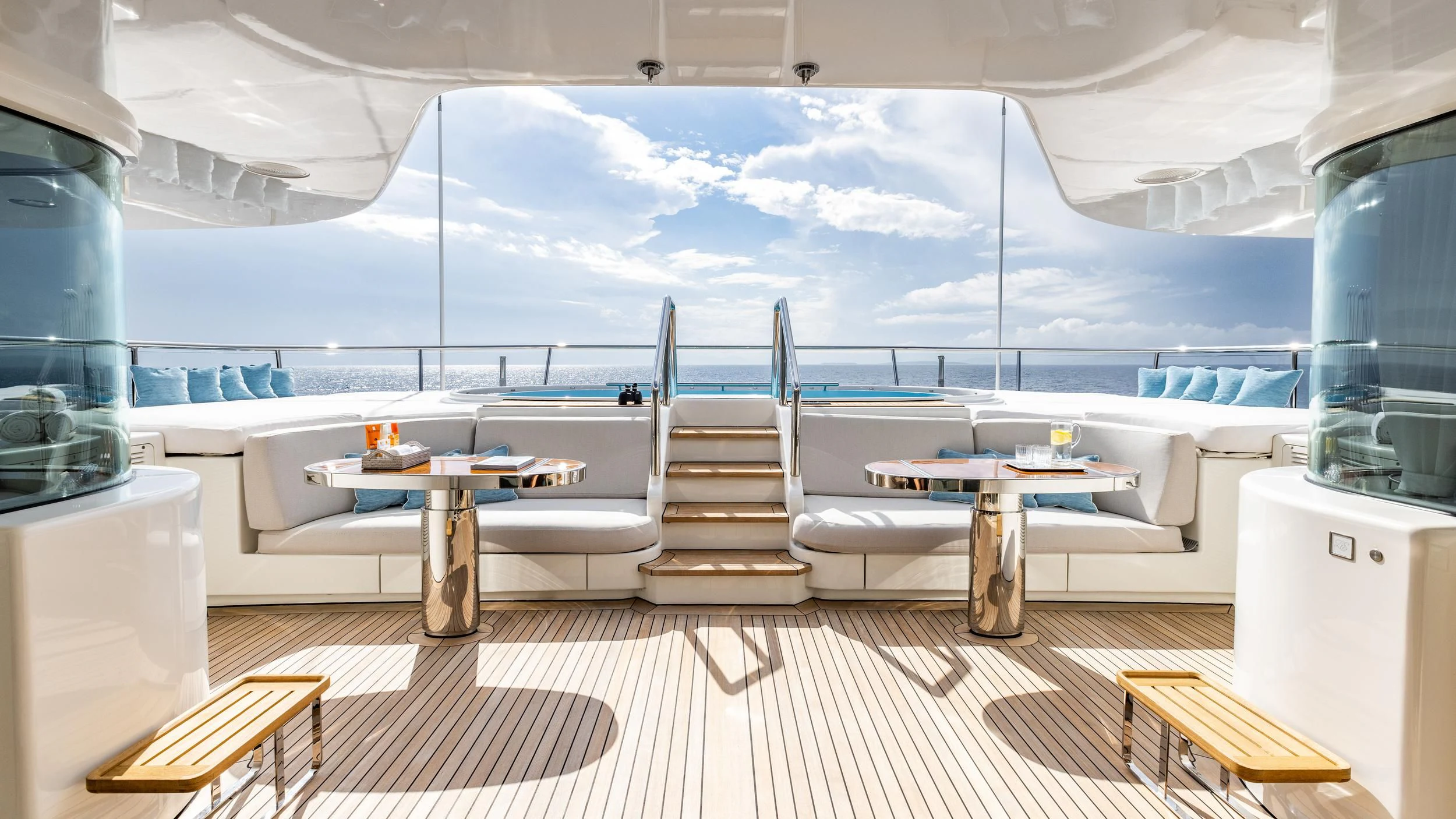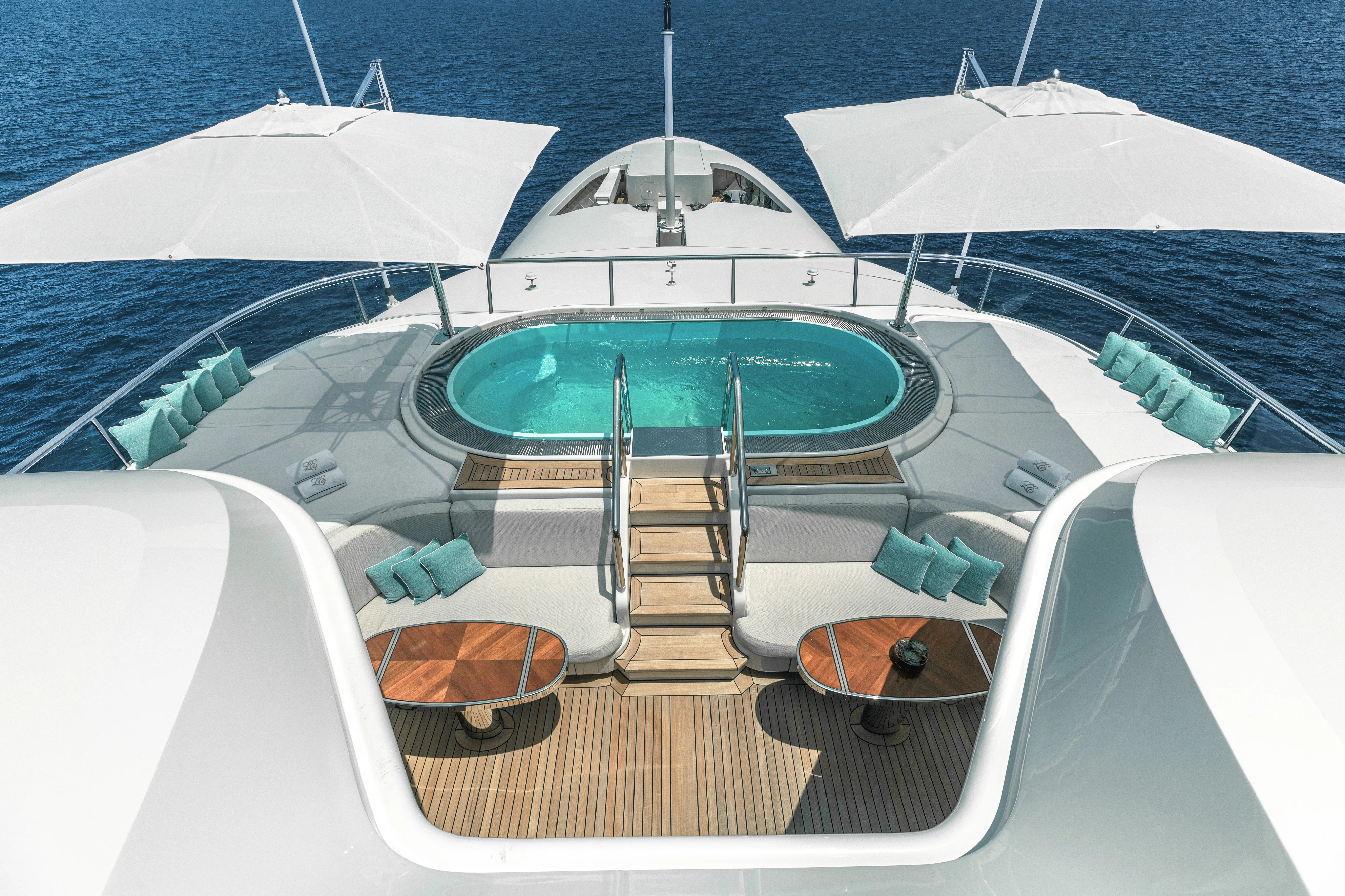 FELIX's exterior design is as commanding as it is elegant. The broad sundecks offer plenty of room for sunbathing or hosting alfresco dinners under the stars. One cannot overlook her remarkable beach club, which provides direct access to the sea and houses an array of water toys for adventurous guests to indulge in. The crowning glory of her exterior spaces has to be the Jacuzzi, where one can unwind while taking in panoramic ocean views.