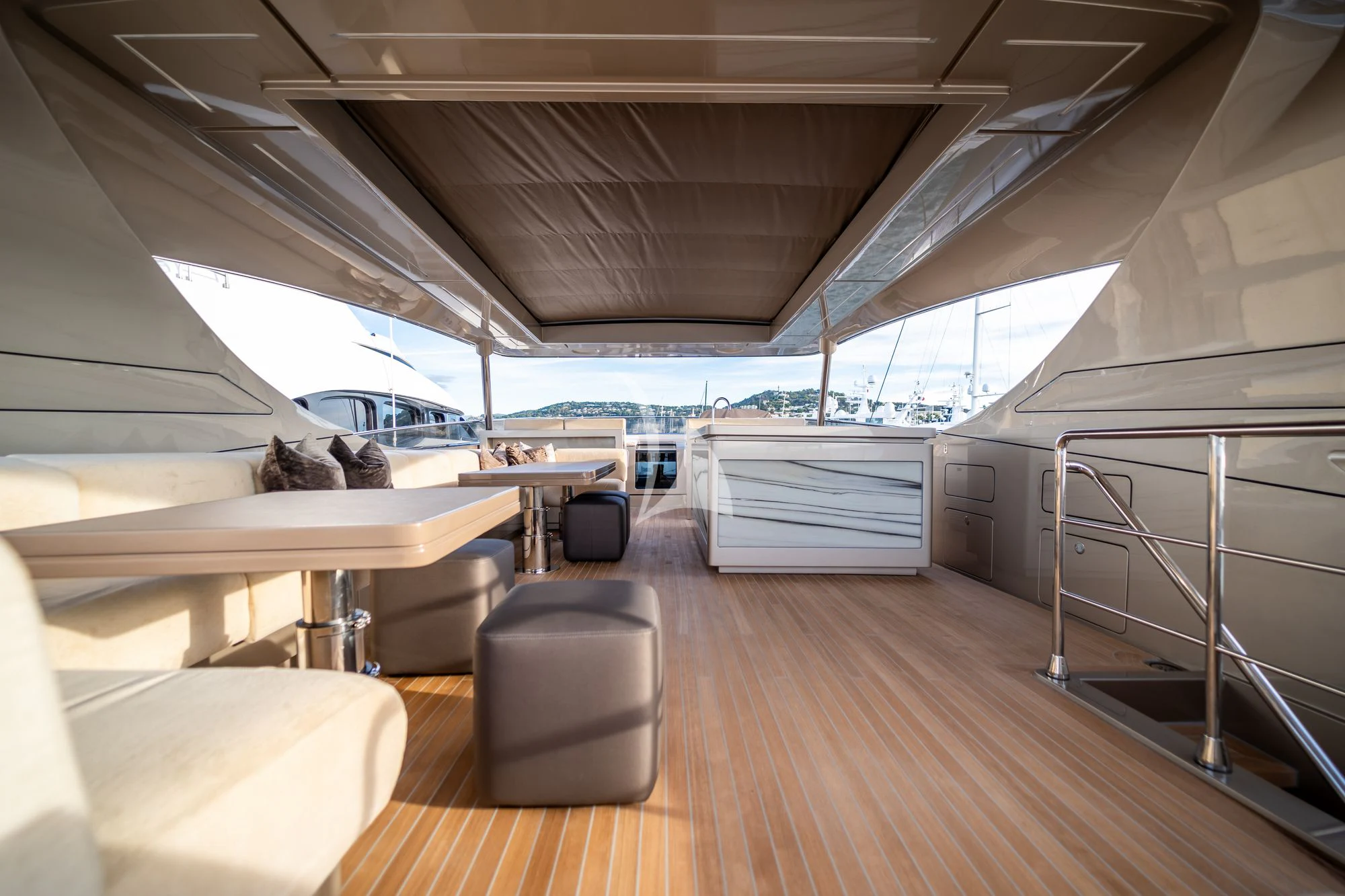THE PALM exudes magnificence from every angle. Its exterior design, characterized by sleek lines and stylish contours, ensures it stands out in any marina or anchorage. The flybridge subcategory further enhances its allure with elevated views and additional outdoor living spaces for guests' enjoyment. The hull made from Glass Reinforced Plastic (GRP) not only provides durability but also adds to its aesthetic appeal with a glossy finish that sparkles under the sun.