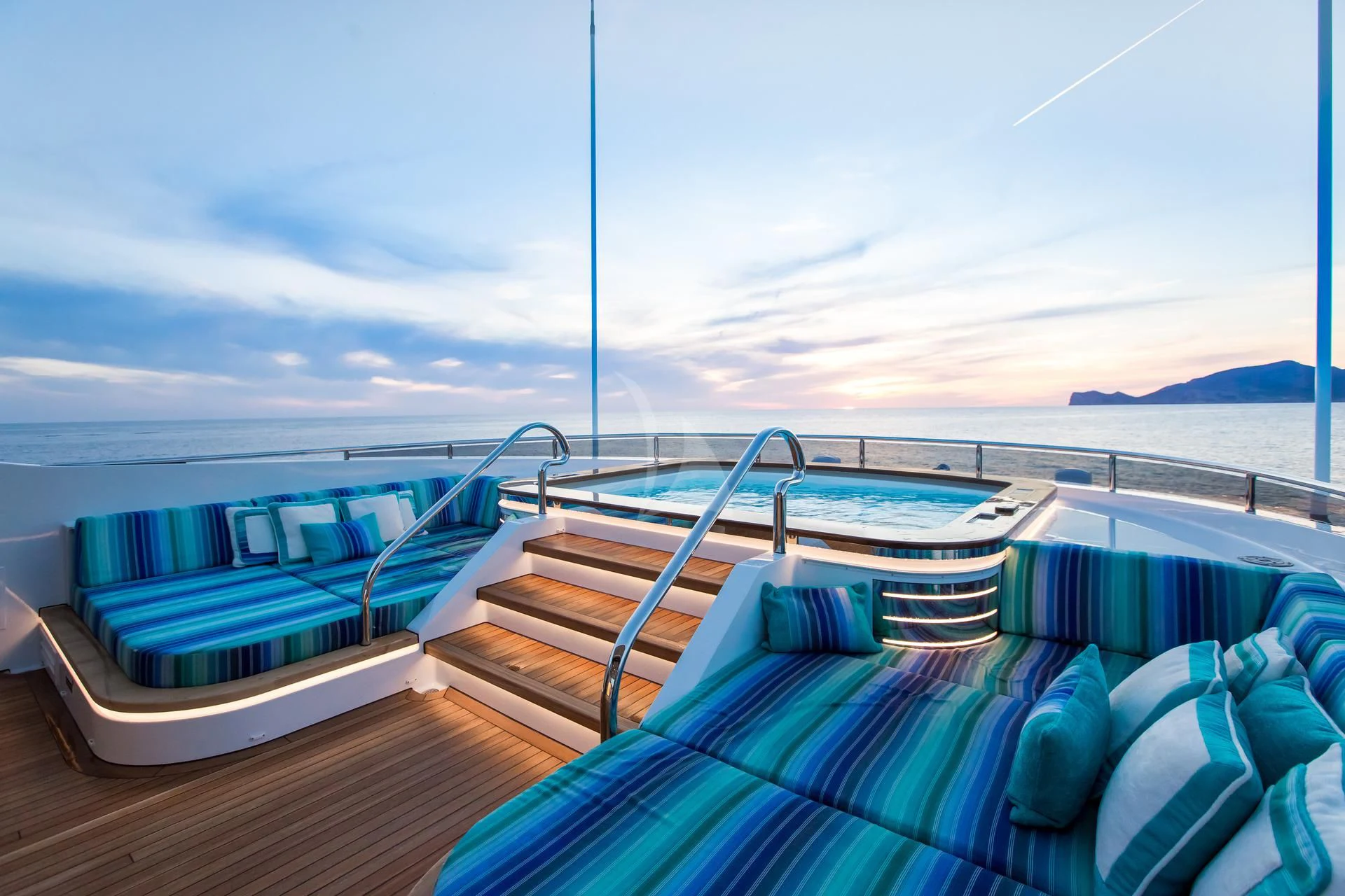 The exterior spaces are equally impressive as they provide ample room for relaxation or social gatherings under open skies. The sundeck houses a luxurious Jacuzzi where you can unwind while soaking up panoramic views of the oceanic expanse around you. Alfresco dining areas offer memorable dining experiences under starlit skies or basking in sunsets' warm hues.