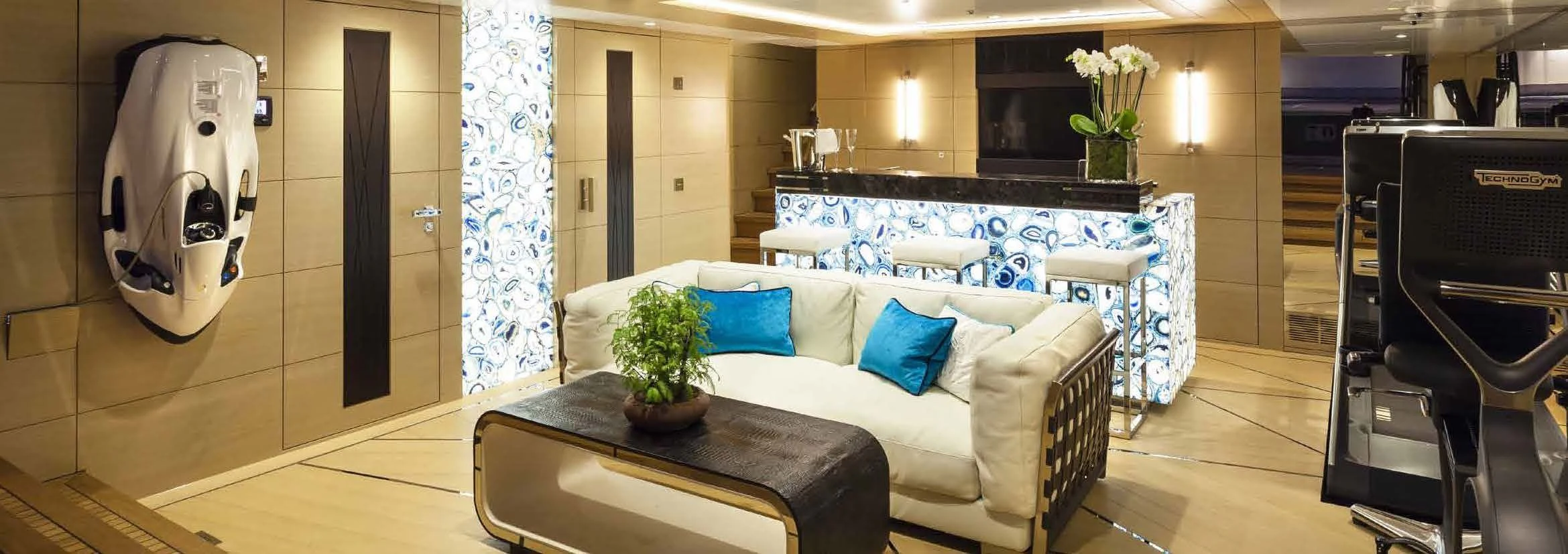 JULIA's interiors are nothing short of breathtaking as they harmoniously blend modernity with classic elegance. The color palette used throughout accentuates the yacht’s overall ambiance while unique design elements add character to each space onboard. A dedicated gym allows fitness enthusiasts to keep up with their routines even on vacation, while at-anchor stabilizers ensure smooth sailing at all times.