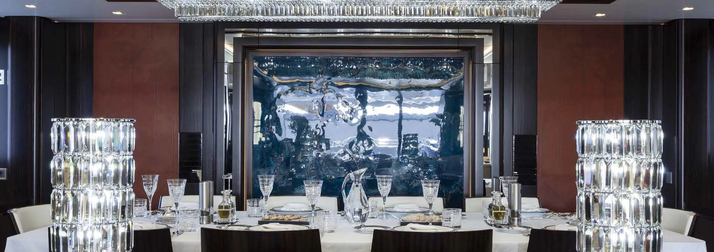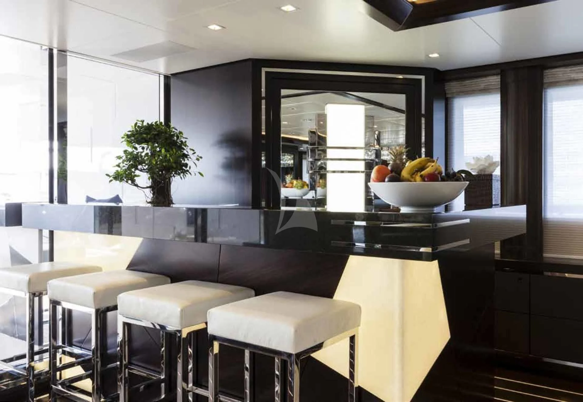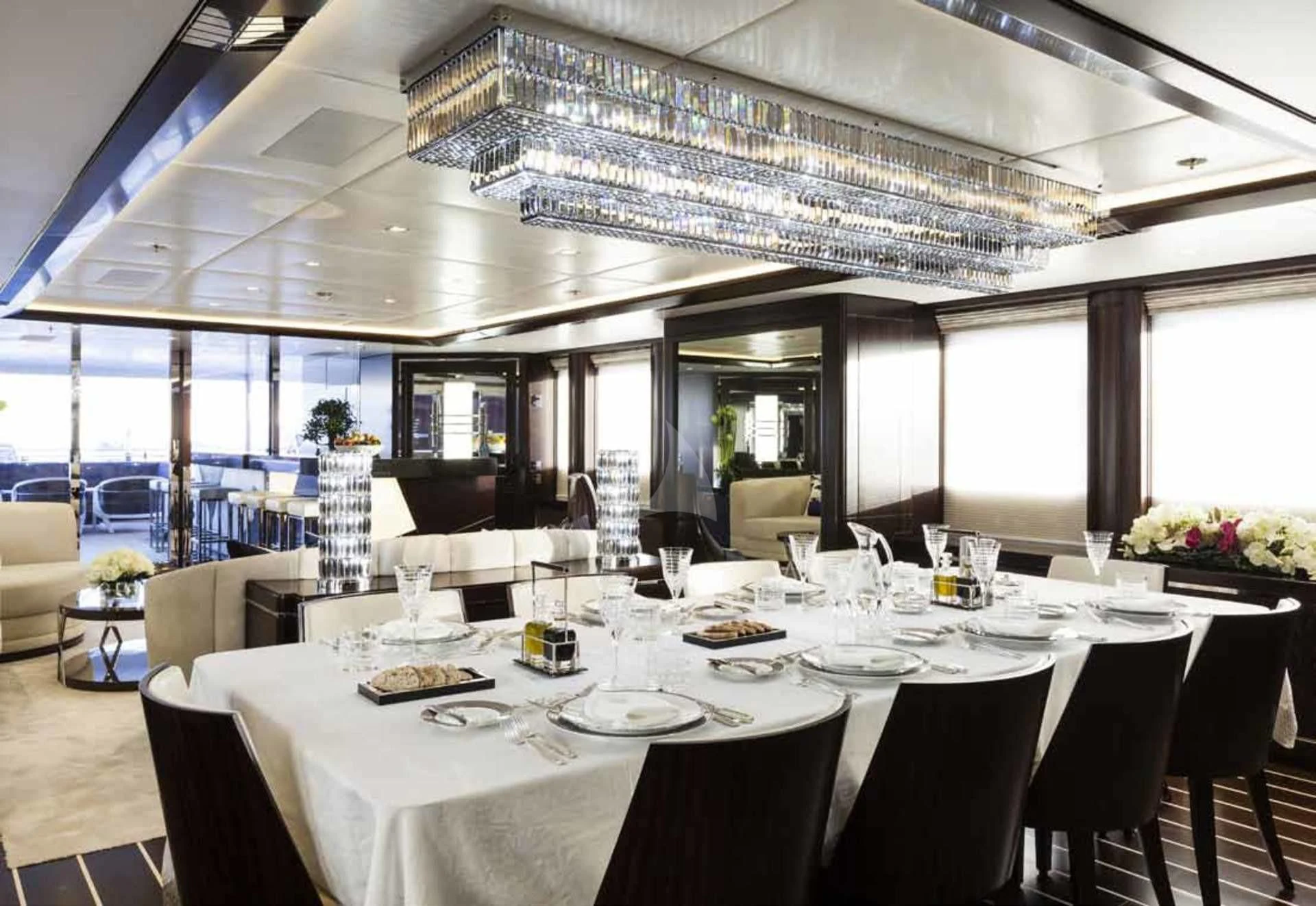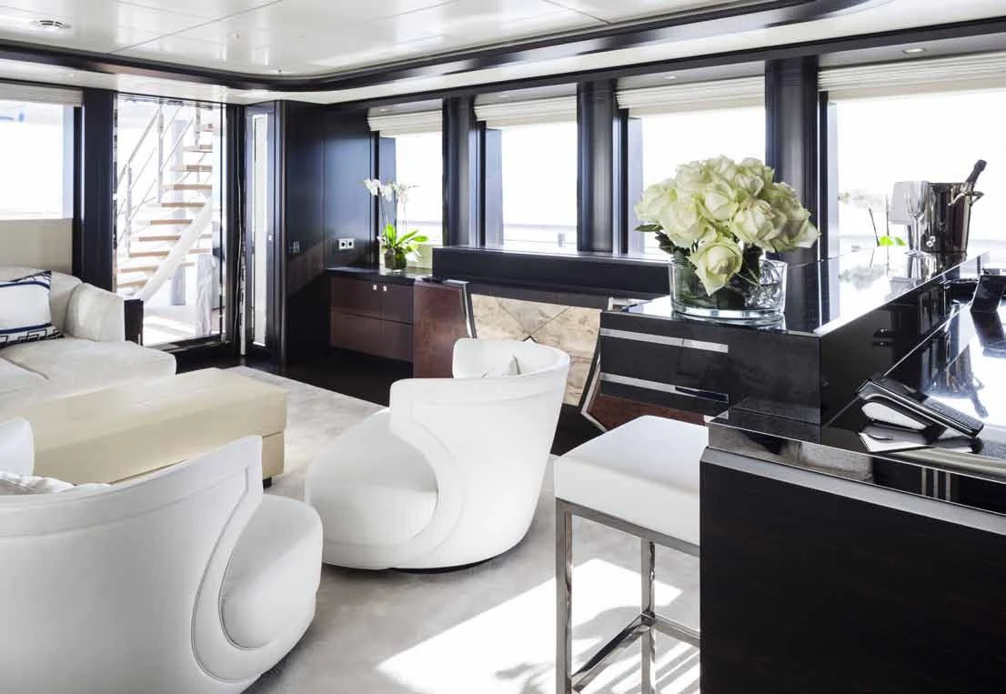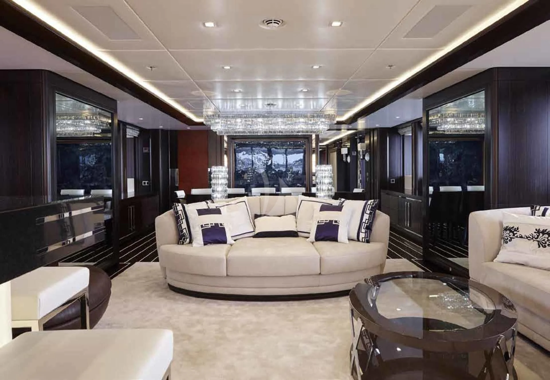 The main salon offers an inviting atmosphere where guests can engage in pleasant conversations or simply enjoy some quiet time appreciating the surrounding seascape through large windows that allow natural light flood into the space beautifully illuminating it during daytime hours.