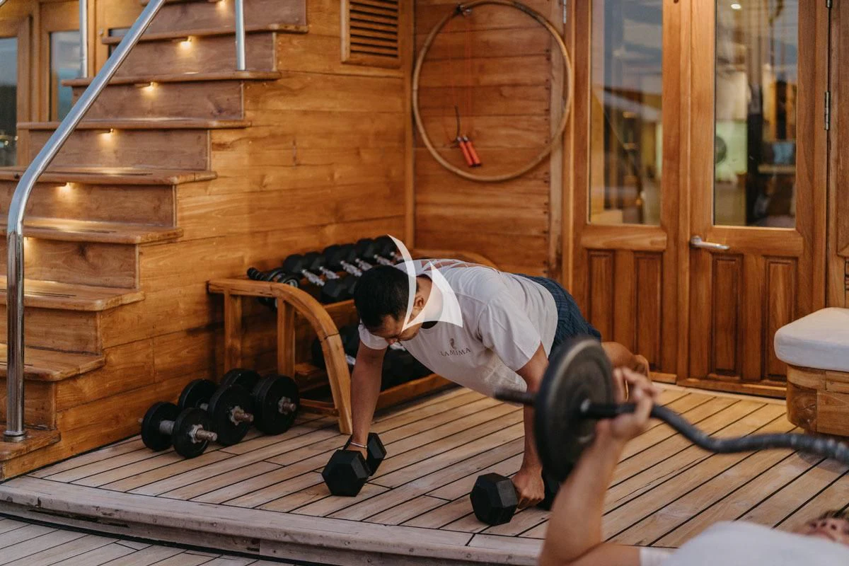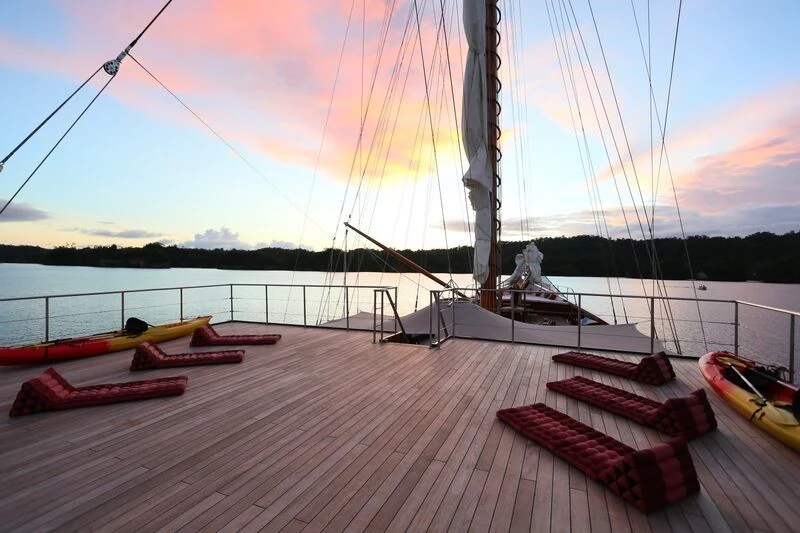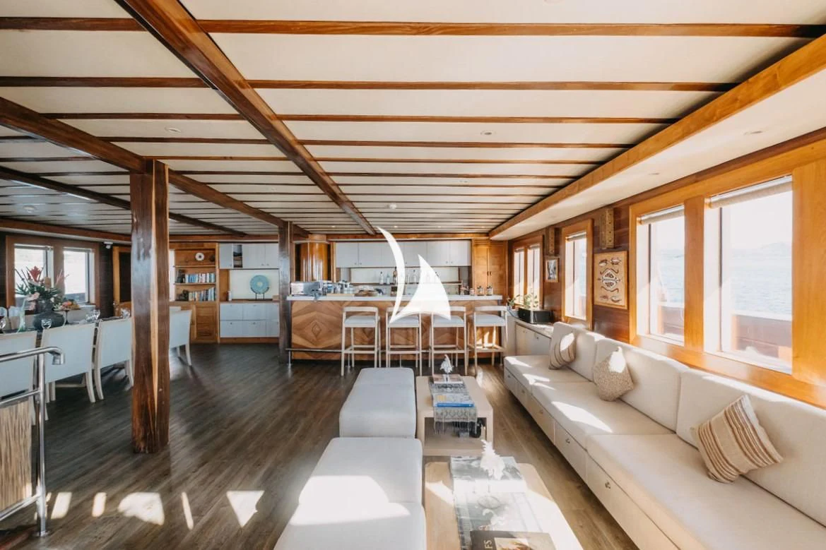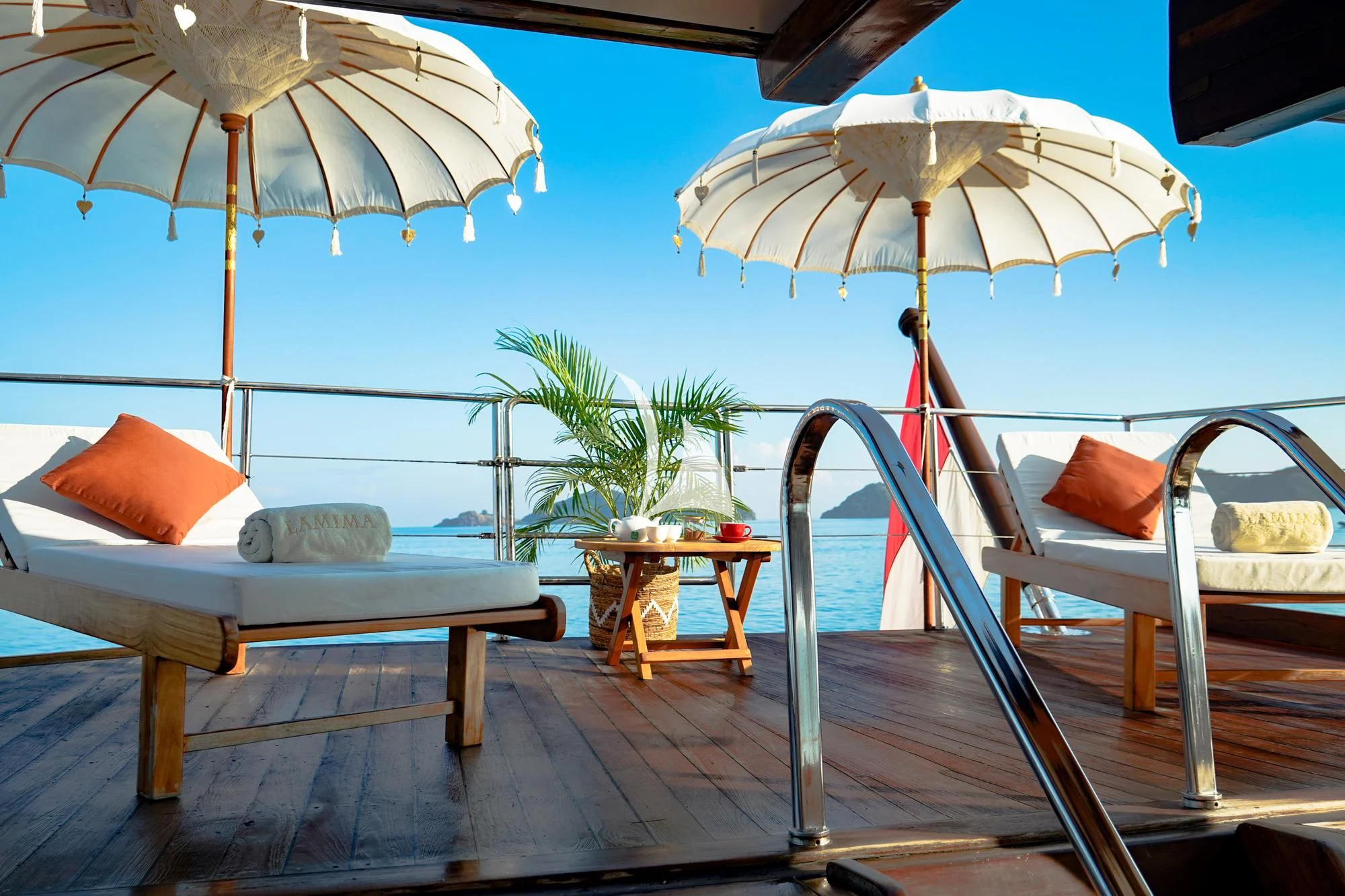 The exterior design of LAMIMA draws inspiration from traditional Indonesian Phinisi vessels, marrying heritage with contemporary style effortlessly. Her spacious sundecks are perfect for soaking up the sun or enjoying panoramic ocean views while sipping on your favorite cocktail. Alfresco dining areas provide an intimate setting for starlit dinners against the backdrop of serene waterscapes while various lounging areas offer ample space for relaxation and socializing.