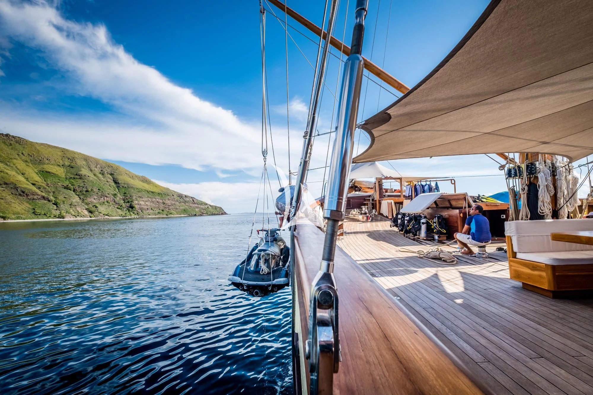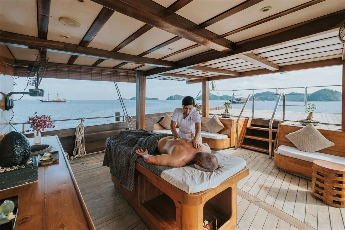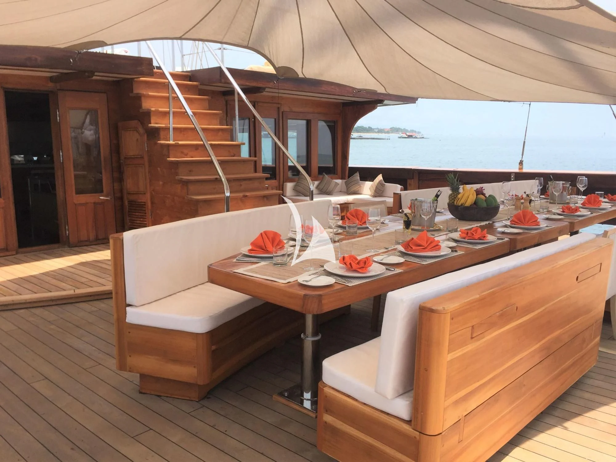 The exterior design of LAMIMA draws inspiration from traditional Indonesian Phinisi vessels, marrying heritage with contemporary style effortlessly. Her spacious sundecks are perfect for soaking up the sun or enjoying panoramic ocean views while sipping on your favorite cocktail. Alfresco dining areas provide an intimate setting for starlit dinners against the backdrop of serene waterscapes while various lounging areas offer ample space for relaxation and socializing.