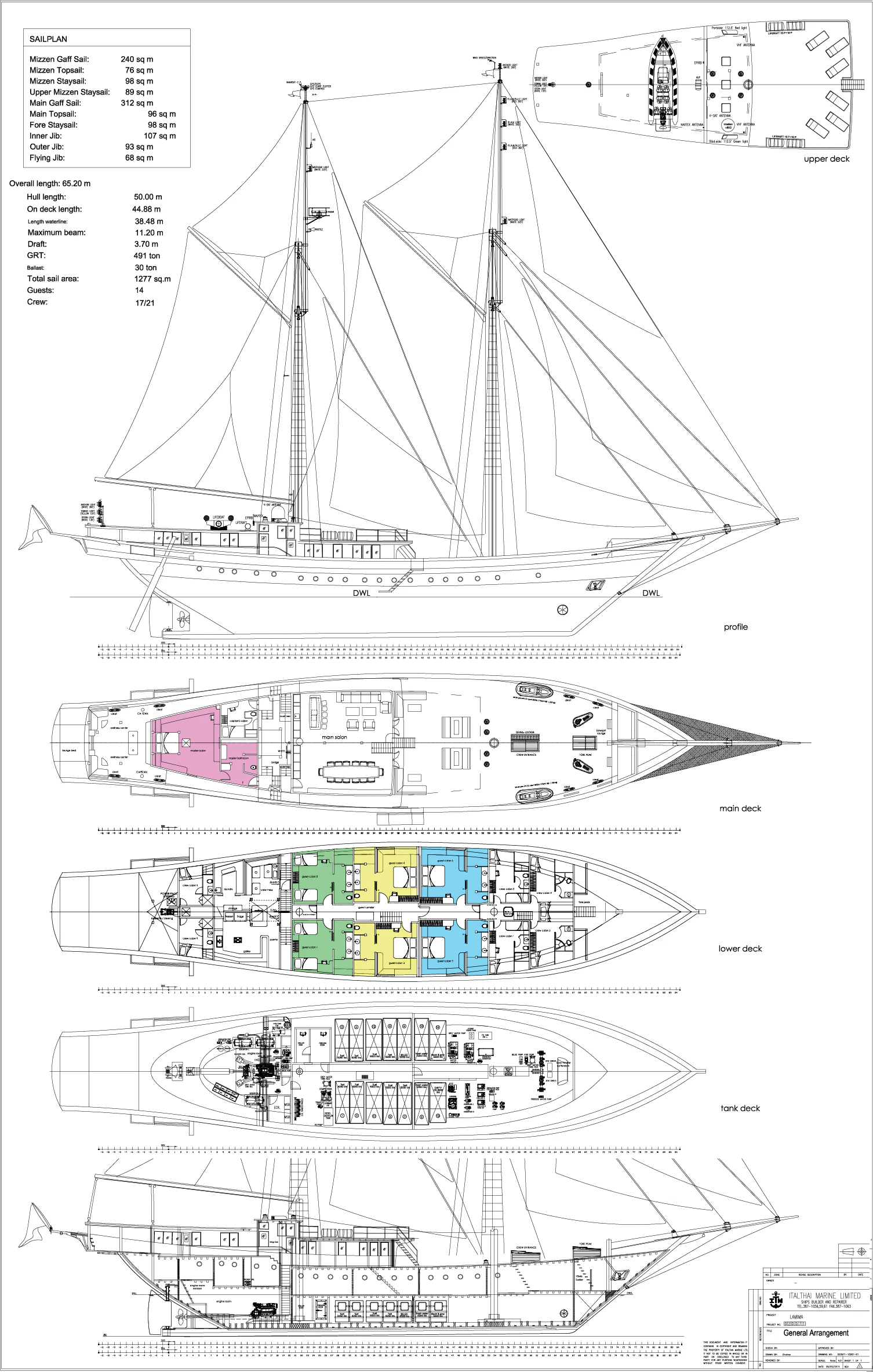 Behold the LAMIMA, a majestic symbol of nautical elegance and tradition. Crafted by the skilled hands of Haji Baso in 2014, this custom sailing superyacht is an exquisite testament to timeless naval architecture and modern luxury. Spanning an impressive 213 feet (65.2 meters) in length with a beam of 36 feet (11.2 meters), she is a sight to behold on the open seas. With her wooden hull exuding rustic charm, she is as much a work of art as she is a feat of engineering.