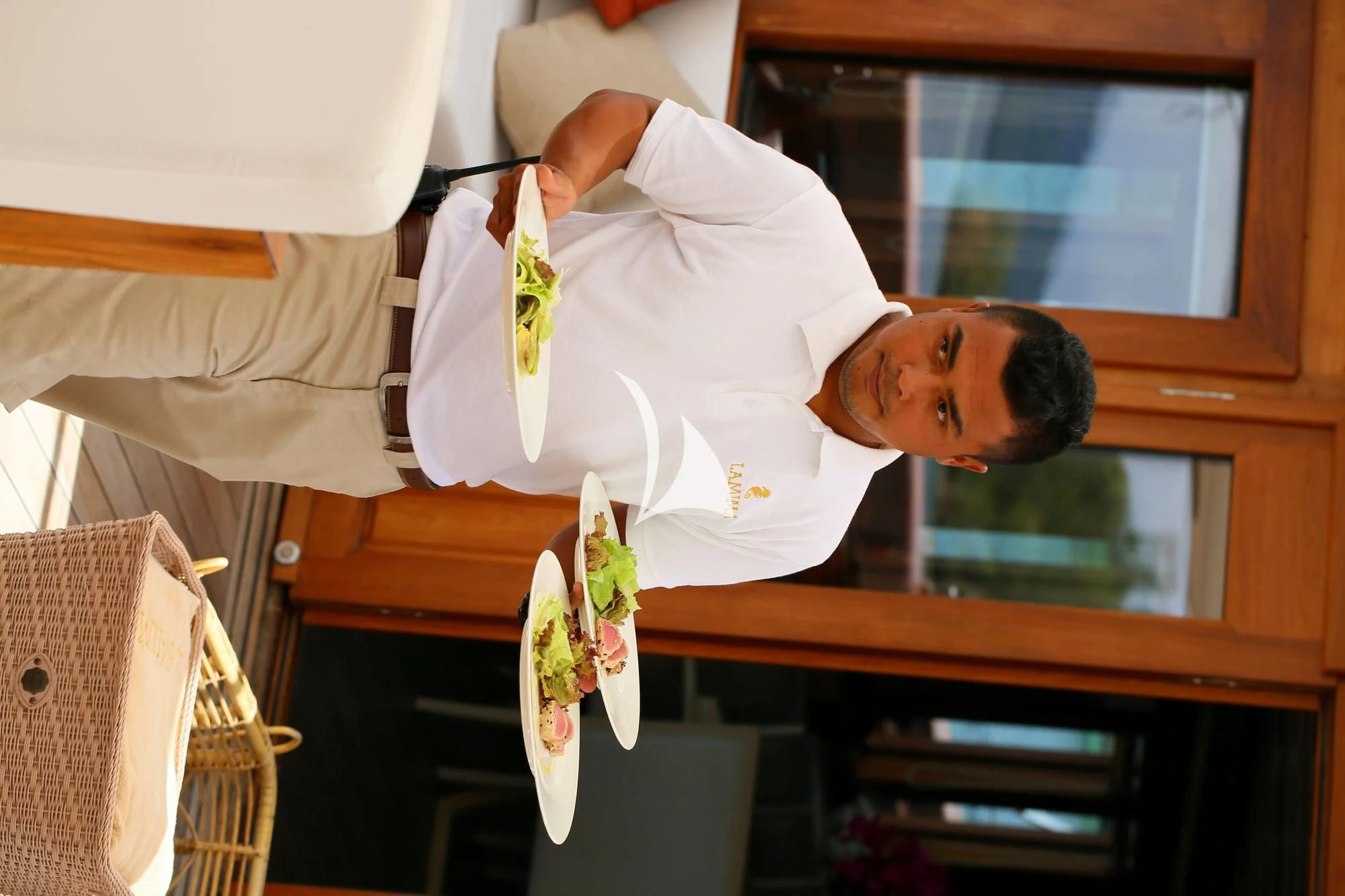 The main salon presents a grand social area adorned with plush furnishings where guests can unwind after a day filled with adventure or engage in lively conversations over evening drinks. Dining onboard LAMIMA becomes an experience unto itself; enjoy gourmet meals prepared by our expert chefs served at elegantly set tables under ambient lighting that sets the mood just right.
