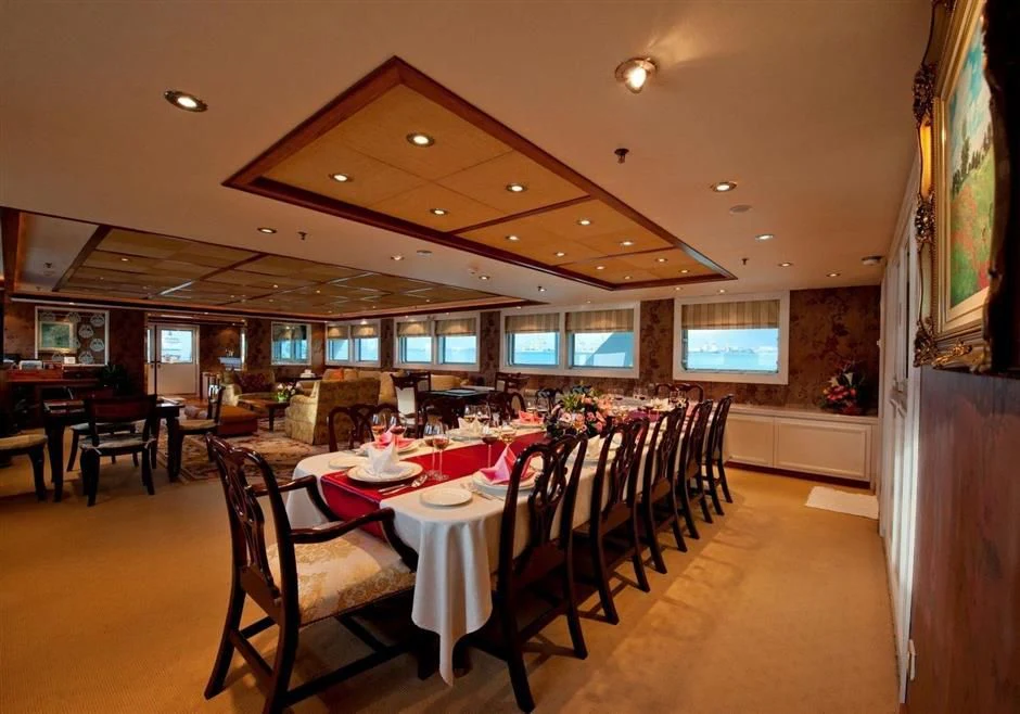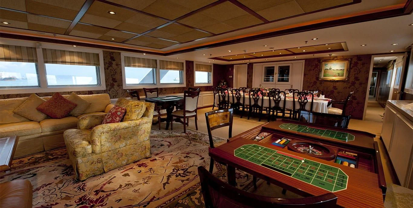 The main salon serves as an inviting social hub adorned with tasteful furnishings that reflect refined luxury at its finest. A separate dining area sets the stage for elegant dinners complemented by world-class service from a dedicated crew of thirteen members who ensure every journey aboard this yacht is unforgettable.